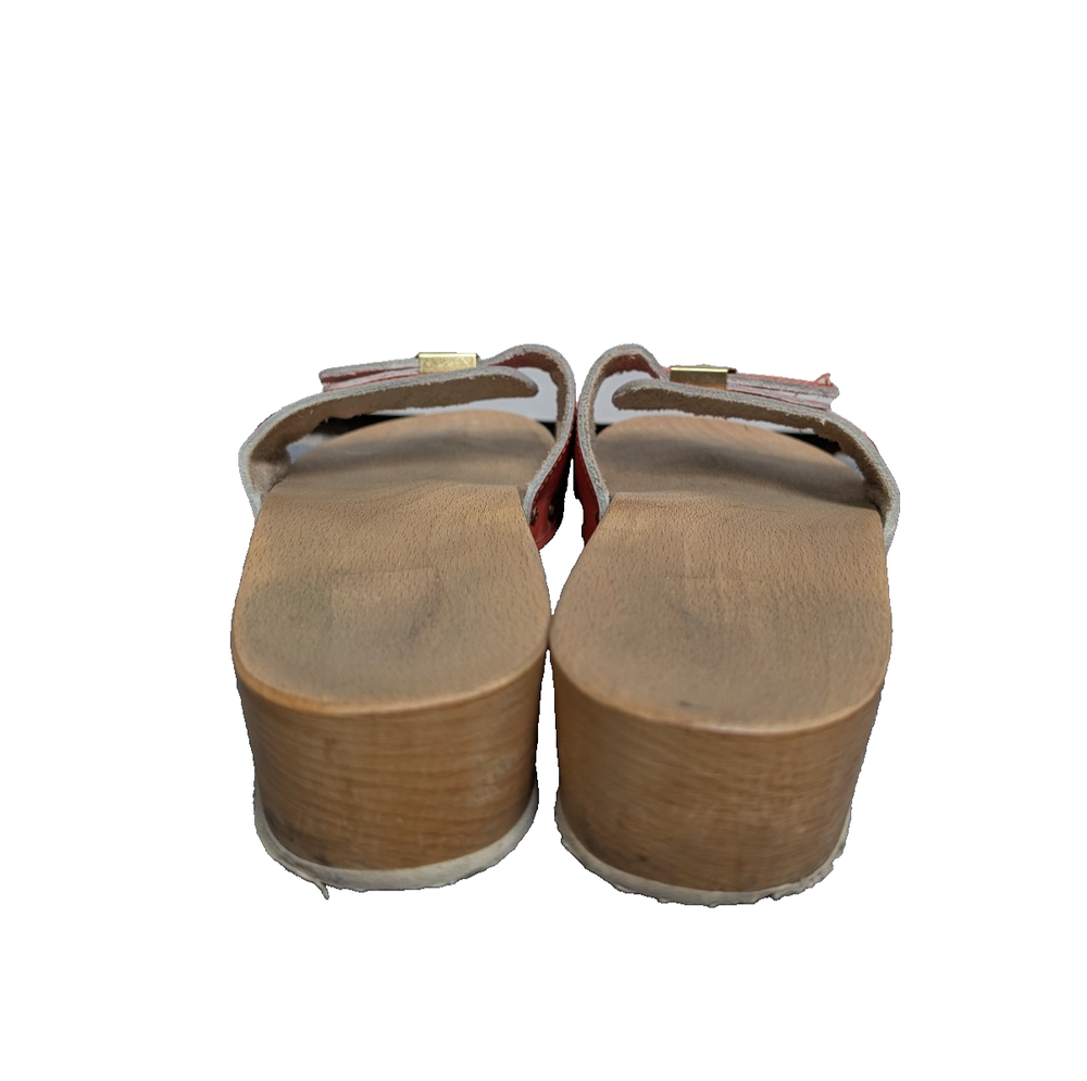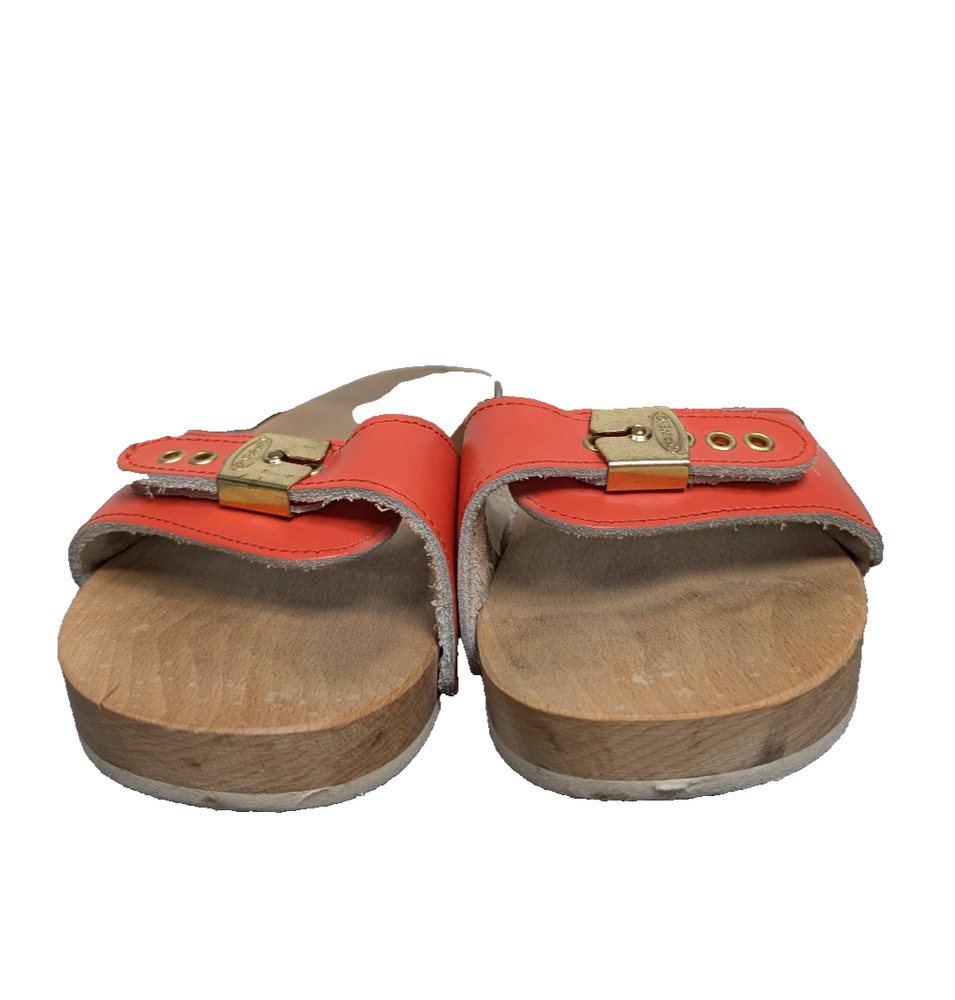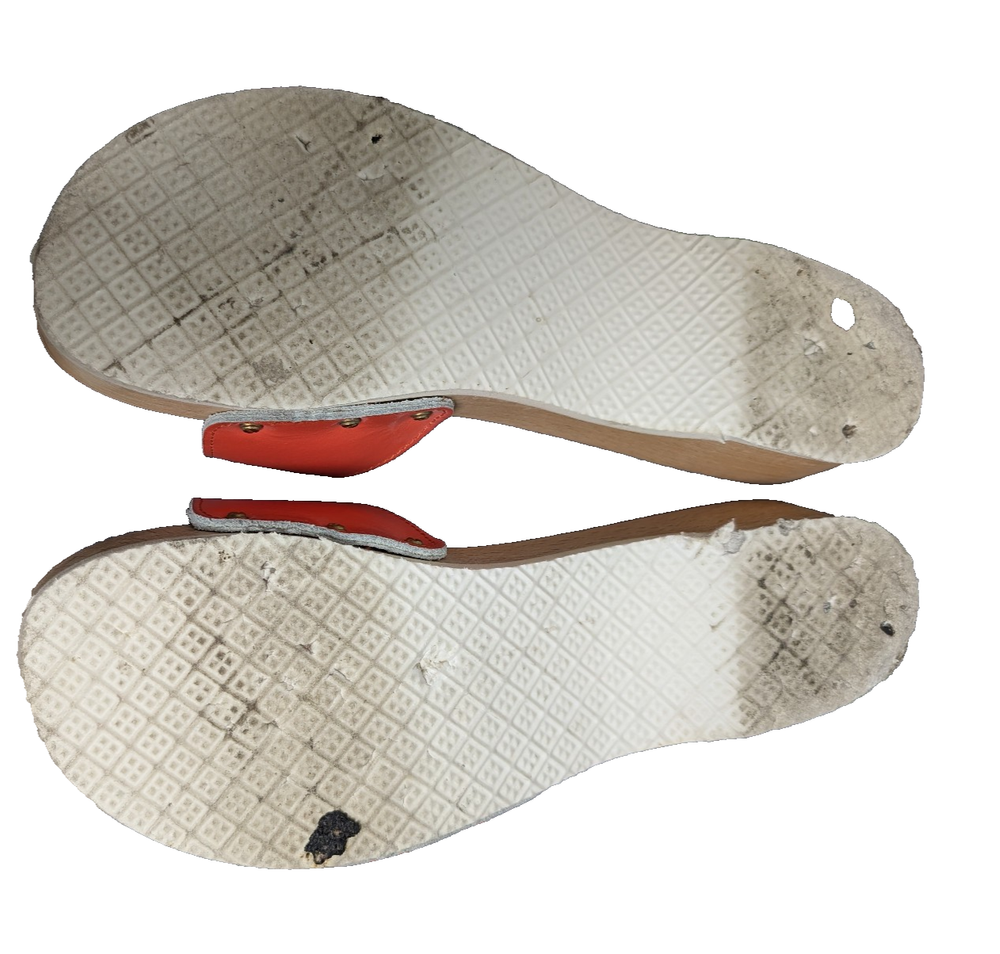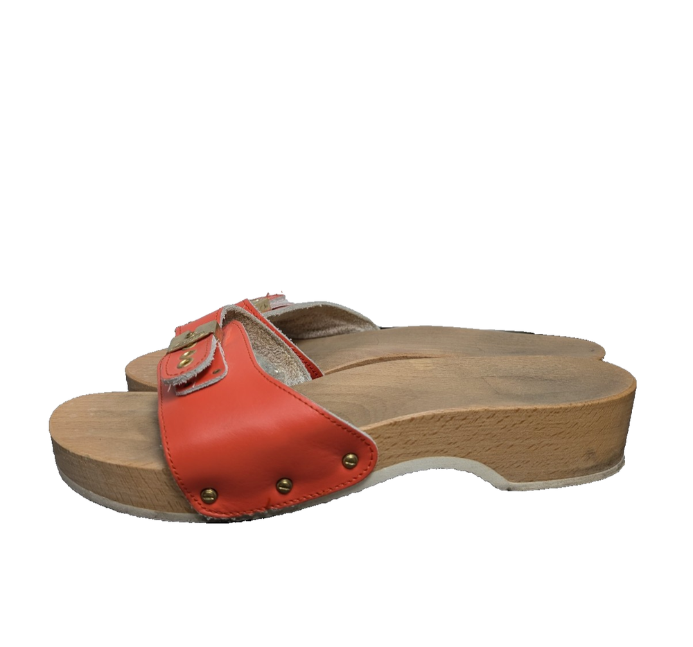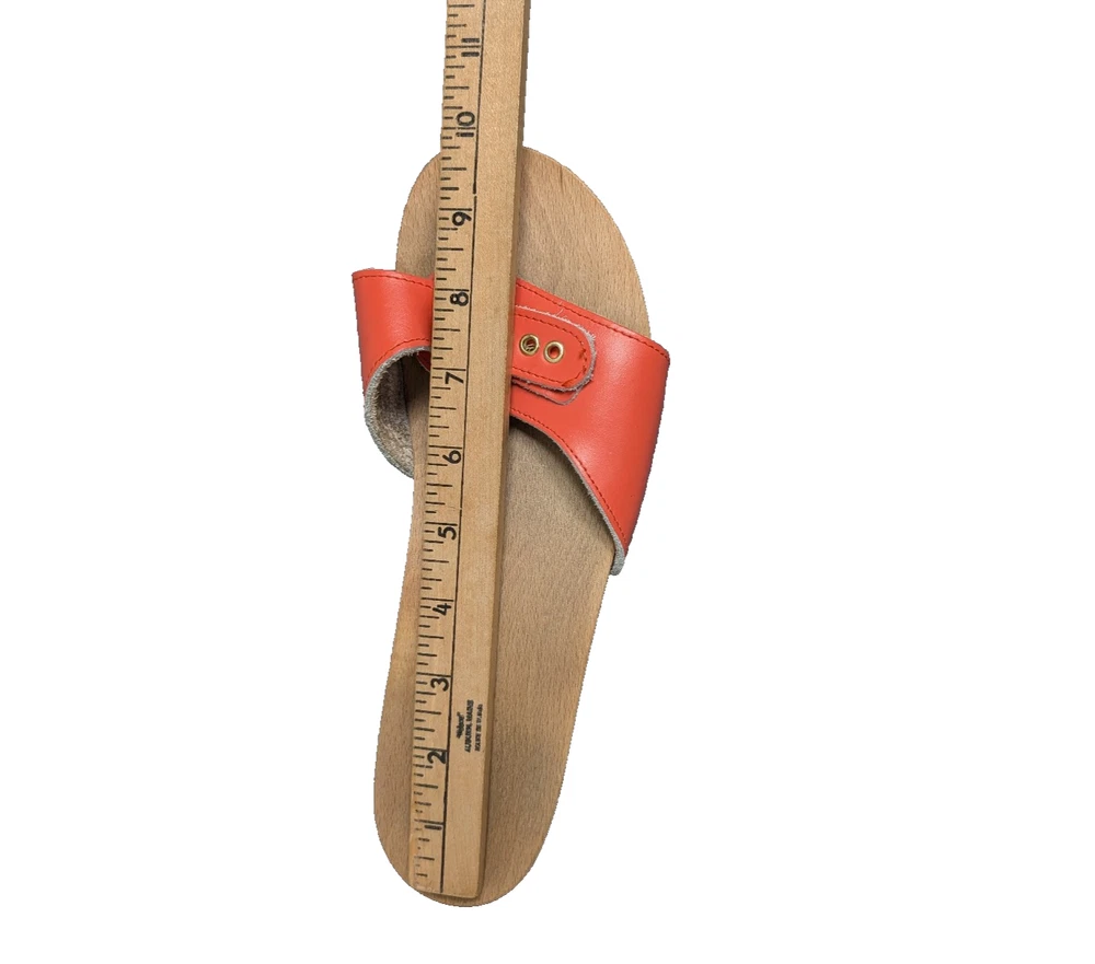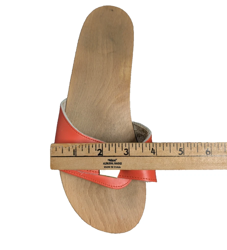 Department: Women Type: Sandals Style: Slide Color: Orange Upper Material: Leather Closure: Slip On Toe Shape: Open Toe Occasion: Casual, Travel, Everyday Features: Wooden Footbed, Comfort, Slip On Pattern: Solid Size is not marked—please refer to measurements if. Good used condition with visible wear on wooden footbeds and light wear on leather from normal use (see photos).