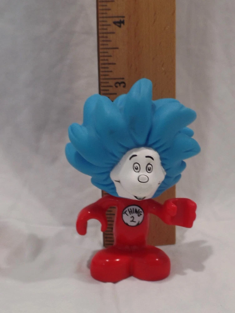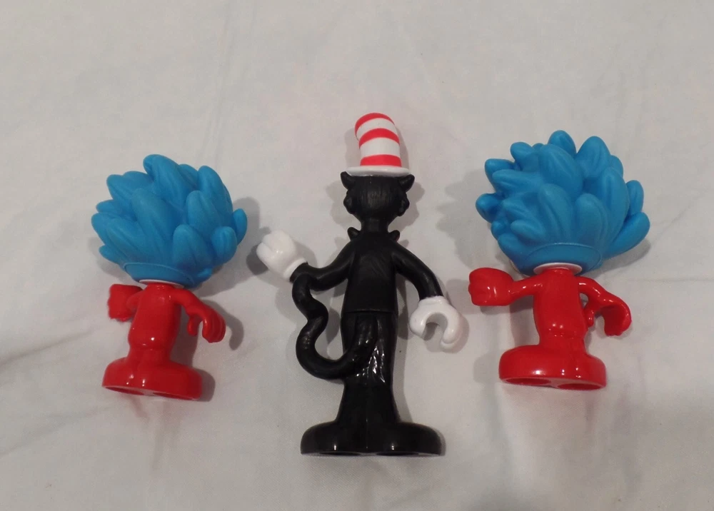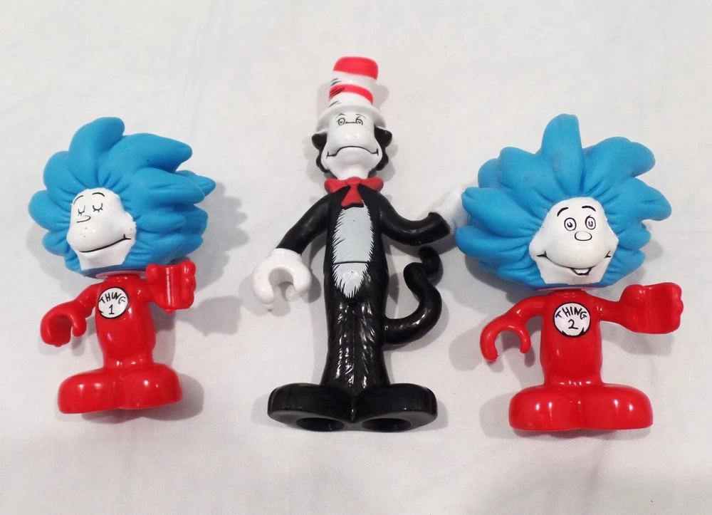 Mega Bloks Dr Seuss 4.25" Cat In The Hat, 3" Thing 1 & 2 Figures /Cake Topper Very Good Pre-Owned Condition. Great pieces for the Cat and the Hat enthusiast, or as replacement pieces for your Mega blok sets. Would be good for Cake decorations.