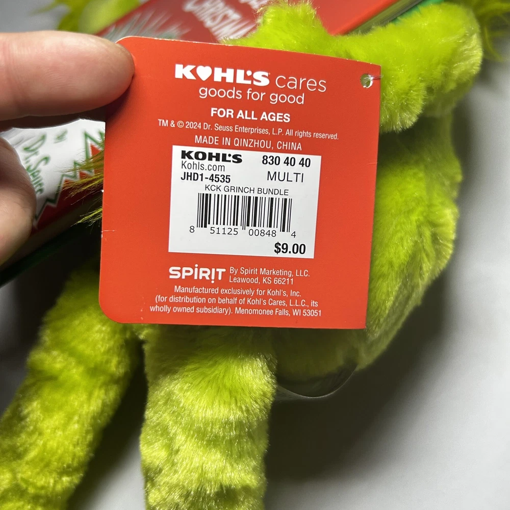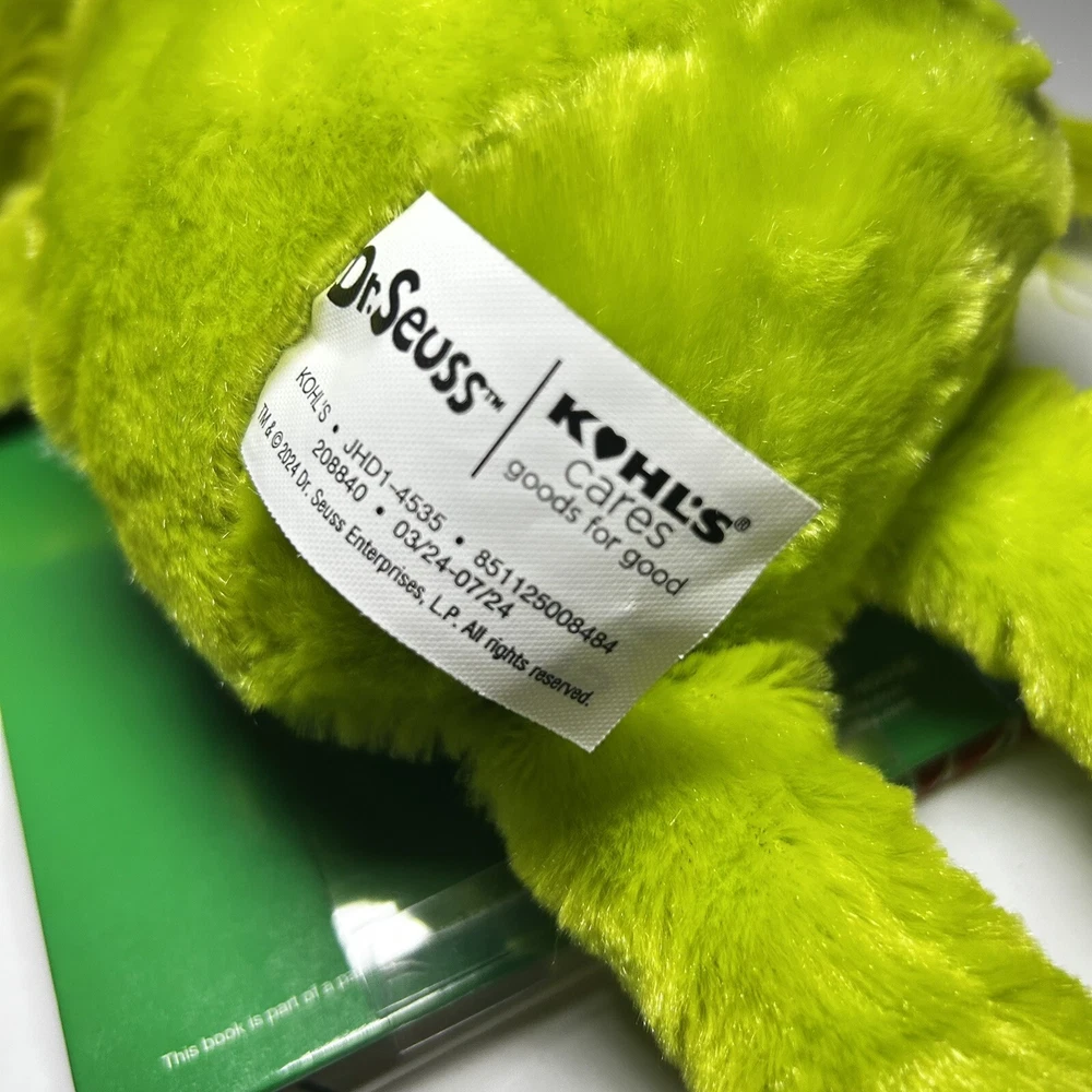 The product is a Dr. Seuss Book & Plush Bundle featuring How the Grinch Stole Christmas! The plush toy is from Kohl's Cares, small in size (14-24 inches), green in color, and part of the Character Family of Dr. Seuss. It was released in 2024 and is designed for the occasion of Christmas. The bundle includes both a book and a plush toy, making it a great gift for fans of Dr. Seuss.