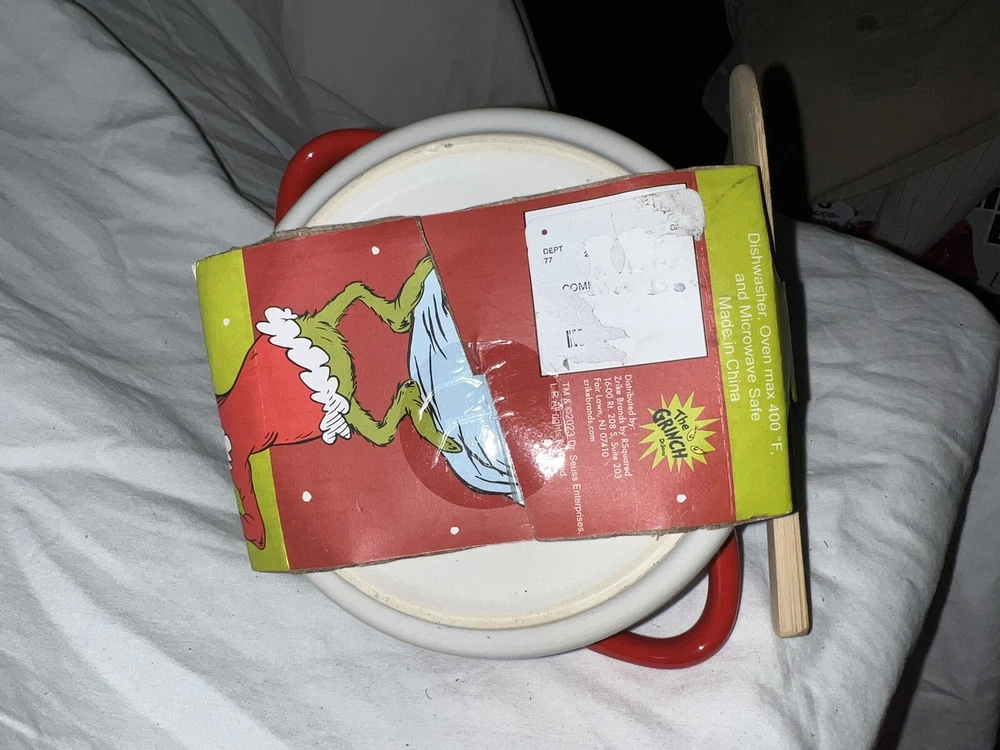 This collectible ceramic baking dish features the iconic character of The Grinch from Dr. Seuss' beloved book and TV show. The dish comes with a wooden spoon, perfect for stirring up delicious treats. The colorful design showcases the playful spirit of the franchise, making it a great addition to any collection. Crafted with care by Grinch Enterprises, this baking dish is sure to bring joy to any fan of Dr. Seuss. It's perfect for baking and serving your favorite holiday treats, or for display as a cherished piece of animation merchandise. Don't miss out on this unique and fun piece of Grinch history.