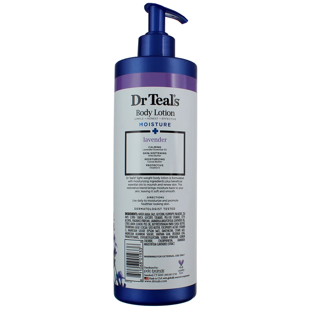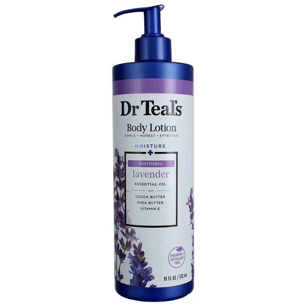 Product Description Dr Teal's wants to be an important part of your self-care routine. Our mineral-enriched therapies and treatments are infused with essential oils that relax, replenish and rejuvenate your mind and body. Slow down, take a moment, and allow the restorative effects of Dr Teal's help create a stronger you. Dr Teal's body lotion is formulated with moisturizing ingredients plus beneficial essential oils to nourish and renew skin. This restorative blend moisturizes your skin and soothes your senses. SOOTHING: Soothing lavender essential oil MOISTURIZING: Moisturizes your skin, calms and soothes the senses UNIQUE BLEND: Made with lavender essential oil, shea butter, cocoa butter, and vitamin E Ingredients Ingredients Water (Aqua, Eau), Glycerin, Isopropyl Palmitate, Zea Mays (Corn) Starch, Glycerin Stearate, PEG-100 Stearate, Cetyl Alcohol, Fragrance (Parfum), Lavandula Angustifolia (Lavender) Oil, Citrus Limon (Lemon) Peel Oil, Butyrospermum Parkii (Shea) Butter, Theobroma Cacao (Cocoa) Seed Butter, Tocopheryl Acetate (Vitamin E), Magnesium Sulfate (Epsom Salt), Dimethicone, Stearic Acid, Magnesium Aluminum Silicate, Xanthan Gum, Disodium EDTA, Phenoxyethanol, Ethylhexylglycerin, Sodium Hydroxide, Sodium Chloride, Chlorphenesin, Lavandula Angustifolia (Lavender) Extract. Instructions Use daily to moisturize and promote healthier looking skin. Product Description Dr Teal's wants to be an important part of your self-care routine. Our mineral-enriched therapies and treatments are infused with essential oils that relax, replenish and rejuvenate your mind and body. Slow down, take a moment, and allow the restorative effects of Dr Teal's help create a stronger you. Dr Teal's body lotion is formulated with moisturizing ingredients plus beneficial essential oils to nourish and renew skin. This restorative blend moisturizes your skin and soothes your senses. SOOTHING: Soothing lavender essential oil MOISTURIZING: Moisturizes your skin, calms and soothes the senses UNIQUE BLEND: Made with lavender essential oil, shea butter, cocoa butter, and vitamin E Ingredients Ingredients Water (Aqua, Eau), Glycerin, Isopropyl Palmitate, Zea Mays (Corn) Starch, Glycerin Stearate, PEG-100 Stearate, Cetyl Alcohol, Fragrance (Parfum), Lavandula Angustifolia (Lavender) Oil, Citrus Limon (Lemon) Peel Oil, Butyrospermum Parkii (Shea) Butter, Theobroma Cacao (Cocoa) Seed Butter, Tocopheryl Acetate (Vitamin E), Magnesium Sulfate (Epsom Salt), Dimethicone, Stearic Acid, Magnesium Aluminum Silicate, Xanthan Gum, Disodium EDTA, Phenoxyethanol, Ethylhexylglycerin, Sodium Hydroxide, Sodium Chloride, Chlorphenesin, Lavandula Angustifolia (Lavender) Extract. Instructions Use daily to moisturize and promote healthier looking skin. Disclaimer The product descriptions and instructions provided by Vitabox are for informational purposes only and are qualified in their entirety by the information available from manufacturers of the products. You should carefully read all product packaging, and contact the manufacturer with any questions before using a product. While we endeavor to ensure that product descriptions are current, manufacturers sometimes change their products. We are not liable for inaccuracies or misstatements about products. We do not provide medical advice or recommendations. You should not use the information provided by Vitabox for diagnosing or treating a health problem or disease. If you have or suspect that you have a medical problem, immediately contact your health care provider. Information and statements regarding dietary supplements have not been evaluated by the Food and Drug Administration or any other government agency and are not intended to diagnose, treat, cure, or prevent any disease.
