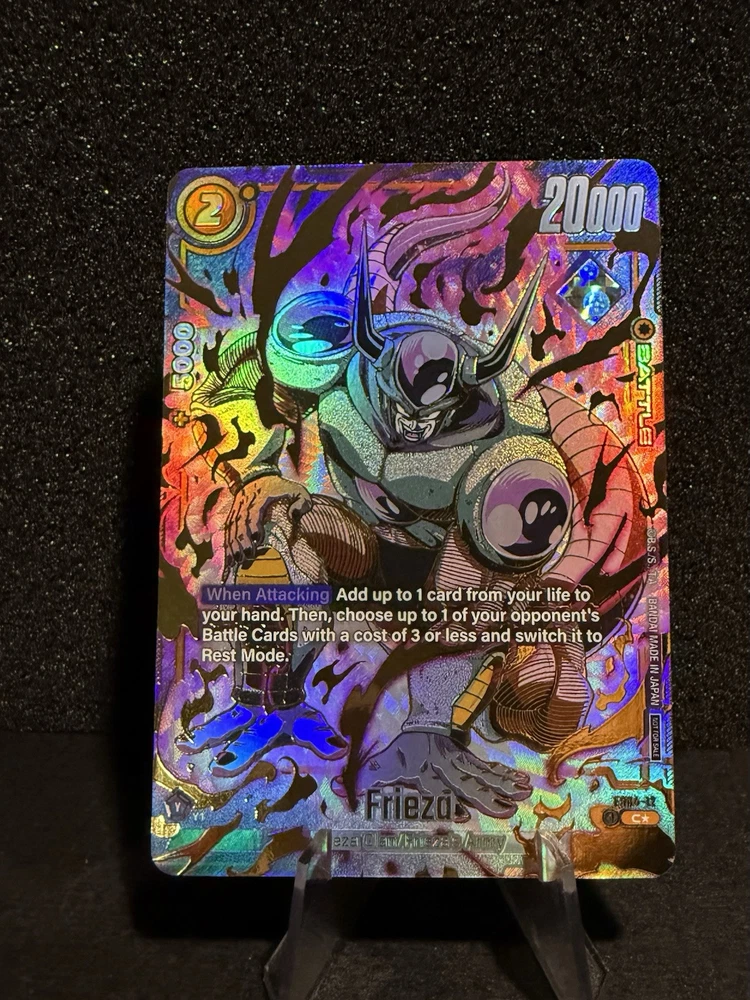 The Dragon Ball Fusion World - Frieza card is a special edition card from the Dragon Ball Super Card Game. It features alternative and full art of the characters Frieza and Son Goku in a fusion form called Dragon Ball. This yellow-colored Fusion card with a holographic surface effect is part of the Ultimate Battle Vol. 1 Top 8 collection, manufactured by Bandai in Japan for players aged 6 and above. The card, numbered FS04-12, is made of cardboard and is in English language.