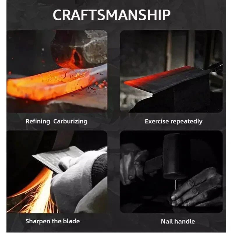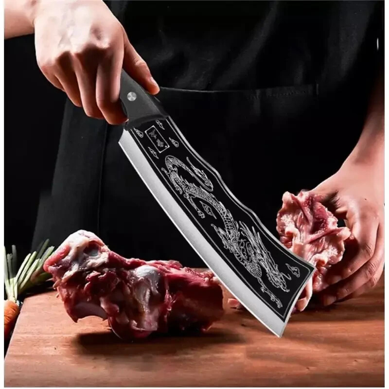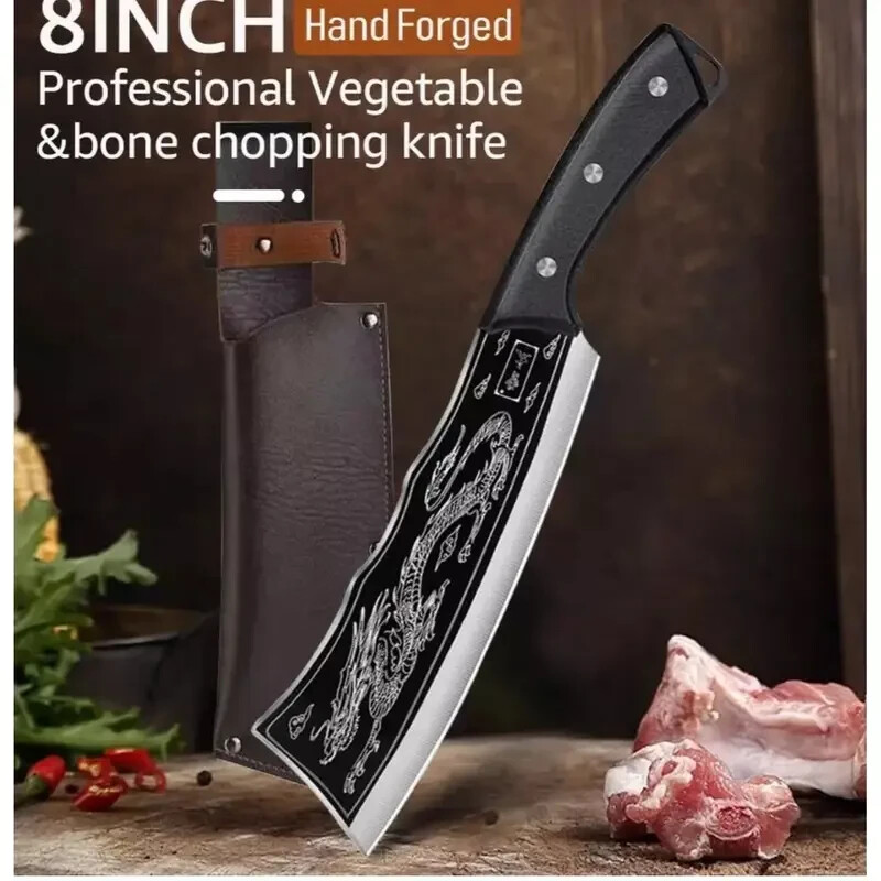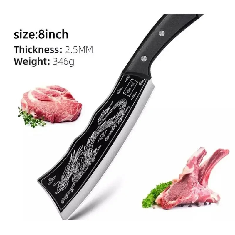 Upgrade your cutting tools with this 8-Inch Full Tang Kukri Knife , expertly designed for professional chefs, outdoor enthusiasts, and collectors alike. Featuring a stunning engraved dragon pattern and hand-forged craftsmanship, this knife excels in both performance and aesthetics. Key Features: πͺ Razor-Sharp Handmade Blade Forged from high-quality AUS-8 and 4CR13C steel with 62HRC hardness for exceptional edge retention and effortless sharpening. π Unique 3D Dragon Carving Finely hand-engraved blade surface delivers an elegant touch while maintaining a smooth texture. π Ergonomic Full Tang Handle Triple-riveted design ensures superior grip, balance, and long-lasting durability for heavy-duty chopping. π Multipurpose Use Perfect for chopping vegetables, cutting through bone, or outdoor tasks like camping, BBQ, and hiking. π§³ Protective Leather Sheath Included Stylish and secure storage for safe carrying and convenient access wherever you go. Specifications: Blade Length: 8 inches Thickness: 2.5 mm Weight: 346 g Material: AUS-8 Steel / 4CR13C Steel Hardness: 62HRC Handle: Full Tang Ergonomic Design Ideal For: Chefs, hunters, hikers, BBQ lovers, and collectors seeking a high-quality, multi-functional blade with cultural flair.
