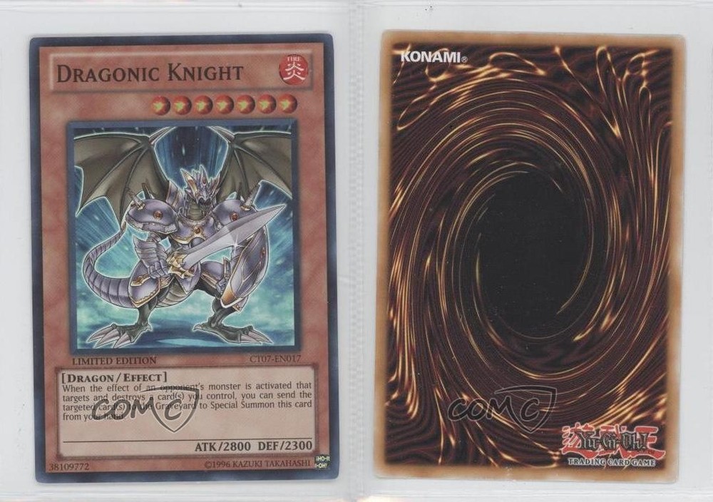 2010 Yu-Gi-Oh! Series 7 - Collectors Tins Limited Edition Promos #CT07-EN017 Dragonic Knight COMC Item: 10942482 - YuGiOh Card - Featuring Dragonic Knight Search for more: 2010 Yu-Gi-Oh! Series 7 Search for more: 2010 Yu-Gi-Oh! Series 7 - Collectors Tins Limited Edition Promos View all of our Listings Auctions Buy It Now About Us Located in the beautiful Pacific Northwest, COMC (Check Out My Cards) is the world's largest consignment service for trading card singles. More than 10,000 people have used our consignment service to list over 50 million trading cards. Find out how we can help you consign your items on eBay by contacting us through eBay messaging. COMC -- "The Safe & Easy Way to Buy & Sell" Raw Condition for Modern Cards Unless otherwise noted, raw modern cards are listed in Near Mint-Mint condition or better. A NM-MT card appears to be Mint at first glance, but upon closer inspection, may exhibit some of the following: minor print defects (e.g. roller marks, print line, dimple), minor scratches, slight edge wear, and slight corner wear. Centering is clearly visible in the images provided and does not factor into our condition assessment. Raw Condition for Vintage Cards Unless otherwise noted, raw vintage cards are listed in Excellent condition or better. An EX card may exhibit some of the following: minor rounding of corners, surface wear, print defects, light scratches, and slight edge wear/chipping. Centering is clearly visible in the images provided and does not factor into our condition assessment. Domestic Shipping Combined shipping for multiple items is available. To receive combined shipping, please ensure all desired items are in your eBay shopping cart before proceeding to checkout. eBay limits orders to 40 items per order. We automatically combine multiple orders placed on the same day. If you place multiple orders on the same day, please contact us to request a refund of applicable shipping costs. Signature confirmation may be required on invoices over $400. All cards are protected and shipped securely. International Shipping COMC offers eBay's International Shipping (EIS) for international orders under $2,500* (see country exceptions below). All duties and import fees are paid at checkout; in the rare event that there are additional import fees upon delivery, these are borne by the buyer. EIS packages route through a shipping hub in Erlanger, KY before shipping to their final destination. Please note that EIS does not allow for combined shipments. The shipping rates are determined by eBay and cannot be adjusted. *Maximum sale price exceptions: Colombia, Kuwait ($2,000); Taiwan ($1,539); Chile, Costa Rica, Guatemala, Honduras, Trinidad and Tobago ($1,000); Antigua and Barbuda, Aruba, Belize, Dominica, Grenada, Philippines, Saint Kitts and Nevis, Saint Lucia, Montserrat, Turks and Caicos Islands ($500); Dominican Republic, El Salvador ($200). Please request a shipping quote through eBay messaging for orders that exceed the maximum sale price supported by eBay's International Shipping. You will be responsible for all duties and import fees for international orders shipped outside the EIS. All cards are protected and shipped securely. Payment COMC does not accept offers on our cards through our eBay storefront. COMC utilizes eBay’s managed payments system. If you are experiencing difficulties making a payment, please contact eBay for assistance. Return Policy Returns are only accepted on the rare occasion the item is not as described. If you are making a return, please initiate the return process through eBay so a mailing label can be provided for you. Prior to listing, our expert team carefully assessed this item to represent it accurately. Please review the description and high-definition images prior to purchasing to ensure this item meets your satisfaction. We welcome you to contact us if you have further questions about this item. Trust and Integrity COMC carefully assesses each item consigned to us to prevent fraudulent items from entering the marketplace. If you believe an item offered on COMC may be fraudulent, please contact us with details so we can investigate the issue. Items we determine are outside our supported items policy may be removed. Last Modified: 6/17/2025 5:07:13 PM PDT