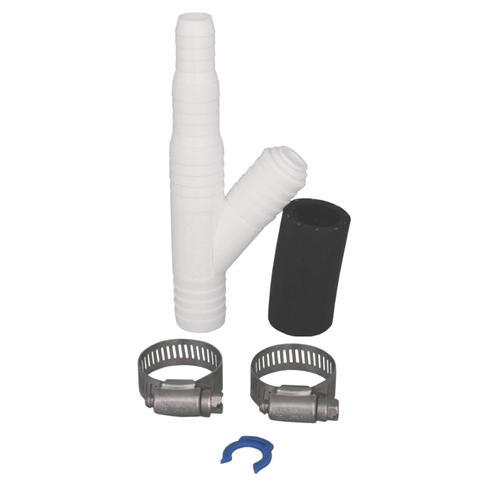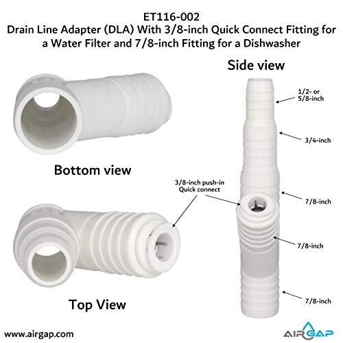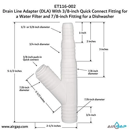 The ET116-002 universal drain line adapter connects dishwasher drain outlet and RO drain line to garbage disposal. The ET116-002 provides a secure and code compliant connection to the garbage disposal drain line. The ET116-002 has a 7/8-inch outlet with all garbage disposal units and is connected using provided 7/8-inch coupler hose. The inlet of the ET116-002 provides multiple barb connections to accommodate 1/2, 5/8, 3/4, and 7/8-inch hoses to accommodate any dishwasher outlet hose diameter. The ET116-002 is made from durable plastic with a barbed end that can be easily cut to accommodate multiple hose sizes. If the RO port is not used, it can be plugged with a 3/8-inch plastic dowel. The ET116-002 comes with all necessary parts for a quick and easy installation. That includes coupler hose, stainless steel clamps, and the user guide. The design of the ET116-002 DLA eliminates RO gurgling sounds and provides a legal way to connect the RO system to drainage. The ET116-002 line adapter is listed by UPC and tested for compliance with IPC and NSF standards. ❤ SIMPLE INSTALLATION: The ET116-002 is designed for connecting dishwasher and reverse osmosis (RO) filter to a garbage disposal line. Its dishwasher connector accommodates various inside diameter (ID) dishwasher hoses (1/2, 5/8, 3/4, or 7/8-inch). Its reverse osmosis 3/8-inch push-in connector fits 3/8-inch RO poly tubing. A hose coupler and clamps are provided for a secure connection to the garbage disposal inlet. The ET116-002 installation enables plumbing pipes to stay intact. ❤ DRAIN LINE CONNECTION: The ET116-002 enables the connection of the RO water filter to a garbage disposal with a dishwasher. Installing the ET116-002 is simple and allows bypassing the existing plumbing but with no pipes to undo. ❤ QUIET OPERATION: The ET116-002 is designed to eliminate most reject water noise. It is also equipped with a self-cleaning port. ❤ CERTIFICATION: The ET116-002 is legal to install in any state. It is UPC (Uniform Plumbing Code) Listed, IPC (International Plumbing Code), and NSF (National Sanitation Foundation) tested. These certifications assure that ET116-002 is safe to use. The testing is conducted for every manufactured lot to ensure consistent performance.