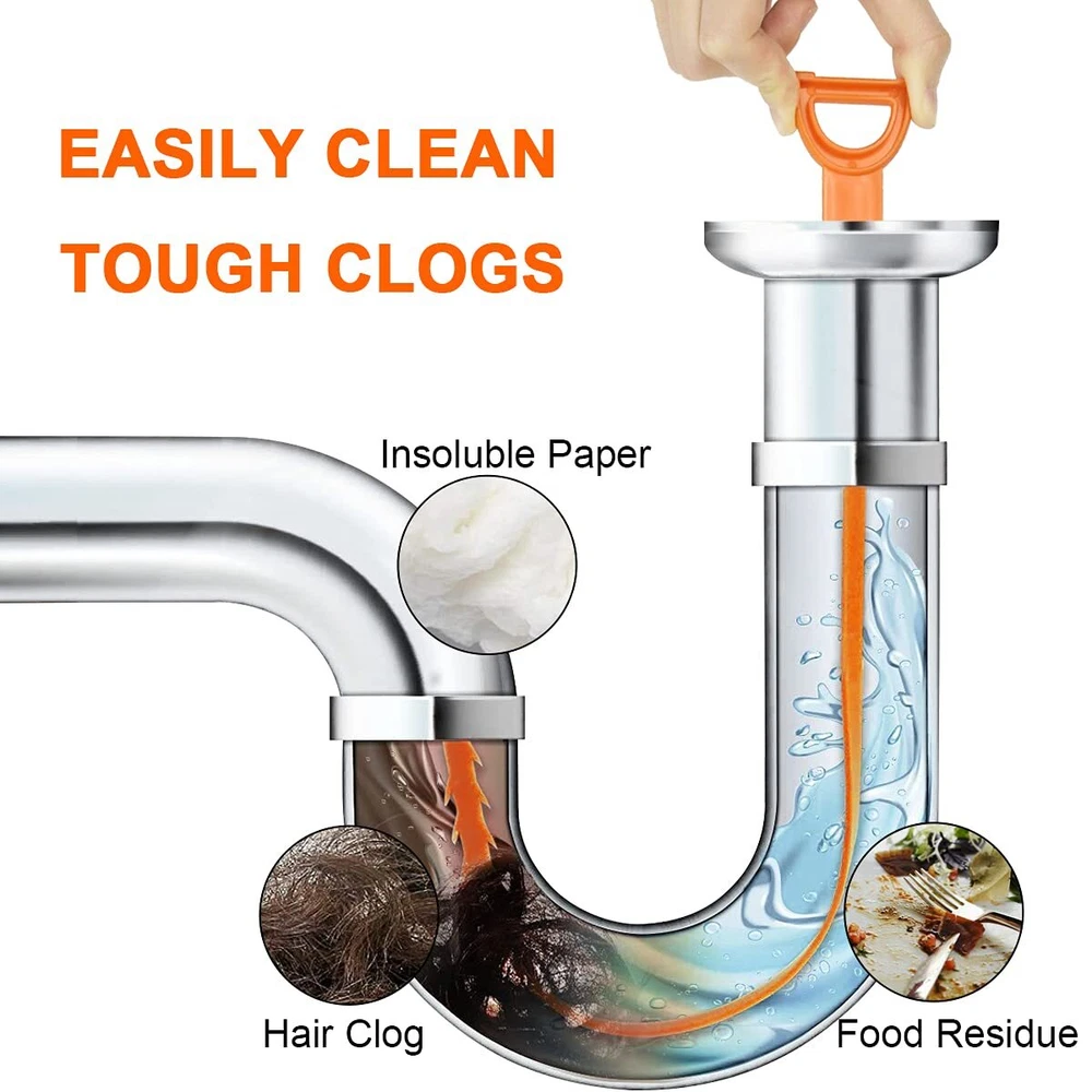 3 Pack of Sink Snake Hair Drain Clog Remover Here's your perfect cleaning Tool in getting rid of slow running sink. This snake-shape drain cleaning tool, a plastic device, no-hassle cleaning of sink and bathtub drains which are frequently obstructed by hair and dirt. This drain cleaner is flexible enabling it to clean hard-to-reach sink pipes. An amazing sink cleaning wand and must-have for every home to make your drains drain quickily again. Features: Drain hair removal cleaner hook Quick & easy way to clear slow-moving or clogged drains With tiny hooks for hooking up hair clogs to remove and free the drain instantly A loop at the end of the drain hair catcher is designed for easy handling to remove clogs, hairs etc. Simple to use: just insert the device into a pipe/drain, circle, then pull out Many uses for bathrooms, sinks, tubs, dredge pipe, drain, sewers, etc. ❤Soft & Flexible Barbed wand: 3Pcs * 25 inch Soft enough to bend in many kinds of strainers and pipes, the flexible barbed wand could easy to hook the hair and debris ❤Soft Material Design— The drain snake hair clog remover is made of ABS material, which is tough and flexible, and can quickly pick up hair and clear the sink. Drain clog remover is flexible enough to bend various filters and P-shaped trap pipes. ❤Easy operate:Simply hold the handle ring of the drain snake unblocker, insert it, pull up and down and rotate 2-3 times to clear the blockage. Snake drain cleaner will not pinch your hand during operation and can be easily and safely flushed out. ❤Environmental and Reusable—Plastic shower drain unblocker is an excellent drainage tool for kitchen sinks, toilets, washbasins, baths and drains. sink unblocker is reusable than chemical drain cleaners and is recyclable, making it practical and affordable! ❤Wide Application: Great Drain Auger Cleaner Tool Set for kitchen sink, toilets, washbasin, bathtubs, and sewers,flexes at P-trap where most clogs occurred