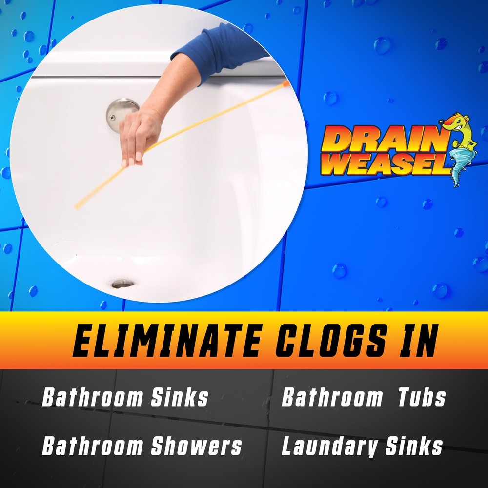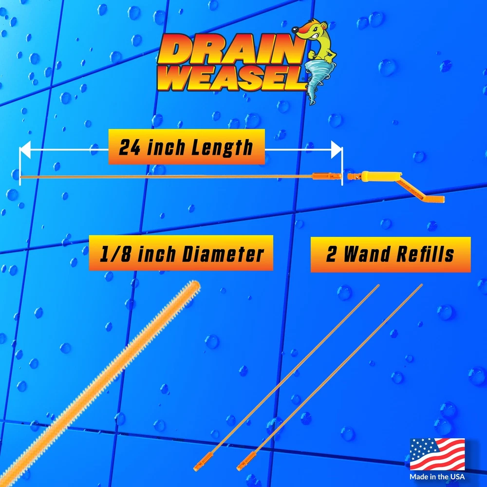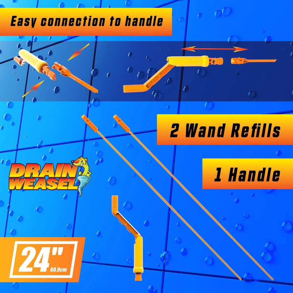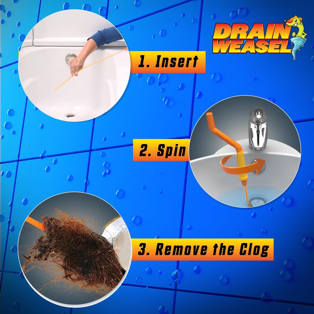 UNBLOCK CLOGGED DRAINS FAST – Say goodbye to pesky hair clogs that block your sinks, showers, and tubs. Let our Drain Weasel drain cleaner take the stage by promptly eliminating hair clogs, and removing hair, film, and grime instantly. PATENTED DESIGN – With a distinctive 360° rotation, the impossible now becomes achievable with our 24-inch long drain snake cleaner. Featuring patented micro-hooks, it locks into hair, filth, and grime without damaging your pipes or catching on drain parts. PULL THE GUNK OUT INSTANTLY – Never again do you need to go through the hassle of dismantling your drain pipes to unclog them. The Drain Weasel drain pipe cleaner pulls out the gunk to have your drain up and running in no time. DISPOSABLE WANDS FOR EASY CLEAN UP – No need to clean – just dispose of used wands effortlessly. Includes 2 wands and a reusable handle. EASY TO USE – The best part of our drain snake clog remover? You don't need to be a plumbing expert to use it! With just three easy steps, your drain will be free-flowing in no time. First, insert the wand, then rotate the handle, and finally, remove the clog.