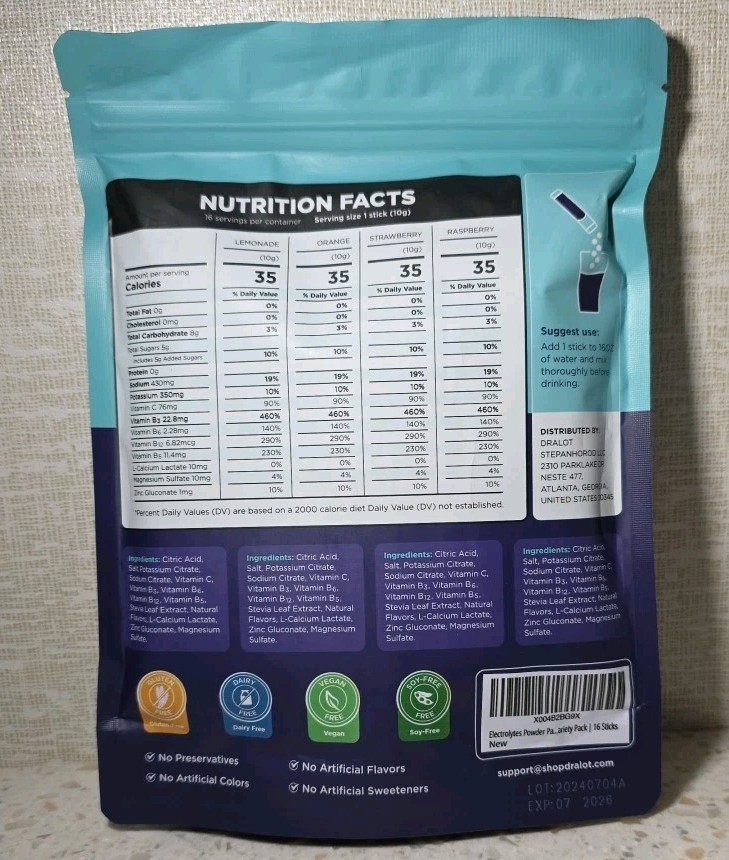 Dralot Electrolytes Drink Mix 16 On-the-go Sticks Variety Pack 4 Raspberry 4 Orange 4 Lemonade 4 Strawberry 16-0.35 oz (10 g) Sticks Net wt 5.64 oz / 160 g Exp. Date: 07/2026 NEW & sealed