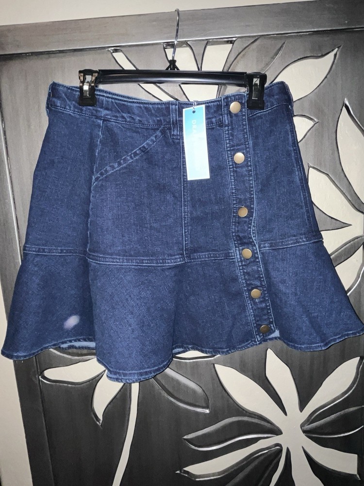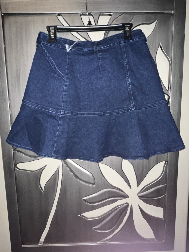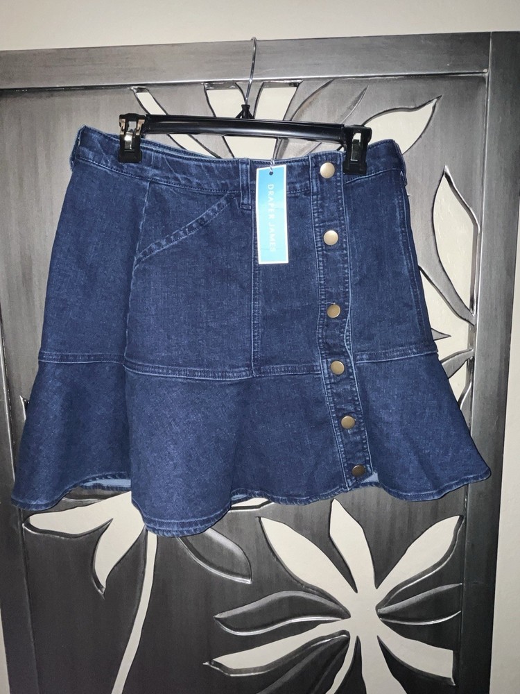 The Draper James Button Front Dark Denim Skirt in size 10 is a stylish and versatile addition to any woman's wardrobe. Made from durable denim with a dark wash, this skirt features a button front closure and front pockets for added style and functionality. Perfect for casual occasions in the warmer seasons, this skirt is easy to care for with its machine washable fabric and stretch for comfort. The classic blue color and mid-rise fit make it a timeless piece that can be dressed up or down for any event.