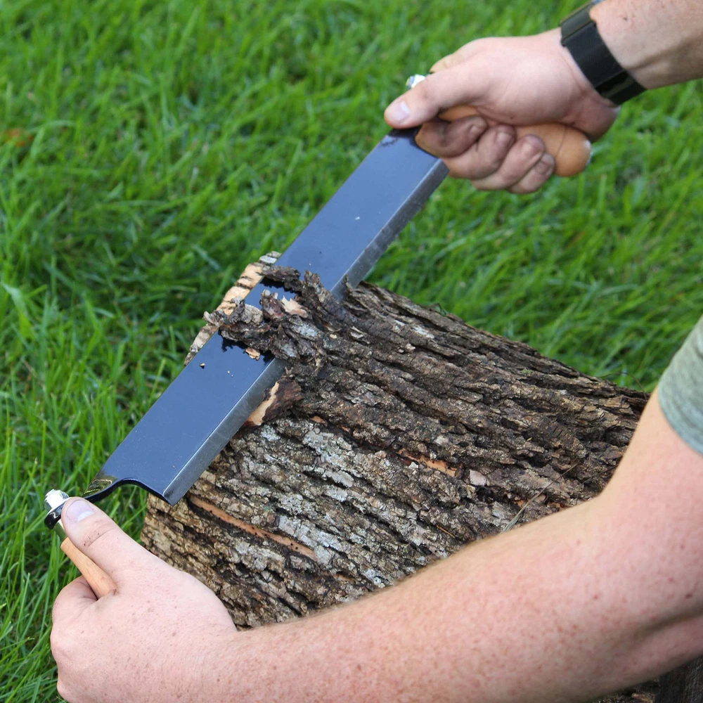 Use the | 13 Inch Straight Drawing Knife for Woodworking Tree Bark Removal Tool to remove bark quickly from logs and fence posts or to shape surfaces to create legs, seats, bowls, and more. These debarking knife draw shaves are designed for maximum strength and longevity. Dual wooden handles allow you to maintain a comfortable, secure hold for better control and accuracy, while the sharp steel blade features a refined beveled edge that easily slices through the wood. This lightweight pull knife woodworking draw shave tool is often used by timber framers, wood turners and carvers, and furniture fabricators for their dependability and maneuverability. Warning: This product can expose you to chemicals which is [are] known to the State of California to cause cancer and birth defects or other reproductive harm. WOOD WORKING TOOLS FOR BUILDING FURNITURE: Rapidly remove wood and bark from logs, fence posts, and firewood with the | 13 Inch Straight Wood Shaving Knife Draw Shave Wood Debarking Tool; Often used by timber framers, wood turners and carvers, and furniture fabricators these log draw knife woodworking hand tools quickly remove excess materials to shape surfaces to create spindles, pegs, seats, bowls, and much more KEEN BEVELED BLADE: Constructed of hardened steel provides this straight edge tree bark scraper tool with durability and longevity; Finely polished beveled edges can easily be honed to keep your bark stripper wood shaver tool sharp for accuracy and ease of use; Drawknife woodworking tool set includes rubber edge protector to protect you and the draw knife blade when traveling WOOD HANDLES FOR COMFORT AND CONTROL: This draw knife woodworking tool is built for strength, comfort, and longevity; Dual wooden handles provide a secure hold on these draw knife debarking tools to allow optimal control, maneuverability, and accuracy; Handles are angled outwards to keep your hands out of the way while pulling on larger logs and wood slabs EASY TO USE: Simply set your wood stock in a clamp to keep it from moving while you work; From the center of your workpiece, begin digging the draw blade for wood working towards yourself with control; Be sure to face the beveled side upwards to peel or “draw” the shavings from the workpiece; Continue shaping until satisfied; Work slowly and wear protective gear PERFECT SIZE FOR YOUR NEEDS: Draw knife tool features 13-inch (33cm) blade length; Straight edge blade has 1.9-inch (4.8cm) height and a .3 inch (.8cm) thickness; Wood straight draw knives are ideal for removing bark and for shaping arches or flat surfaces; Overall length is 20.5 inches (52.1cm) from handle to handle