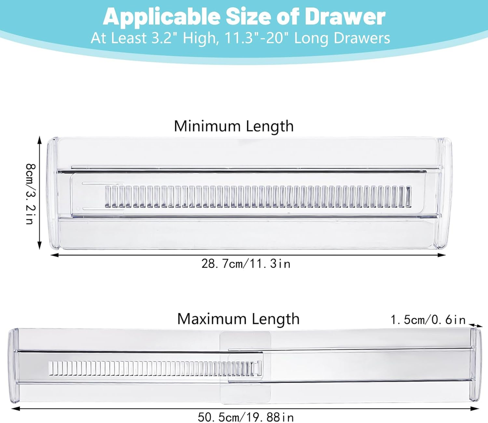 【Transparent material】The adjustable drawer dividers are made of Plastic material, which is durable and easy to clean. The transparent color can be adapted to any home without affecting the overall appearance. 【Extensible and adjustable】The bedroom drawer organizer divider can support manual length adjustment, the height is 3.2", and the extension length is from 11.3-20", practical and flexible, suitable for any drawer (please measure the actual size of the drawer before purchasing to avoid the product being unusable ). 【Easy to Install】The drawer divider for clothes is easy to use: just peel off the non-slip stickers, stick them to both sides of the divider, after stretching the divider to a suitable size, stick both ends tightly to the inside of the drawer, then install Finish. 【Extensive Storage】Multi-functional Adjustable Drawer Organisers are widely used in storage and storage of kitchen and kitchen utensils, office stationery classification, cosmetic partitions, baby clothes separation, hotels and supermarkets and other storage and finishing applications. 【Convenient Life】Clear Plastic Drawers Separators can effectively classify different items, save search time, and make the space tidy, orderly and convenient. Product Description Compare These Organizers Add to Cart Add to Cart Add to Cart Add to Cart Add to Cart Add to Cart Customer Reviews 3.9 out of 5 stars 232 4.2 out of 5 stars 47 4.2 out of 5 stars 30 3.4 out of 5 stars 3 3.9 out of 5 stars 232 3.9 out of 5 stars 232 — Price $28.99 $ 28 . 99 $17.99 $ 17 . 99 $26.99 $ 26 . 99 $38.99 $ 38 . 99 $14.99 $ 14 . 99 $9.99 $ 9 . 99 — Material PS ABS ABS ABS PS PS Carbon Steel、Plastic Color Clear White White White Clear Clear Black Number of Items 12 pack 5 pack 8 pack 12 pack 6 pack 4 pack 1 pack Length 11.3''-20" 11.6''-19.6'' 11.6''-19.6'' 11.6''-19.6'' 11.3''-20" 11.3''-20" 12.36"D x 16"W x 5.5"H Usage Bedroom,Closet,Kitchen,Office Bedroom,Closet,Kitchen,Office Bedroom,Closet,Kitchen,Office Bedroom,Closet,Kitchen,Office Bedroom,Closet,Kitchen,Office Bedroom,Closet,Kitchen,Office Kitchen 1 Retractable Lock 2 Sawtooth Spacing is Dense 3 Anti-Skid Pad Specification Size: Height 3.2in, Length 11.3in can be Extended to 19.88in 1. Note: Do not machine wash, but can be washed manually with water. 1 Clothing Storage 2 Tableware Storage 3 Office Storage 4 Dressing Storage 5 Bathroom Storage