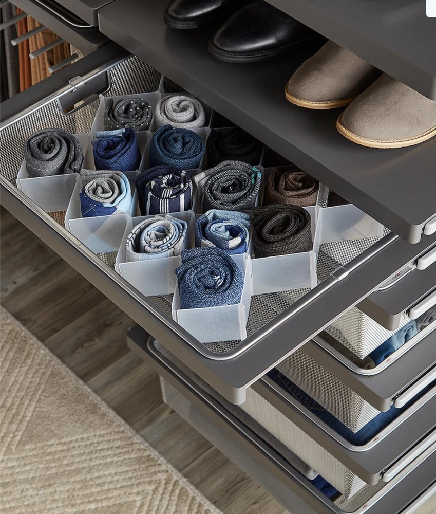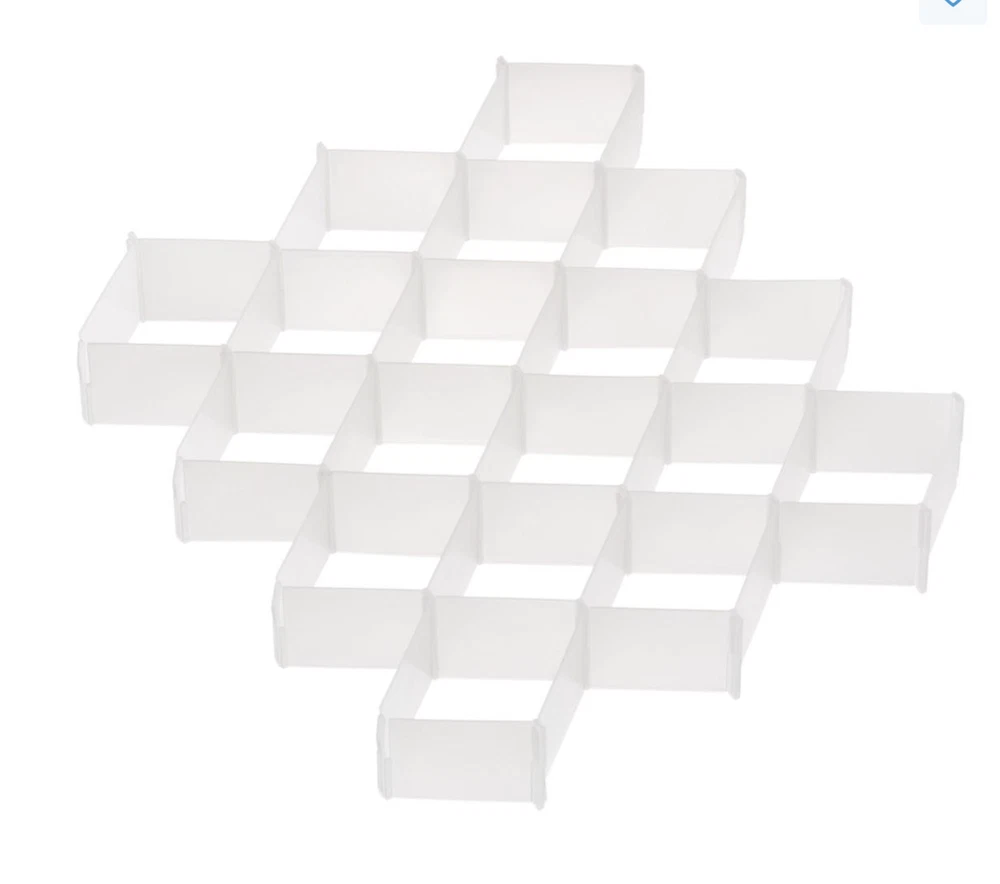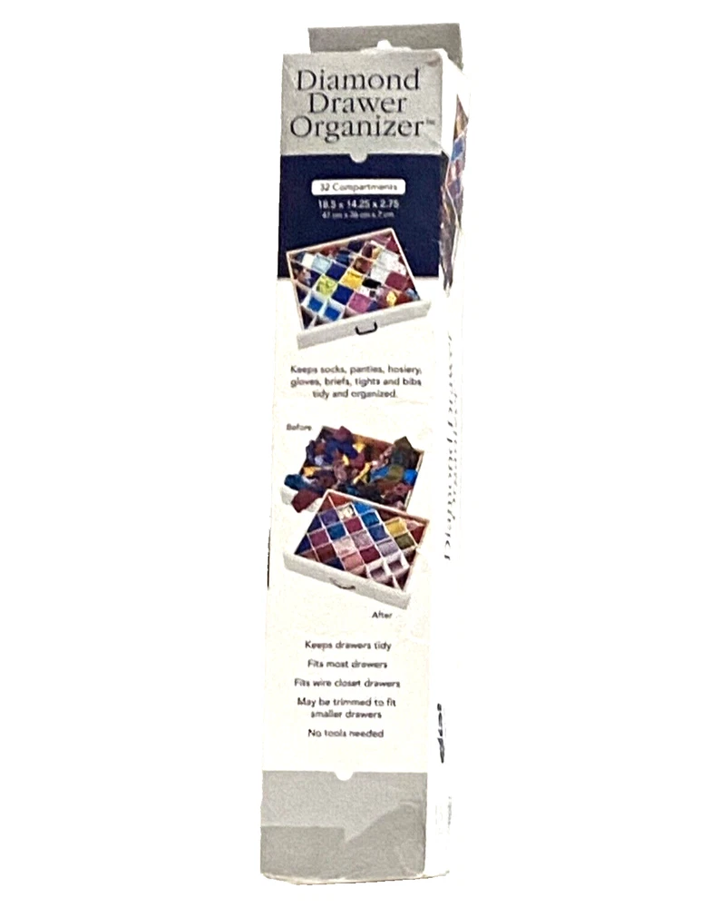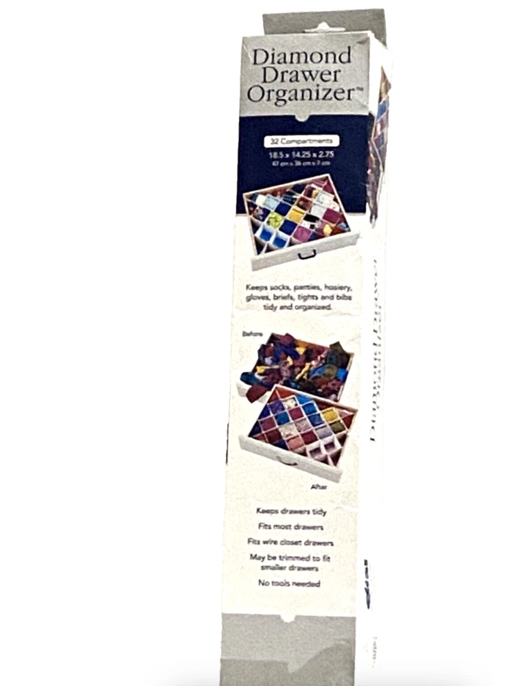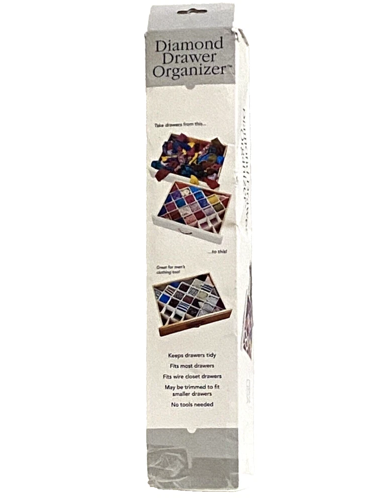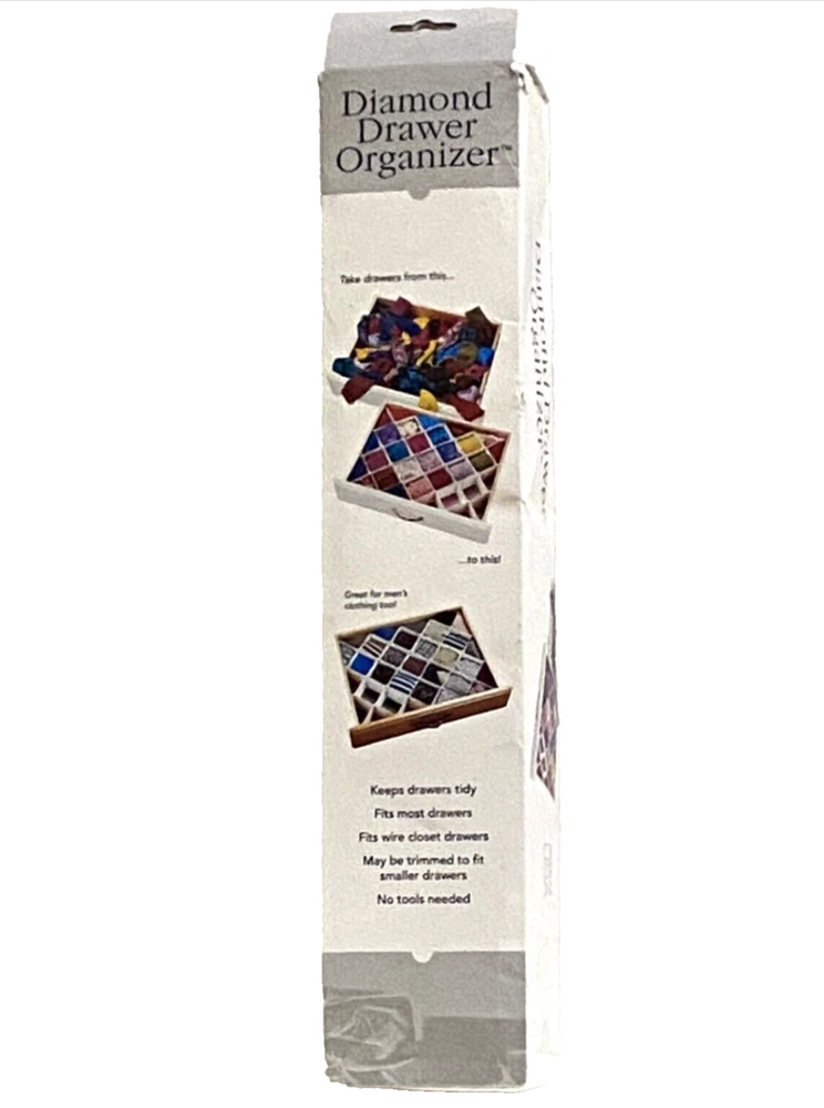 Diamond Drawer Organizer Keep drawers Tidy Fits most drawers Fits wire closet drawers May be trimmed to fit smaller drawers No tools needed Drawer in photos not included just organizer. These slide together easily. The organizer pieces are very flexible. Less wasted space with this organizer.You can make the grid fit nice and snug. This is a great product ! Made in USA