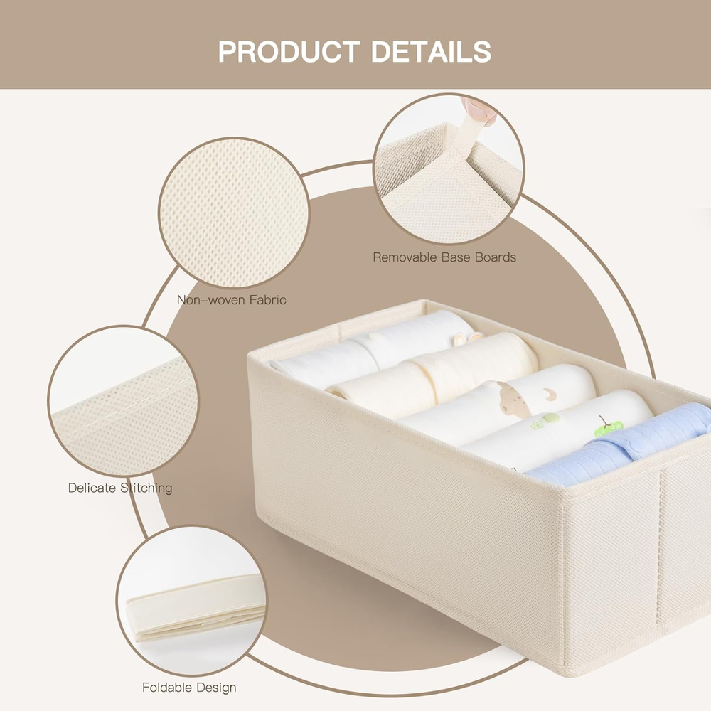 Versatile Storage Solution: Our dresser organizers come in 3 different sizes to keep your space organized and clutter-free, optimizing your daily storage needs. The set includes 6 large (11"x11"x4.5"), 9 medium(11"x5.5"x4.5"), and 6 small (5.5"x5.5"x4.5") Durable Design: Crafted from sturdy non-woven fabric, these dresser drawer organizers feature high-quality stitching for enhanced durability. Reinforced with heavy plastic boards on the sides and bottom, these bins maintain their shape over time. They are also odorless, making them ideal for storing baby clothes Multi-Use: Transform any space in your home with our drawer organizers! Perfect for bedrooms, living rooms, offices, and kids' rooms, they maximize storage potential. Whether for clothes, books, or toys, these organizers make it easy to declutter, keeping every room neat and orderly Simple Setup: The drawer organizers just open and insert the bottom for use, no tools required. When not in use, simply draw out the bottom and fold flat. Ideal for temporary storage during travel Save Time Searching: Offering the ultimate shelving solution for everyone—adults, kids, and babies! Keep your space tidy and allowing for easy access without rummaging through clutter Product description Criusia 21 pack drawer organizers to meet your daily clothes storage need! EVERYTHING IS PERFECTLY ORGANIZED Feeling overwhelmed by clutter at home? Criusia drawer organizers are here to help. This 21-piece set is versatile and perfect for various spaces, bringing order and tidiness to your home. 1 For Nursery 2 For Clothes 3 For Office supplies 4 For Cosmetic ENJOY ORGANIZING TIME WITH YOUR FAMILY GREAT WORKMANSHIP FOR LONG-LASTING USE Removable Bottom Board Simply insert or remove the bottom boards to easily fold or unfold those storage boxes. Tight Stitching Made with precision stitching, the organizer is sturdy and resistant to fraying or deforming, even with long-term use. PP Board Layer The inner layer is made of high-quality PP board, which has better support than cardboard and is odorless. Non-woven Fabric It’s gentle on clothes and other items, easy to clean, and provides a healthier home storage experience. MULTI-SIZE, MULTIUSE! More Product Customer Reviews 4.7 out of 5 stars 200 4.6 out of 5 stars 497 4.7 out of 5 stars 289 4.3 out of 5 stars 596 Price $21.99 $ 21 . 99 $34.19 $ 34 . 19 $19.99 $ 19 . 99 — item count 1 Pack 6 Pack 14 Pack 6 Pack Material Non-woven fabric, PP board Non-woven fabric, PP board Non-woven fabric, PP board Non-woven fabric, PP board Odorless ✔ ✔ ✔ ✔ Sturdy ✔ ✔ ✔ ✔ Odorless ✔ ✔ ✔ ✔