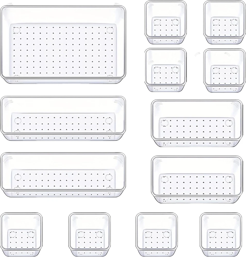 Premium Durable Material:The drawer organizer is made of durable non-toxic transparent resistant PET plastic, which is safe to use, durable and not easy to break, and the clear design makes it easy to find what you need quickly. 4 Combinations of Different Sizes: One drawer organizer set includes 8 storage bins of 4 different sizes. Includes: 8.7 x 5.8 x 1.8 inches (1pcs), 8.5 x 2.8x 1.8 inches(2pcs), 5.7 x 2.8 x 1.8 inches(2pcs), 2.8 x 2.8 x1.8 inches(8cps). Space-Saving Design: Say goodbye to drawer chaos! Our stackable drawer organizer trays maximize your storage space, allowing you to efficiently organize your essentials. Neatly store your cosmetics, jewelry, nail polish, accessories, utensils, and office supplies in style. Non-Slip Design: The bottom of the desk drawer organizer tray has a non-slip design to prevent the tray from moving around when opening and closing the drawer. Easy to Clean: Maintain a tidy and hygienic environment effortlessly. These acrylic drawer organizers are easy to clean, ensuring your items stay organized and looking impeccable at all times. Simply wipe them down for a quick refresh. Customize Your Way: With 8 pieces included, the possibilities are endless. Whether you're reorganizing your desk, kitchen, bedroom or any other drawer, Manalete Drawer Organizers provide clear, versatile, and efficient storage solutions. Experience the joy of a clutter-free lifestyle today. Product Description Manalete 4 Sizes Drawer Organizer For Various Drawers In Kitchen, Bathroom, Bedroom, Dresser, Office Desk SAY GOODBYE TO DRAWER CHAOS! 4 SIZES FREELY COMBINABLE - DIY YOUR DRAWER The video showcases the product in use. The video guides you through product setup. The video compares multiple products. The video shows the product being unpacked. More Package Quantities For Your Choice Add to Cart Add to Cart Add to Cart Customer Reviews 4.1 out of 5 stars 297 4.0 out of 5 stars 65 3.9 out of 5 stars 59 4.0 out of 5 stars 65 3.9 out of 5 stars 59 Price $9.99 $ 9 . 99 $36.99 $ 36 . 99 — — $11.99 $ 11 . 99 Quantity for 9 x 6 1 10 1 1 1 Quantity for 9 x 3 2 13 3 2 2 Quantity for 6 x 3 5 24 3 2 2 Quantity for 3 x 3 7 33 3 2 8 Materials plastics plastics plastics plastics plastics
