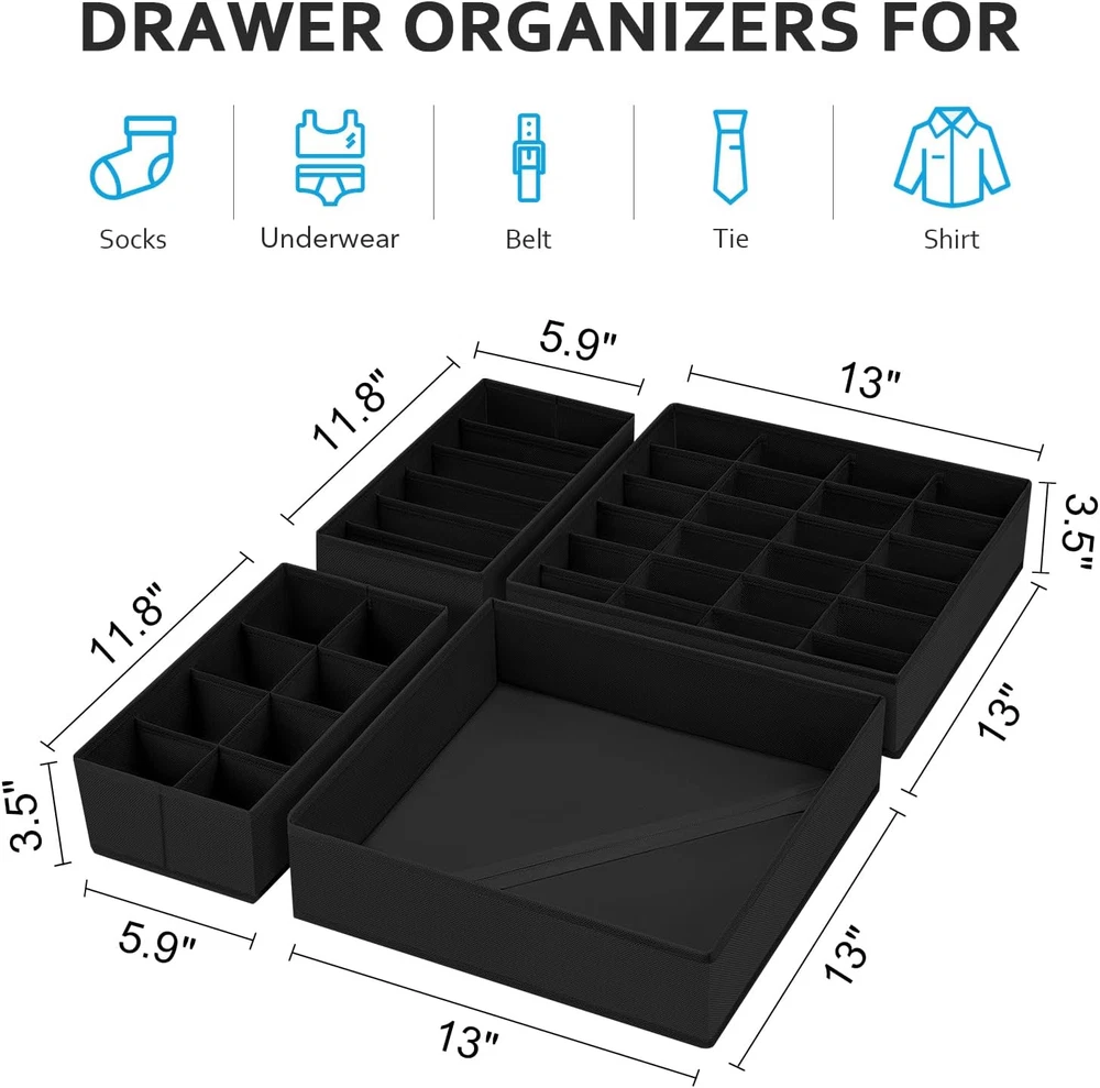 Menu Other Items Feedbacks About Us Contact Us Add To Favorites Drawer Organizers for Clothing, Sock Organizer for Dresser Drawer Organizer, Foldable Underwear Organizer for Drawer, Panty Clothing Closet Organizers, Black, Set of 4 【Versatile and Efficient】Our drawer organizer clothes is designed organize socks, ties, scarves, panties, shirts, and lingerie. With everything neatly arranged, the drawer organizer for clothing making it easier and faster to find what you need 【Multiple Combinations】Our 4-piece set includes a large empty bra organizer and a 24-grid sock drawer organizer (12.9*12.9*3.5") that surpass similar products in size. We offer an 8-grid as well as a 6-grid fabric drawer organizer (11.8*5.9*3.5") . These versatile options cater to a wide range of storage needs 【Foldable & Easy to Install】Our sock underwear organizer features a user-friendly foldable design with a bottom zipper. Installing it is a breeze, and when not in use, the dresser drawer organizer can be folded for compact storage, saving you space 【Premium Fabric】Made from high-quality non-woven fabric, our storag bins offers exceptional durability. The carodboards on four sides ensures clothing drawer dividers maintains its shape and remains resistant to deformation 【Superior Craftsmanship】The precision stitching and reinforced edges of dress drawer organizer enhance its strength, making it tear-resistant. Our nursery organizer will withstand daily wear and tear, providing you with reliable storage for years to come Product Description A perfect combination 4 Set will keep your bedroom neat and tidy. Bra storage box Underwear storage box Socks storage box Tie storage box The bottom zipper design provides stronger support for the entire product. Open storage Placing the drawer storage box under an open clothes rack can provide an additional storage area. Make the room more spacious and convenient for you to pick up clothes. Wardrobe storage The combination of wardrobe and storage box is a perfect match, and partitioned storage can make drawers and wardrobes more tidy. Drawer storage Placing the storage box in the drawer can better partition the products in the drawer and maintain cleanliness. Don't worry about the drawers being messy anymore. Keep clothes clean and tidy Dividing different clothes into different areas is beneficial for picking them up. Item Specification Item Shape Rectangular Number of Compartments 38 Unit Count 4.0 Count Number of Compartments 38 Number of Items 4 Mounting Type Insert Mount Unit Count 4.0 Count Color Black Material nonwoven Specific Uses For Product storage Item Weight 0.5 Kilograms Product Dimensions 11"D x 11"W x 3"H Shape Rectangular Package Type FFP Mounting Type Insert Mount Item Weight 0.5 Kilograms Size 4 Pack Special Feature Compact,Foldable Item Dimensions D x W x H 11"D x 11"W x 3"H Features Compact,Foldable Dimensions Shipping Returns Additional Info Product Dimensions: 11.0 "h x 11.0 "h x 3.0 "h. Weight: 0.5 kg Fast shipping is very important for us. Our standard shipping service is FREE. Your order will be shipped within 1-3 business days upon full payment received. Most items are delivered within 3-5 business days, however, please allow 3-10 business days. We are shipping only to USA. We only ship to the confirmed Paypal address. We reserve the right to cancel any order for any reason at any time. We are not responsible for undeliverable addresses. We offer a 30 day return policy from checkout winning date. Your satisfaction is guaranteed! If for any reason you are unhappy with your item, just return it within 30 days for a full refund, minus shipping cost. Please contact us prior to initiating a return so that we can issue you a refund authorization. Items defective upon receipt must be packaged in their retail packaging as if new and returned with a detailed description of the problem. Return shipping fees are not refundable. We reserve the right to decline any returns if the above guidelines are not followed. All of our items, unless otherwise stated, will only run on 120 volts. Please check to make sure your country complies with these specifications. If you have a problem or question regarding your transaction please contact us before leaving any type of feedback. We will work with you to resolve any problem you may have.