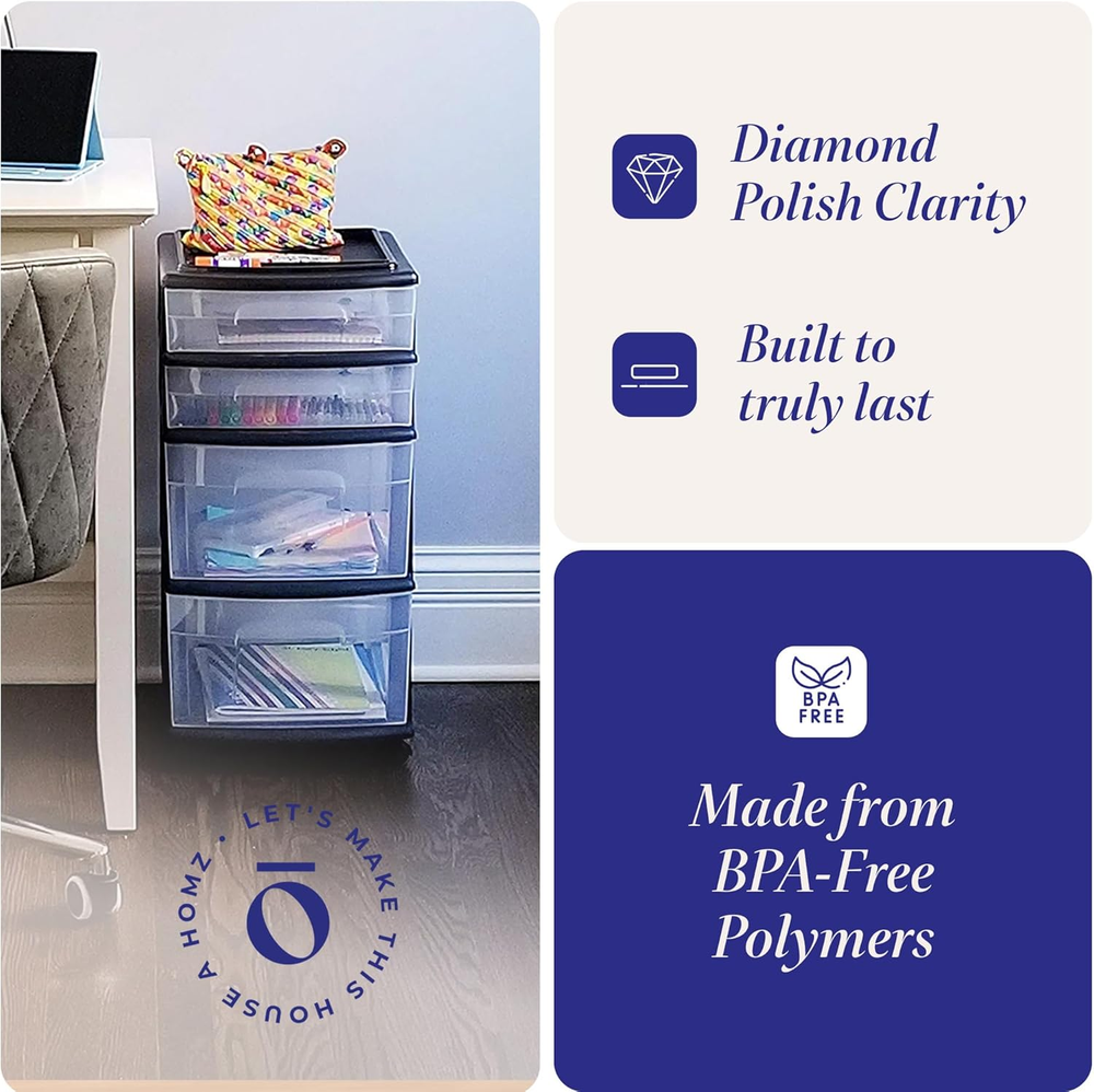 Store New Arrivals Add to Favorite View Feedback Contact Drawer Tower, 4-Tier Clear Plastic Storage Organizer Cart, Black Frame Description Item model number 05564BKDC.01 Item Package Quantity 1 Style 4 Drawers (Set of 1) Assembly Required No Part Number 05564BKDC.01 Color Clear/Black Pattern Storage Cart Material Plastic Batteries Required? No Certification certified frustration-free Item Weight 7.65 pounds Batteries Included? No Frame Material Plastic Number of Drawers 4 Global Trade Identification Number 10073527171093 Size 1 Pack Product Dimensions 12.5"D x 25.5"W x 14.25"H Included Components Medium Cart^ Plastic Storage Cart: Perfect the art of hiding your hoard with the HOMZ storage drawer set. This plastic cart is made to fit anywhere you need organizing power, whether at home or work. Space Saving: This cart has 4 roomy storage drawers and a small vertical footprint. The cart measures 12.5" L x 14.25" W x 25.5" H, while each biggest drawer interior measures 12.31" L x 9.92" W x 6.85" H and each smallest drawer interior measures 12.31" L x 9.92" W x 3" H. It Will Fit: Our rolling storage drawers feature clear plastic materials and removable wheels for easy transportation. Use them to store toiletries, office supplies, crafts, and more. From Trash to Treasure: Life in plastic is fantastic when the plastic is made from 90% recycled materials. We know the earth is important to you, so our cart is good for your items and the planet. HOMZ for Your Home: From organization to storage, we have the container that you are looking for. Allow us to make your house a HOMZ. Product Description 4 Drawer Comparison Table Black Frame Color Black Clear Cart Color Clear 12.5Dx14.25Wx25.5H Dimensions 14.25Dx12.5Wx39.31H Black Frame Color White Clear Cart Color Clear 12.5Dx14.25Wx25.5H Dimensions 14.25Dx12.5Wx39.31H Black Frame Color Black Clear Cart Color Clear 12.5Dx14.25Wx25.5H Dimensions 12.5Dx14.25Wx25.5H 6 Drawer 6 Drawer 3 Drawer ABOUT US We offer the best prices around on high quality products. Our E-store includes media such as books, movies, music and games while offering electronics, toys, sporting apparel, clothing, tools, general home, garden items and more. SHIPPING We are always working hard to ensure your package arrives as soon as possible. Please understand that some factors like weather, high postal traffic, and the performance of shipping companies are outside of our control. We offer free shipping to the lower 48 states and ship within 2 business days of payment, usually sooner. We do not accept P.O. Boxes. Please provide a physical address. For shipping outside of the continental USA, we only use eBay's Global Shipping Program.The item is shipped to KY and then sent to the rest of the world. International customers are responsible for all duties and taxes. Continue to check out in order to calculate costs for shipping the item to your country. Messages regarding eBay's Global Shipping Program MUST be directed at eBay EXCLUSIVELY. RETURNS We offer a 30-Day Return Policy on items which you are not completely satisfied with. You have the option for a full-refund or an exchange of the item. No returns are available on items shipped outside of the USA. PAYMENT We accept PayPal. CONTACT US This page content is yet to come Please ad us to your favorite seller and visit again later Thank You CUSTOMER SATISFACTION We try our very best to make sure every customer is completely satisfied. If there's a problem, message us! We're happy to help. WE ACCEPT Copyright © 2021 AutoDS. | All Rights Reserved