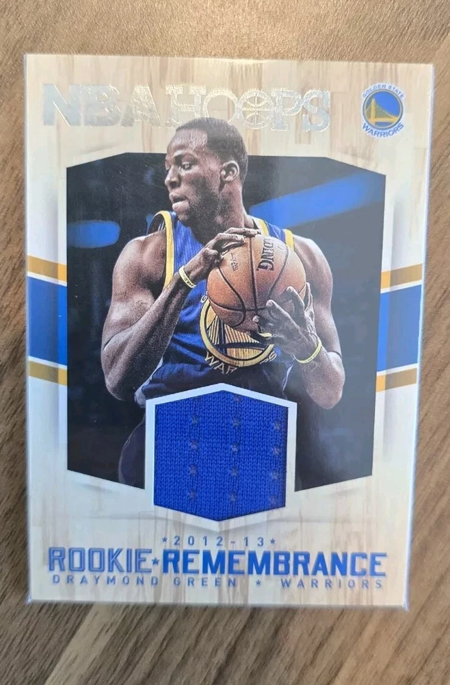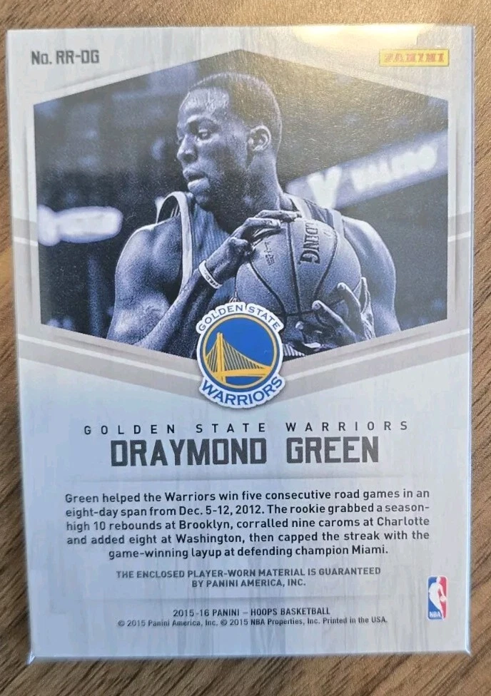 It is a Draymond Green 2015-16 NBA Donruss Rookie Remembrance PATCH card featuring the Golden State Warriors player. The card is a sports trading card manufactured by Panini as part of the 2015-16 set. It is a rookie card with a patch variation, indicating it contains a piece of a player-worn patch. The card number is RR-DG and it is a collectible item for basketball fans.