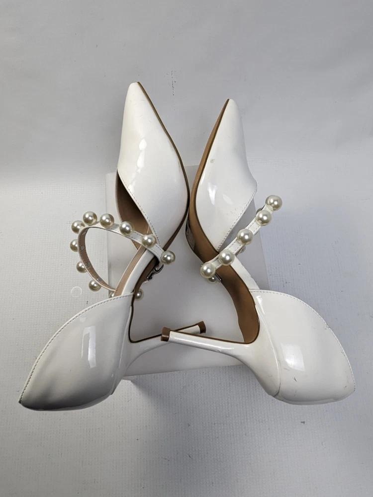 Designed with a sleek d’Orsay silhouette, glossy upper, and decorated with a lustrous pearl strap, these stiletto pearl strap pumps will give your ensembles instant glamour. Size: Women's 8.5 These shoes are in great pre-owned condition and appear to have only been worn once or twice. There are minor marks on the outer heel side of each shoe; please see pictures.