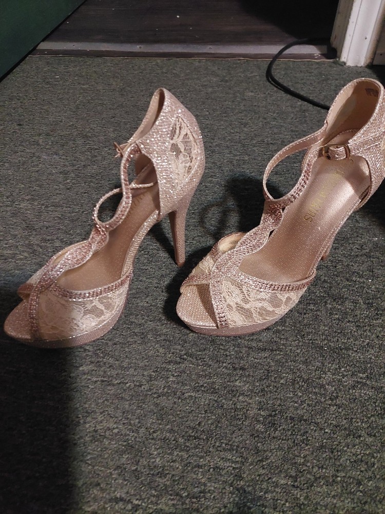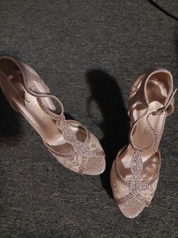 These are Dream Pairs women's gold glitter stiletto heels in size 7.5. The peep toe design features a buckle closure and adjustable ankle strap. The ultra-high heel measures over 4 inches, with a platform style for added height. The shoes are accented with glitter and have a cushioned insole for comfort. The upper material is synthetic, and the brand is Dream Pairs.