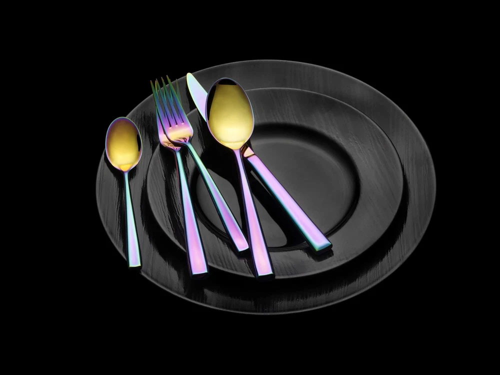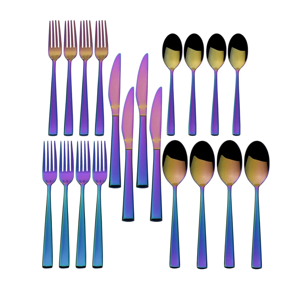 This dream Rainbow 20 piece set includes 4 dinner forks, 4 Dinner Knives, 4 Dinner Spoons, 4 teaspoons, 4 salad forks. Never needs polishing. Lifetime limited . Hand wash recommended. Colorful & Stylish Design: This Dream Rainbow flatware set brings a bold and vibrant touch to your dining experience, featuring a unique rainbow finish that stands out on any table setting. Complete 20-Piece Set: The set includes 4 dinner forks, 4 knives, 4 spoons, 4 teaspoons, and 4 salad forks - ideal for family meals or small gatherings. Durable Stainless Steel: This flatware set retains its beauty even after frequent use, making it a reliable choice for everyday meals or special occasions, and requires no polishing to maintain its shine. Never Needs Polishing: Forget the hassle of constant maintenance. This flatware set is designed to keep its polished look without requiring extra care, saving you time while ensuring your utensils always look brilliant and ready to impress. Hand Wash Recommended: Although made for durability, this rainbow flatware set is recommended to be hand-washed to preserve its beautiful finish and vibrant colors, allowing you to enjoy its stunning look for meal after meal.
