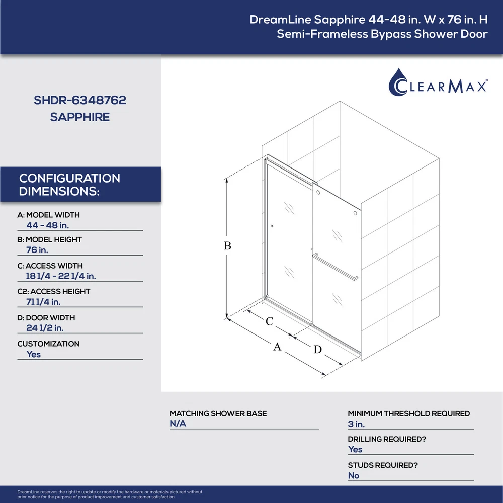 Powered by Frooition All Categories DreamLine SHDR-6360762G Sapphire 56 - 60" W x 76" H Semi-Frameless Bypass Shower Door Overview Item Description The DreamLine Sapphire is a semi-frameless sliding bypass shower or tub door with a modern, elegant design and a striking look. The Sapphire features thick tempered glass, convenient dual towel bars and sleek rollers for smooth gliding action. SafeClose bumper guides and integrated vinyl inside wall profiles offer glass safety and operational security for the Sapphire. DreamLine exclusive ClearMax water and stain resistant glass coating provides superior protection from buildup and easy maintenance. Drilling into the threshold is required for installation of this product and professional installation is recommended. Turn your shower space into a gem with the Sapphire shower door! Dreamline SHDR-6360762G Features: Model size: 56-60" W x 76" H; door walk-in: 24 1/4 - 28 1/4" High quality 5/16" (8 mm) thick certified smoke gray tempered glass; DreamLine exclusive ClearMax water and stain resistant glass coating Top and bottom guiderails can be trimmed up to 4" for width adjustment; wall profiles accommodate up to 1/4" for out-of-plumb (uneven walls) Minimum threshold depth of 3" is required for proper installation Important: before making your shower door selection, make sure walls are finished with tile or other materials, for proper measurements Double sliding bypass configuration for left or right side entry to the shower Dreamline SHDR-6360762G Specifications: Overall Height: 76" (bottom to top of door fixture) Overall Width: 60" (left to right of door fixture) Enclosure Width Range: 56" to 60" (range of enclosure sizes door will accommodate) Maximum Door Opening: 30-1/2" (assuming door is not trimmed) Door Installation: Reversible Glass Thickness: 5/16" Number of Panels: 2 Why Choose BuildInc? OUR PROMISE TO YOU About Us At Build, we promise to provide the best selection we can, most competitive pricing, and unmatched customer service. Our store has quality home improvement products from trusted manufacturers like Moen, American Standard, Delta, Kraus, Kichler, Progress Lighting, Schlage, Kwikset, Baldwin, Broan, NuTone, Air King, and Rev-A-Shelf. With over 200,000 home improvement products for you to choose from, we have just what you need to get your project done. Fast & Free Shipping We promise to make it our priority to get you your items as fast as we can. We ship from 440 warehouses around the country, ensuring that your product will get to you as soon as possible. We know you're eager to get your hands on your new purchase, we would be too. As a bonus, most items ship for free. Returns We are happy to accept returns of unused or defective items for a refund within 30 days from the date of delivery. For returns outside 30 days, please contact our Customer Service team to go over our options. For full details, please view the Shipping and Payments tab above. To initiate a return simply go to the eBay Returns Portal and submit a return request. We ask that all items be returned with all original components via a traceable method. Once your return is received and processed, we will quickly get your refund or replacement issued. If for any reason you are unsatisfied with your purchase or for product or warranty questions, please contact Customer Service team for assistance. More Items! View more great items! About Us | Shipping | Returns | Contact Us | FAQ | Collections | Special Offers! Powered by Frooition Frooition Frooition | No-js Template | eBay design, eBay store design, eBay shop design, eBay template design, eBay listing design (ver:froo_no_js) This listing is currently undergoing maintenance, we apologize for any inconvenience caused.