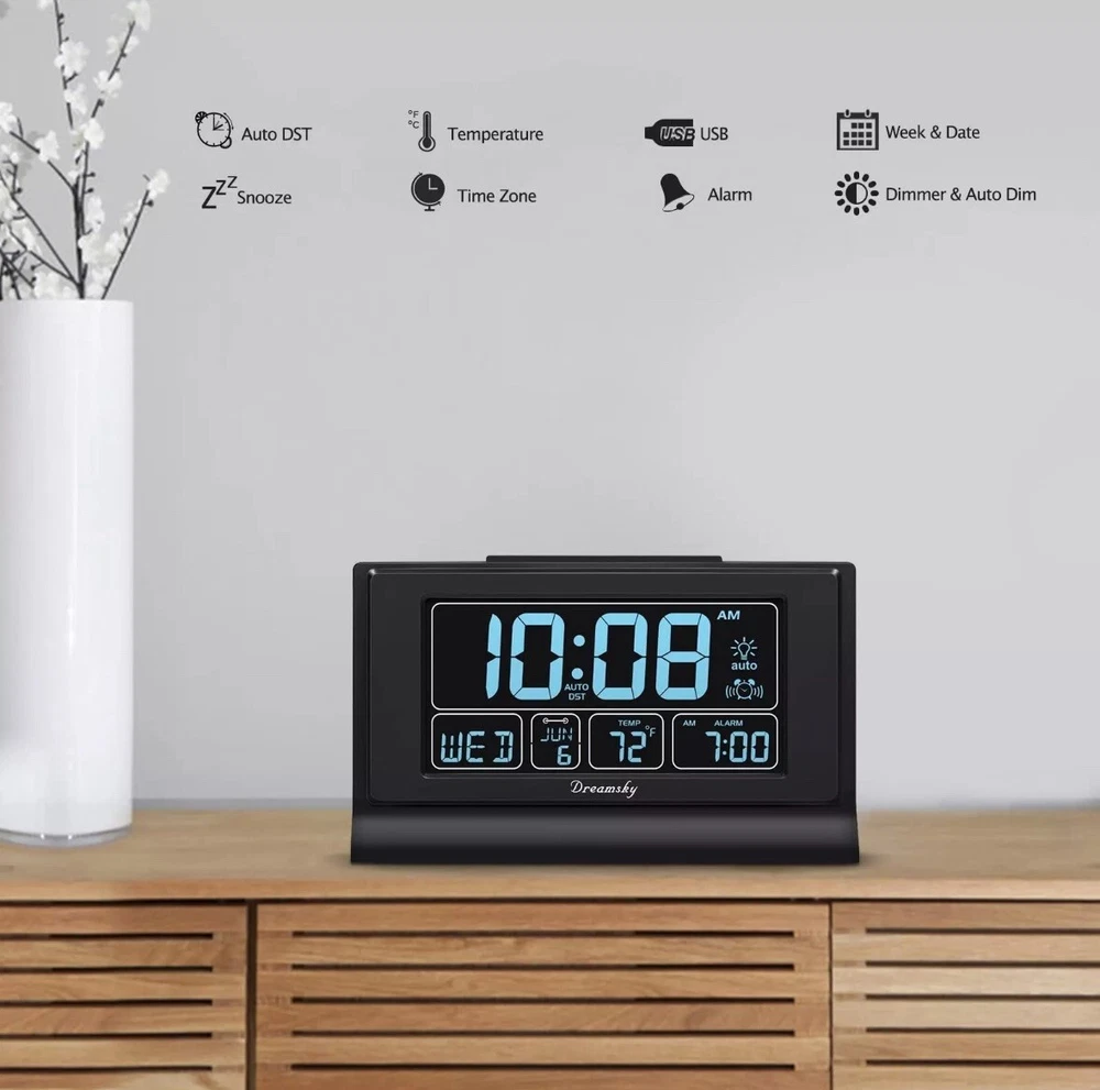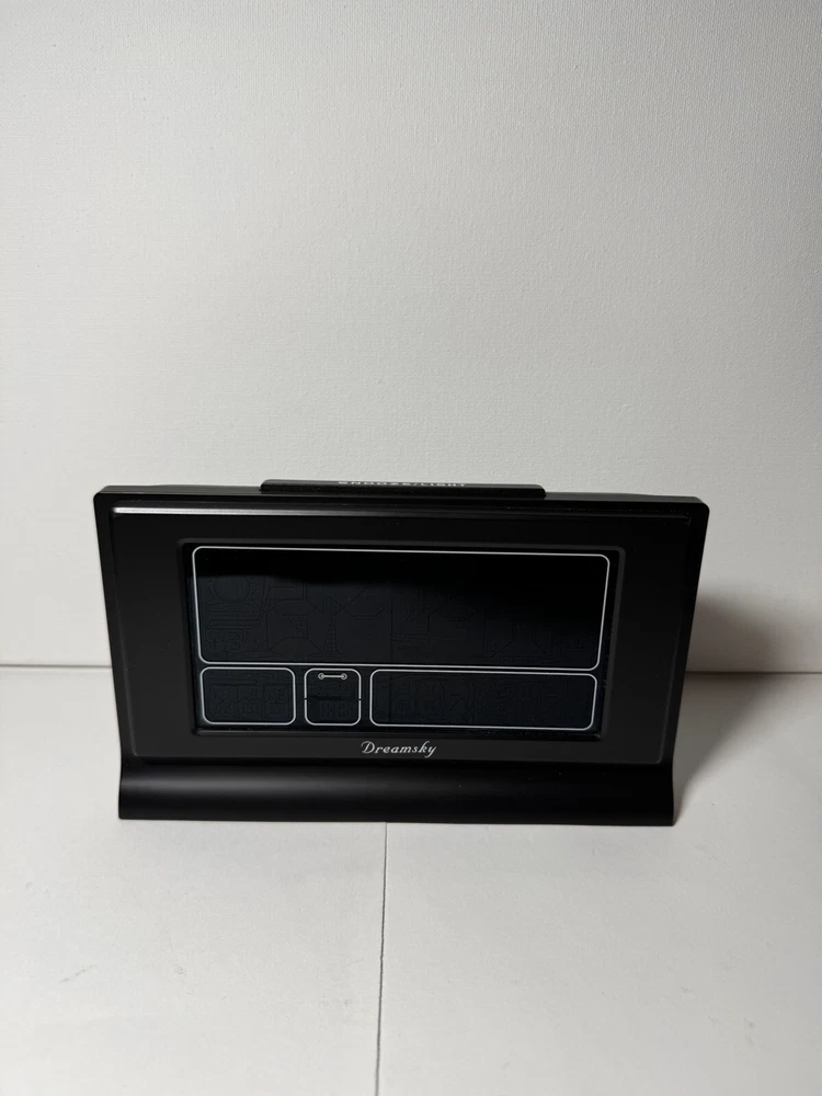 Looking for a reliable and functional alarm clock for your bedroom? Look no further than the DreamSky Alarm Clock! This digital clock features battery backup, so you can rest assured that your alarm will always go off, even in the event of a power outage. The sleek black design is perfect for any bedroom decor, and the easy-to-read digital display ensures that you can see the time from anywhere in the room. Comes as shown in pictures. No batteries included.