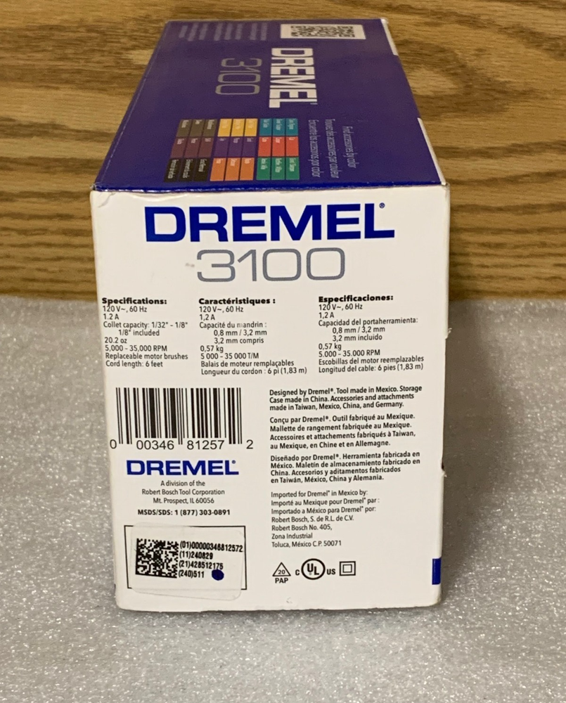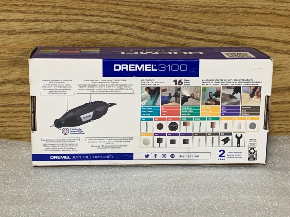 BRAND NEW Dremel 3100 1.2 Amp Variable Speed Rotary Tool Kit with 15-Accessories. The Dremel 3100-1/15 1.2A Variable Speed Rotary Tool Kit offers versatility and precision for a wide range of tasks, from cutting and sanding to grinding and polishing. With adjustable speed control, this rotary tool is designed for detailed work on various materials such as wood, metal, plastic, and more. The 15-piece kit includes a selection of attachments and accessory bits to help you complete any DIY project or craft with ease.