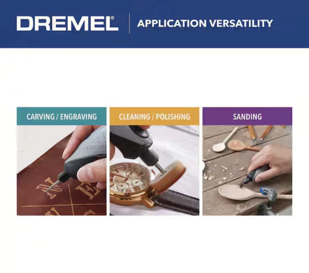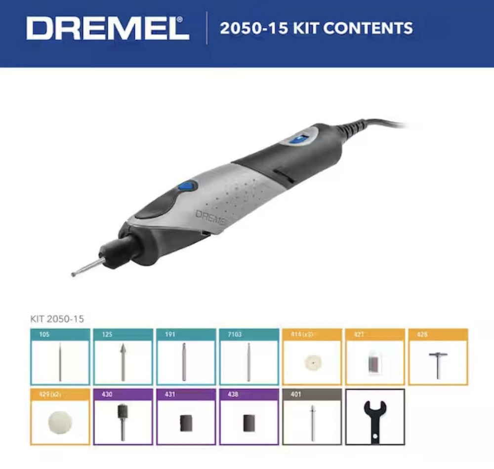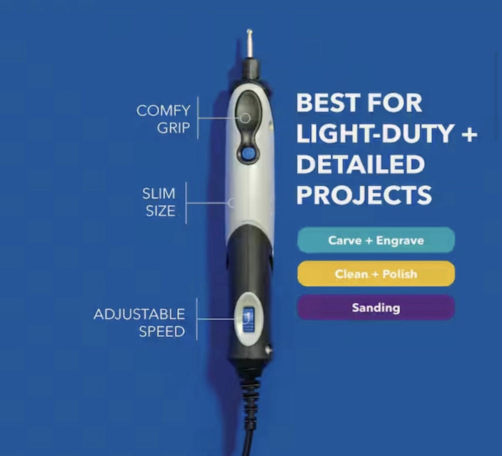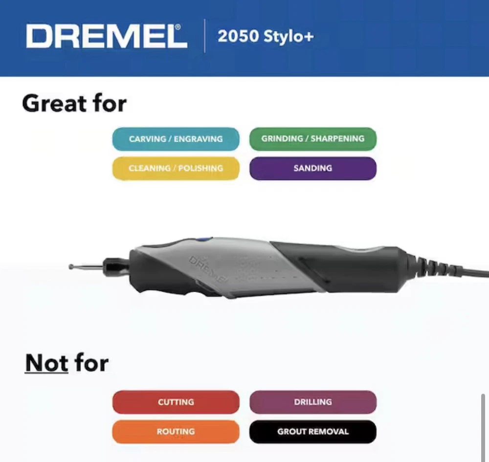 The Stylo+ offers the precision you expect from a Dremel rotary tool, packaged into a sleek, lightweight design. Crafted with the comfortable ergonomics of a pen, the narrow profile and soft grip of the Stylo+ allows creative users to etch, engrave, polish and sand with ease. You will enjoy an endless range of creative applications with this versatile craft tool set. The tool's variable speed ranges from 5,000 to 22,000 RPM, providing the optimal speed control for applications such as glass etching, leather burnishing, bead making, wood engraving and more. Product Information Internet # 304585350 Model # 2050 Store SKU # 1003148215 Store SO SKU #1003014582 UPC : 08059604203 F90