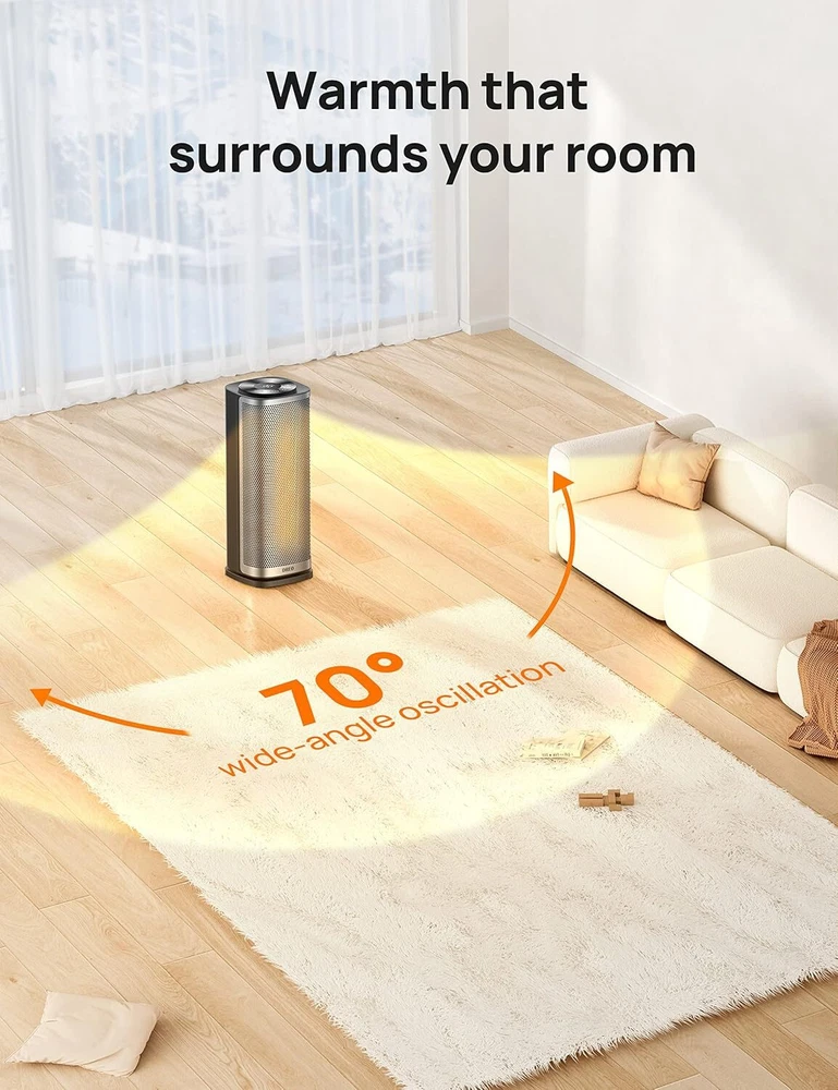 About this item Instant Heating: DREO space heater with 700-1500W and 3 adjustable PTC high-efficiency heating modes. With its wide oscillation, it swiftly distributes warm air to offices, bedrooms, or living rooms. Built-in Time: The auto-off timer function allows you to program from 1 to 12 hours, in 1-hour intervals. 24-hour auto shut-off for hassle-free operation. Precise Temperature Control & Energy Saving: DREO ECO mode adjusts power based on real-time conditions, letting you set the ideal room temperature within 41-95°F with 1°F increments, while saving on electricity costs. Remote Control: The multi-function remote control allows you to remotely turn the electric heater on/off, adjust the temperature, set the timer, control the 70° oscillation, and more, making operation easier. Comprehensive Safety Protection: Features V0 flame-retardant material, overheat protection, tip-over safety. Smart 1-12 hour timer and 24-hour auto shut-off for hassle-free operation. ETL certified for added peace of mind. Silent Operation, Peaceful Sleep: DREO DC motor reduces fan noise, creating a quiet and warm sleeping environment. With heaters for indoor use, gentle breeze accompanies you to sleep, providing comfort and tranquility even on cold winter nights. On Dec 20, 2024 at 01:33:28 PST, seller added the following information: