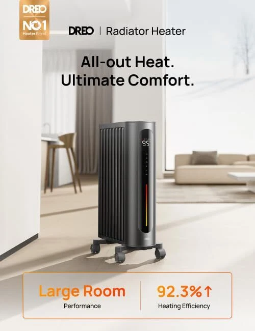 Dreo Oil Filled Radiator Heater, 1500W Radiant Heater with Remote Control, Digital Thermostat, 4 Modes, 24h Timer, 10 Safety Protections, Child Lock, Space Heaters for Indoor Use Large Room Bedroom Unstoppable Heating for Large Spaces: This oil heater delivers all-out heat output, reaching your desired temp seamlessly. With up to 92.3% higher heat efficiency, it ensures quick, even warmth in large spaces like living rooms, bedrooms, and offices Upgraded Thermal Design: Our oil filled radiator features 8 M-shaped fins and dual covers, boosting heat dissipation by 59.5%. The innovative oil circulation enhances heat transfer for consistent warmth, creating a more comfortable and evenly heated space Accurate Temp Control: This DREO oil filled heater has 3 heat settings and a 24-hour timer. Its compensation algorithm and high-precision NTC sensor ensure accuracy within 1°F, letting you customize temperatures from 41°F to 95°F while saving energy All-around Safety: This oil heater boasts 10 safety features, including triple overheat protection, a 37.9% cooler surface, 40°tip-over protection, V0 flame-retardant material, FortPlug, thermal insulated wiring, child lock, all certified by ETL Enhanced User Experience: This portable heater features a rear cord design for improved insulation and neat storage, large carpet casters, an ergonomic handle for hassle-free mobility, and a temperature display light bar for straightforward monitoring