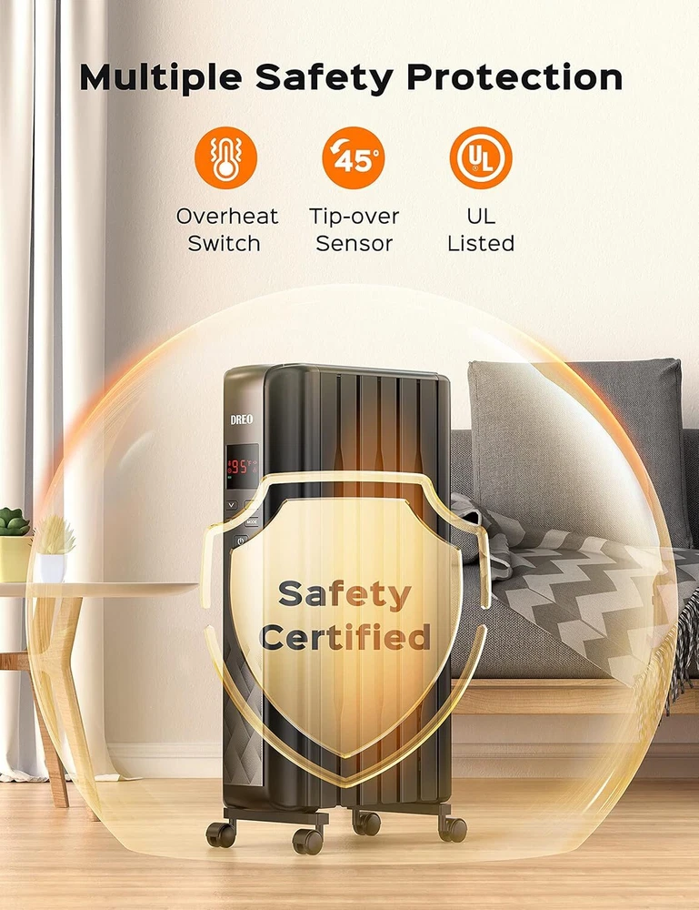 Dreo Oil Filled Radiator Heater, Electric Radiant 26" X 19" X 7.5", Black Product Details Brand: Dreo Special Feature: Large heating area, remote control, high heating efficiency, save energy, quiet Color: Black Form Factor: Pedestal Indoor/Outdoor Usage: Indoor Power SourceHeating Method: ACRadiant, Convection Item WeightHeat Output: 22.22 Pounds1500 Watts : 1500W high power, spindle-shaped openings and M-shaped heating fins create stack effect to provide 360° efficient circulation of hot air in your rooms, keeping your home cozy and warm without drying out the air. Dreo oil radiator heater is your best go-to in winter. : The spindle-shaped openings, 225 mm larger than others enlarged fins and Dual U-shaped heating tubes make the Dreo oil radiator heater so effective in distributing heat that the heat can be doubled and released quickly, evenly and efficiently to a large area or the entire room. : With the wraparound heating fins design, the heating element and fins are not directly exposed, preventing burn risks. The exteriors are also specially treated to be only at 80℃ at most during use, 30% less hot to the touch than most oil heaters. : Dreo Oil Filled Radiator Heater made of V0 flame retardant materials was certified by UL. Built-in tip-over switch, Dreo Oil-filled heater will automatically shut off while tip-over by accident to ensure you and your family are safe and worry-free : Equipped with 600W/900W/1500W heating modes, this space heater also features a smart ECO mode that adjusts the working mode based on the room temperature with built-in precise temperature sensor, continuously keeping your home in constant warmth while saving more on your energy bills in winter : A remote is included to allow you to mute, set a timer, and access other functions of this oil-filled radiator heater from 19 feet away. Universal wheels make moving this big guy a breeze. Assembly is super easy — Just open the bottom brackets and insert the wheels directly. No tools needed : Dreo oil radiator heater comes with a 24-hour timer, you can set the timer in 1 hour increments. Not only can you set the auto off time, you can also set the auto on time while on standby. Always stay warm when at home