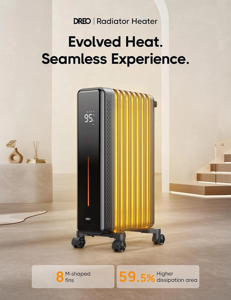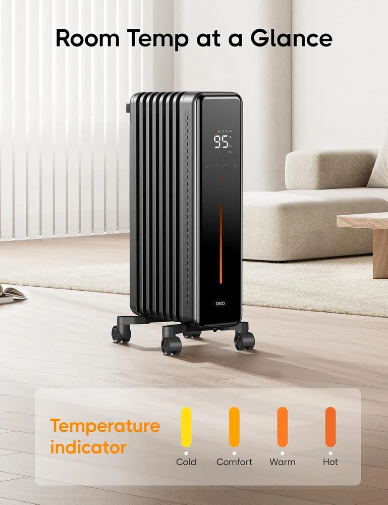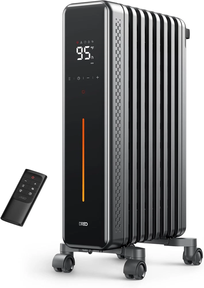 Dreo Radiator Heater, 1500W Portable Space Oil Filled with Large, Gray Product Details Brand: Dreo Special Feature: Energy Efficient, Digital Display, On Off Timer, Portable, Adjustable Temperature, Electronic Thermostat, Remote Control, Fast Heating, Overheat Protection, Tip-Over Protection Color: Space Gray Form Factor: Pedestal Indoor/Outdoor Usage: Indoor Product Dimensions: 28.54"D x 7.68"W x 18.5"H Recommended Uses For Product: Office, Garage, Home Mounting Type: Floor Mount Room Type: Kids Room, Bedroom, Living Room, Home Office, Dining Room Heating Coverage: 280 sp.ft. Burner type: Radiant Heat Output: 1500 Watts Fuel Type: Electric Number of Speeds: 3 Voltage: 120 Volts Min Temperature Setting: 41 Degrees Fahrenheit Max Temperature Setting: 95 Degrees Fahrenheit Item Weight: 20.6 pounds Manufacturer: Dreo Country of Origin: China Item model number: DR-HSH011 Batteries: 1 CR2 batteries required. (included) Special Feature: Energy Efficient, Digital Display, On Off Timer, Portable, Adjustable Temperature, Electronic Thermostat, Remote Control, Fast Heating, Overheat Protection, Tip-Over Protection Energy Efficient, Digital Display, On Off Timer, Portable, Adjustable Temperature, Electronic Thermostat, Remote Control, Fast Heating, Overheat Protection, Tip-Over ProtectionEnergy Efficient, Digital Display, On Off Timer, Portable, Adjustable Temperature, Electronic Thermostat, Remote Control, Fast Heating, Overheat Protection, Tip-Over Protection See more Heating MethodItem Weight: Radiant, Convection20.59 Pounds - : The use of extended fins and spindle-shaped openings in this oil-filled radiator heater ensures a wide and even distribution of warmth throughout your home. Whether used in any room, it delivers consistent and comfortable warmth, enveloping your space in cozy comfort : The 1500 W high-power Dreo oil-filled radiator heater delivers highly efficient heat distribution, ensuring quick and even dispersion of warmth throughout a large area or the entire room. Enjoy rapid and consistent heating for maximum comfort : Equipped with an ambient temperature indicator that adjusts according to your room's temperature, this radiator heater allows you to effortlessly monitor the temperature of your room at a single glance. Additionally, the display auto-dimming function enhances comfort and ease of use, providing a more enjoyable experience : This heater offers heating modes of 600W, 900W, and 1500W, along with a smart ECO mode that allows you to individualizes your warmth from 41 to 95℉ in 1℉ increments. The ECO mode adjusts based on room temperature, ensuring comfortable and efficient warmth while reducing energy bills : This Dreo oil-filled radiator heater is built with tip-over protection, V0 flame retardant material, overheat protection, and safety plug, all certified by ETL. It offers comprehensive protection for your family, fortifying defenses against any accidents and ensuring peace of mind for users : This heater excels in user-friendliness, featuring an anti-scalding handle, large carpet caster, touch buttons, low-noise mode changing, a 24-hour timer, remote control, and a mute function. It prioritizes convenience, mobility, quiet operation, and customizable settings, enhancing user satisfaction Note: When the power is turned on, the default setting is H3. For the first 40 minutes, regardless of the temperature set on the ECO mode, the thermostat does not intervene and remains on high. This is designed to ensure that the oil heater quickly raises the room temperature when it is low, providing rapid warmth to your room.