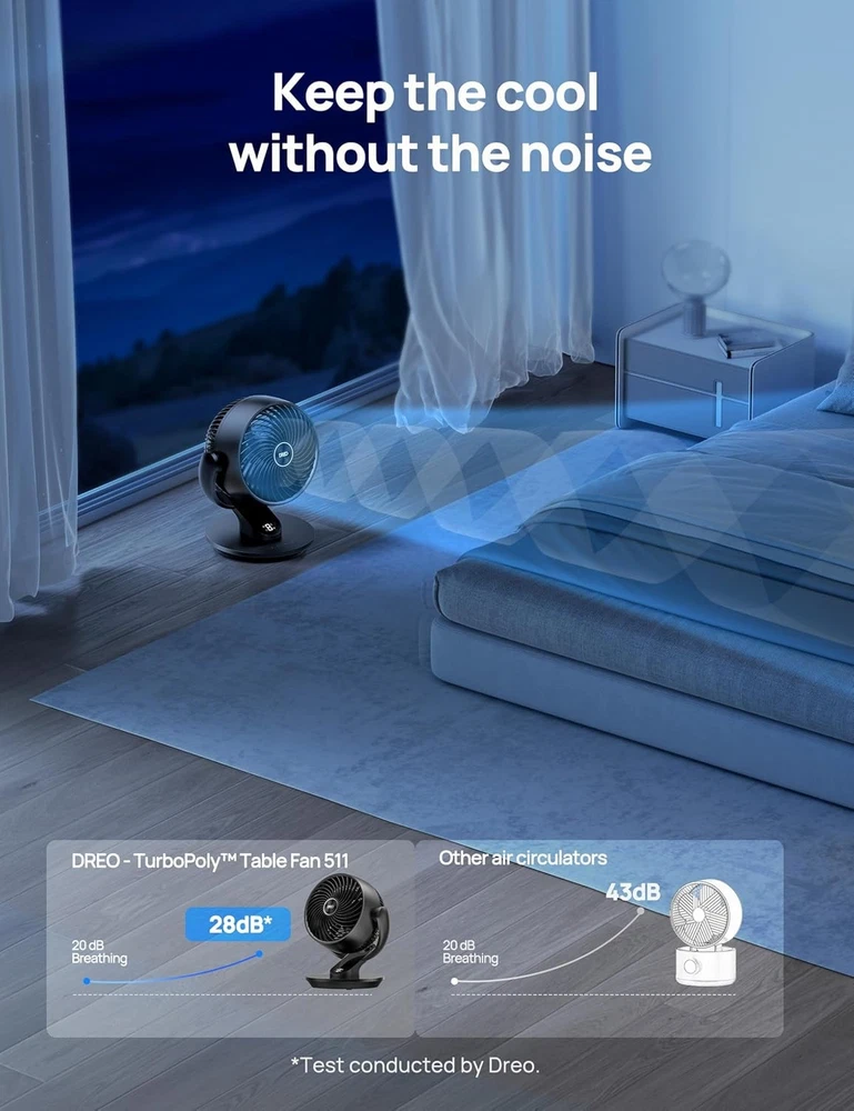 ๐๐จ๐ฐ๐๐ซ๐๐ฎ๐ฅ ๐ฐ๐ก๐จ๐ฅ๐ ๐ซ๐จ๐จ๐ฆ ๐๐ข๐ซ๐๐ฎ๐ฅ๐๐ญ๐ข๐จ๐ง: Using Dreo's WingBoost technology, this air circulator fan delivers far-reaching winds that go as far as 70 ft, while bringing a massive 853 CFM of air volume, ideal to move air efficiently at bedrooms, living rooms, office, etc. Fan Diameter: 13" Height, 7" Blade. Product Dimensions:10.24"D x 11.46"W x 13.19"H ๐๐จ๐ง๐ฏ๐๐ง๐ข๐๐ง๐ญ ๐๐จ๐ง๐ญ๐ซ๐จ๐ฅ: Use the remote control to easily adjust airflow, switch between 4 speeds, Auto Mode (Concealed sensor adapts fan speed to room temperatures), or set the 8-hour timer without leaving your bed; all features in one modern control panel ๐๐ญ๐๐ฒ ๐๐จ๐ฆ๐๐จ๐ซ๐ญ๐๐๐ฅ๐ ๐๐ง๐ฒ๐ฐ๐ก๐๐ซ๐: With a 120ยฐ vertical manual tilt and 90 ยฐ horizontal oscillation, provides multiple angles to meet your blowing needs; pair it with your space heater/humidifier for energy savings ๐๐ก๐ข๐ฌ๐ฉ๐๐ซ-๐ช๐ฎ๐ข๐๐ญ ๐๐ข๐ซ ๐๐ข๐ซ๐๐ฎ๐ฅ๐๐ญ๐ข๐จ๐ง: This table fan uses aerodynamic technology for a smoother airflow with minimal noise (28dB); sleep undisturbed with the digital numbers turning off after 1 minute ๐๐ข๐ฆ๐ฉ๐ฅ๐ ๐ญ๐จ ๐๐ฅ๐๐๐ง, ๐๐๐ฌ๐ญ๐๐ซ ๐ญ๐จ ๐๐ง๐ฃ๐จ๐ฒ: The grille and blades can be easily taken out for cleaning, helping you keep your air moving without dust or fur On Mar 6, 2026 at 01:12:13 PST, seller added the following information: