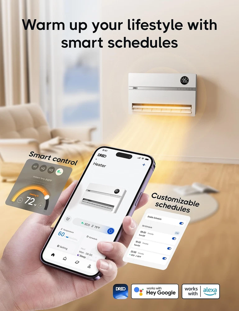 Dreo Smart Wall Heater, Electric Space Heater for Bedroom 1500W, 120° Vertical Oscillation, Adjustable Thermostat, Remote Control, 24H Timer, Easy-Mount Heater for Indoor Use, Works with Alexa, WH719S Widespread Warmth: Dreo's 120° wide oscillation heating distributes warm air evenly from top to bottom, helping to bring fast heat to every corner of your room more efficiently than regular wall-mounted heaters. Smart Control, Seamless Lifestyle: Schedule room heating hours to match your routine, access your heater settings from anywhere with the Dreo app, or even use your voice to control it thanks to Alexa and Google Home compatibility. Fast and Accurate Temperature Control: Set the room temp as you like, choose from 41 to 95°F range with an unprecedented 1°F accuracy. Dreo's PTC ceramic space heater brings fast and steady heating for an exceptional comfort experience. Ready for a Good Night Sleep: This smart heater for bedroom automatically adjust its LED panel brightness to low-light conditions, while it delivers warmth with lower noise, making sure nothing interrupts your sleep. Hassle-free Installation, Stress-free Maintenance: Get your space heater mounted easily. The package comes with all accessories including a convenient drilling guide with easy to follow steps. Keeping your wall-mounted heater like new is super convenient thanks to its reusable filter and detachable design. Heating Coverage: To ensure maximum warmth and comfort, use as a primary heat source for 200 sq. ft. areas, or up to 750 sq. ft. as a supplementary source. Check if your room has proper insulation for optimum efficiency.