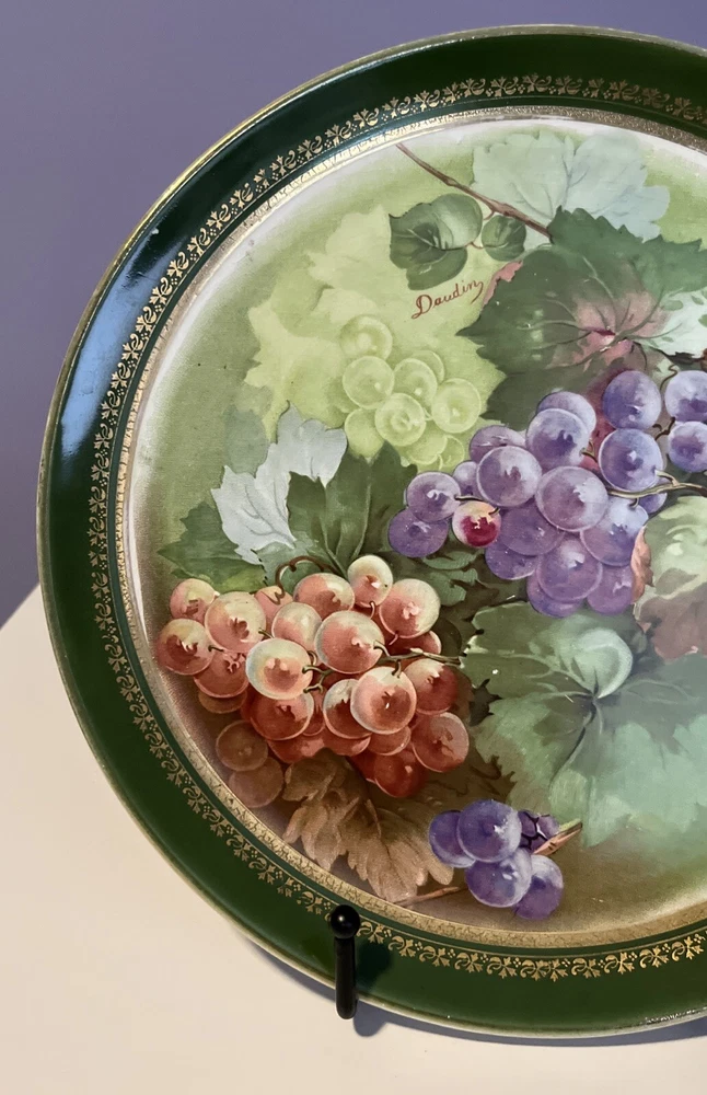 Dresden China Large Green w/ Gold Fruit or Serving Plate with Green and Purple Grapes Signed Daudin on front printed Dresden on back - Dimensions: 10.5” diameter This was in my mother’s collection purchased in 1994 from antique store. Only on display shelf or stores since purchase. Slight crazing due to age on back. Please review all pictures carefully as they are part of the description. Questions are welcome.