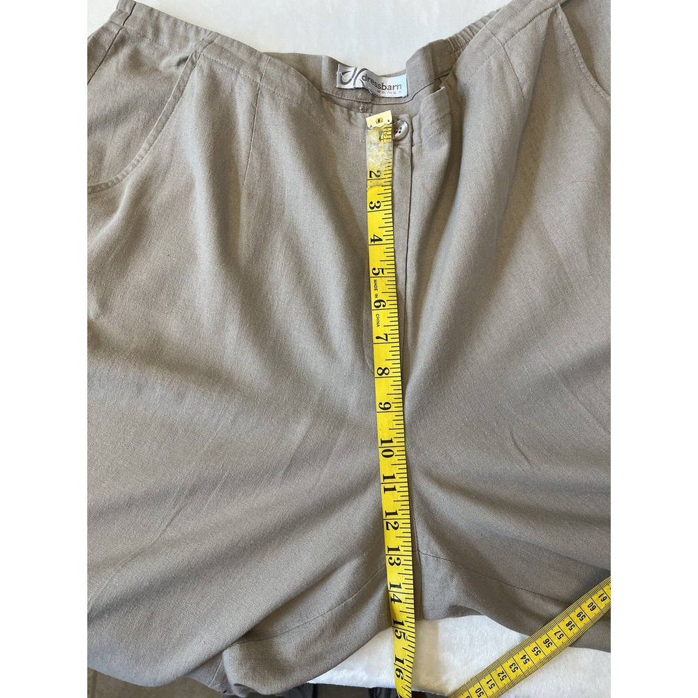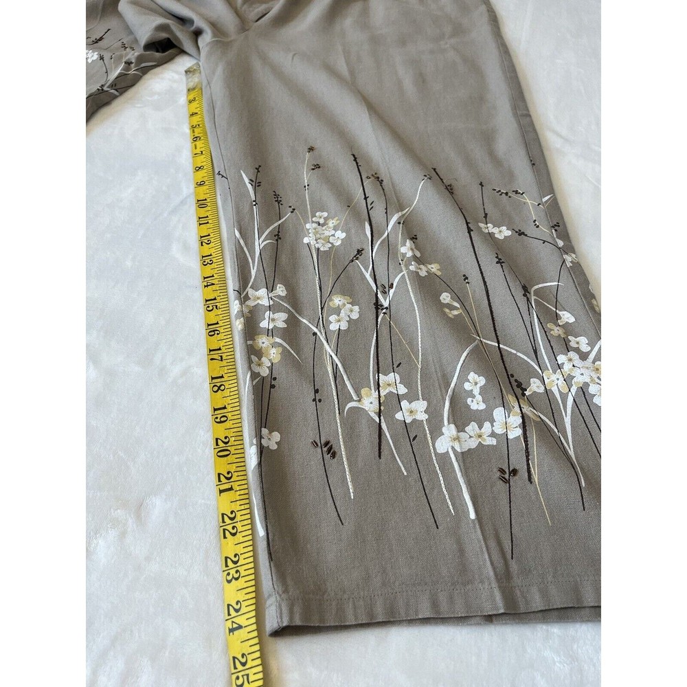 Elevate your wardrobe with these stylish Dressbarn women's khaki linen blend pants. These pants feature a beautiful floral design, a flat front, and a high rise for a flattering fit. The pull-on closure ensures comfort and ease of wear, while the cropped style with a 24.5 inch inseam and embroidered accents give these pants a chic and trendy look. Made from a blend of rayon and linen, these pants are perfect for summer, fall, and spring. With no mention of the item's condition, you can be assured that these pants are in great shape and ready to be added to your collection. Don't miss out on the opportunity to add these versatile and stylish pants to your wardrobe today.