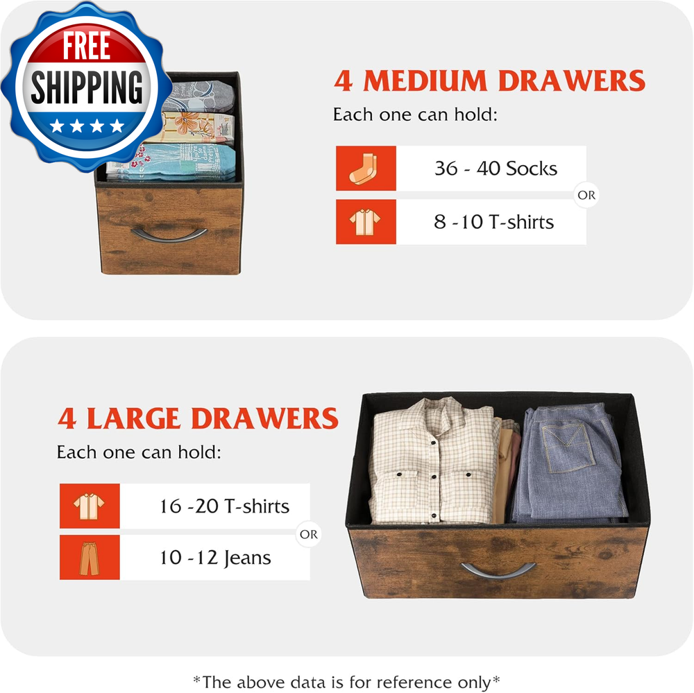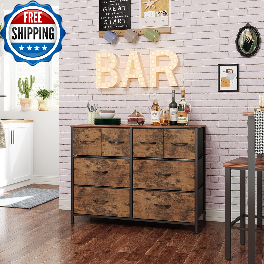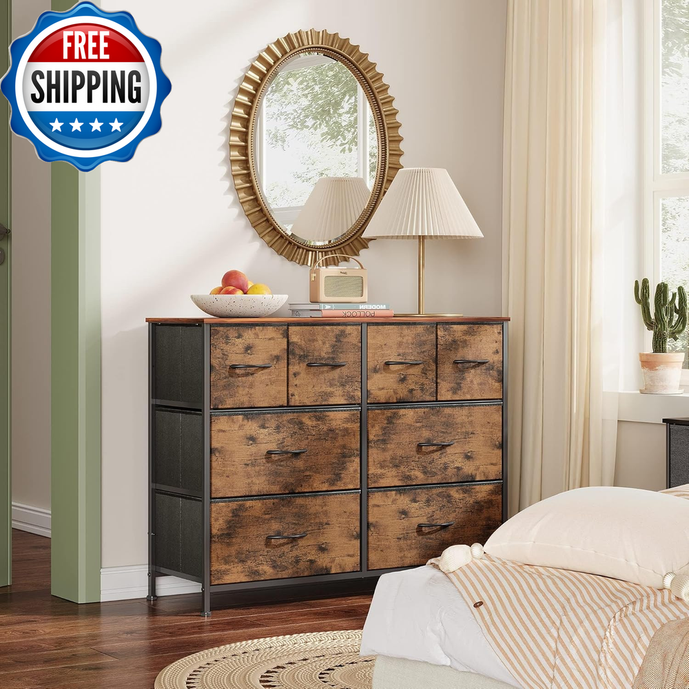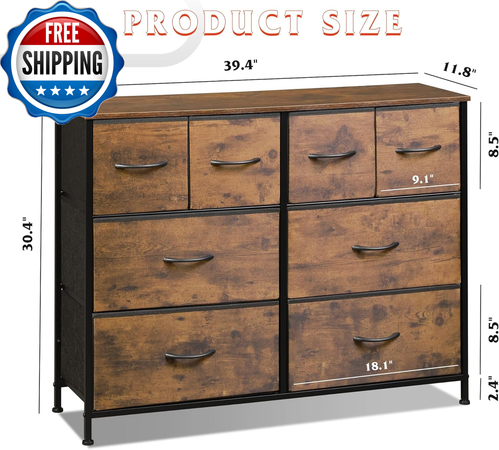 Dresser for Bedroom with 8 Drawers, Wide Fabric Dresser for Storage and Organization, Bedroom Dresser, Chest of Drawers for Living Room, Closet, Entryway, Rustic Brown Wood Grain Print Multipurpose Dresser: Match perfectly with other WLIVE storage towers; This fabric dresser is ideal for bedroom, closet, living room, hallway, dorm and office. Roomy Storage Space: The 8 foldable deep drawers are spacious and provide endless organizational possibilities. Wooden top can place things you want to display or keep in reach, such as lamp, photos… Sturdy and Durable: The bedroom dresser can also be TV stand for small-size TV; With strong steel frame, water-resistant top and high-grade fabric drawers, the dresser is designed for a long service time. Exquisite Design: Easy pull handles help open and close the drawers smoothly; 4 adjustable feet can protect your floor from scratches and are designed for uneven ground. Overall Dimension: The wide chest of drawers measures 39.4" L x 11.8" W x 30.4" H. The dresser for bedroom comes with detailed instructions and all hardware needed, it is easy to assemble. Product Description 1 Living Room 2 Bedroom 3 Hallway Comparison of products in the same color Add to Cart Add to Cart Add to Cart Add to Cart Add to Cart Add to Cart Customer Reviews 4.3 out of 5 stars 3,985 4.4 out of 5 stars 18,371 4.2 out of 5 stars 32,027 4.5 out of 5 stars 5,929 4.6 out of 5 stars 11,834 4.5 out of 5 stars 13,822 Price $65.99 $ 65 . 99 $31.99 $ 31 . 99 $52.99 $ 52 . 99 $52.99 $ 52 . 99 $62.99 $ 62 . 99 $69.97 $ 69 . 97 Overall Dimensions 39.4" L x 11.8" W x 30.4" H 17.7" L x 11.8" W x 20.9" H 39.4" L x 11.8" W x 21.7" H 31.5" L x 11.8" W x 29.4" H 31.5" W x 11.8" D x 38.1" H 39.4" L x 11.8" W x 39.5" H Number of Drawers 8 2 5 6 8 9 Wood Sideboard ✔ ✔ ✔ ✔ ✔ ✔ Open Shelf ✘ ✘ ✘ ✘ ✘ ✘ Number of Color 5 7 7 6 6 5 Item model number ASNG052DHS2 Room Type Bedroom,Hallway,Living Room,Office Number of Pieces 1 Assembly Required Yes Mounting Type Freestanding Color Rustic Brown Wood Grain Print Furniture Finish Rustic brown finish Item Weight 28.2 pounds Size 11.8"D x 39.4"W x 30.4"H(8 Drawers) Material Wood & steel & fabric Finish Type Rustic Number of Drawers 8 Style Rustic Model Name ASNG052 Fabric 3 Tier 8 Drawer Storage Cabinet / DHS2 Special Feature Adjustable,Sturdy Product Dimensions 11.8"D x 39.4"W x 30.4"H Product Care Instructions Wipe with Dry Cloth Shipping Fast shipping is very important for us. Our standard US shipping service is FREE. Your order will be shipped within 2-3 business days upon full payment received. Your order will be delivered within 2-3 business days after the handling time. We only ship to the confirmed PayPal address. We reserve the right to cancel any order for any reason at any time. We are not responsible for undeliverable addresses. Returns and payment We offer a 30 days return policy from checkout winning date. We allow only PayPal as payment method FeedBack Your feedback very important to us, after you get your package and you are satisfied with our service please leave us positive feedback If you have any problem with your order / any questions please before leave any type of feedback Please visit our eBay store to check out other items for sale! Thank you for shopping at our store.