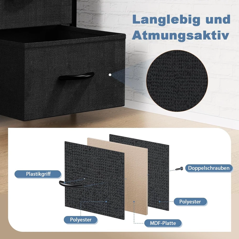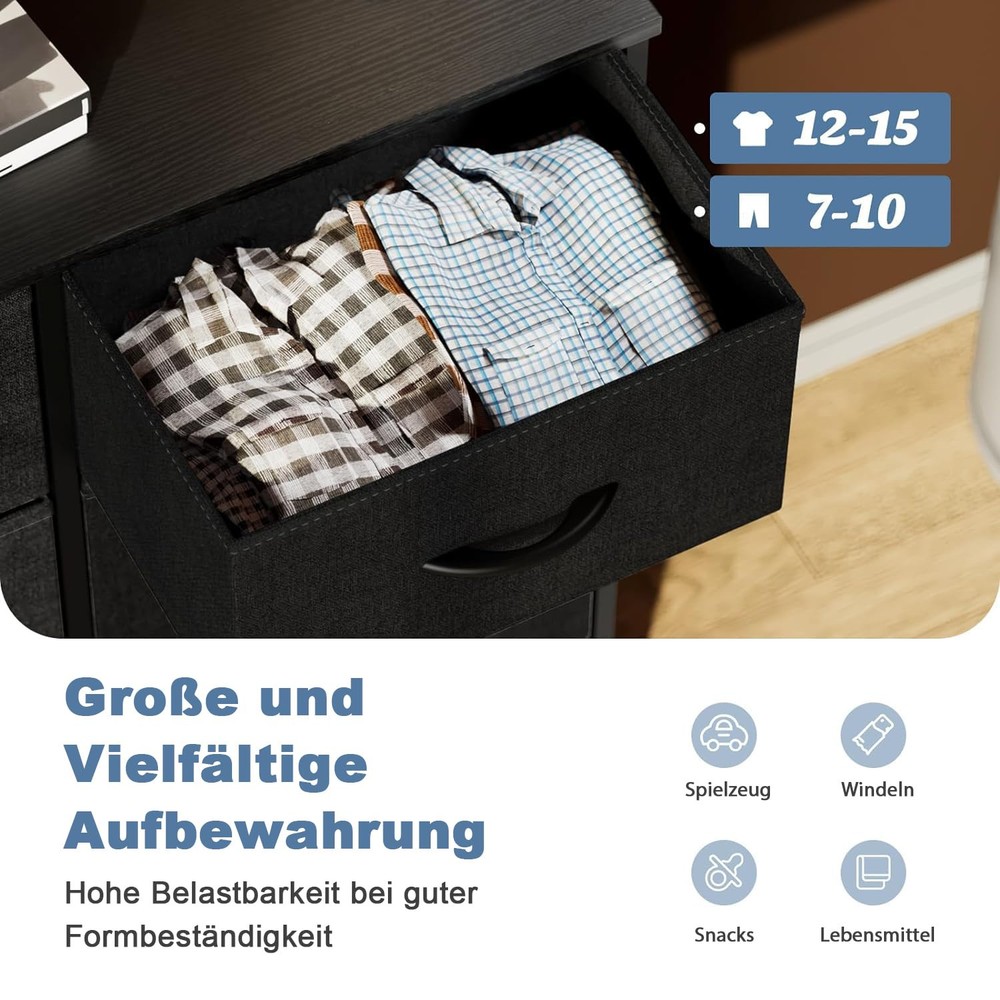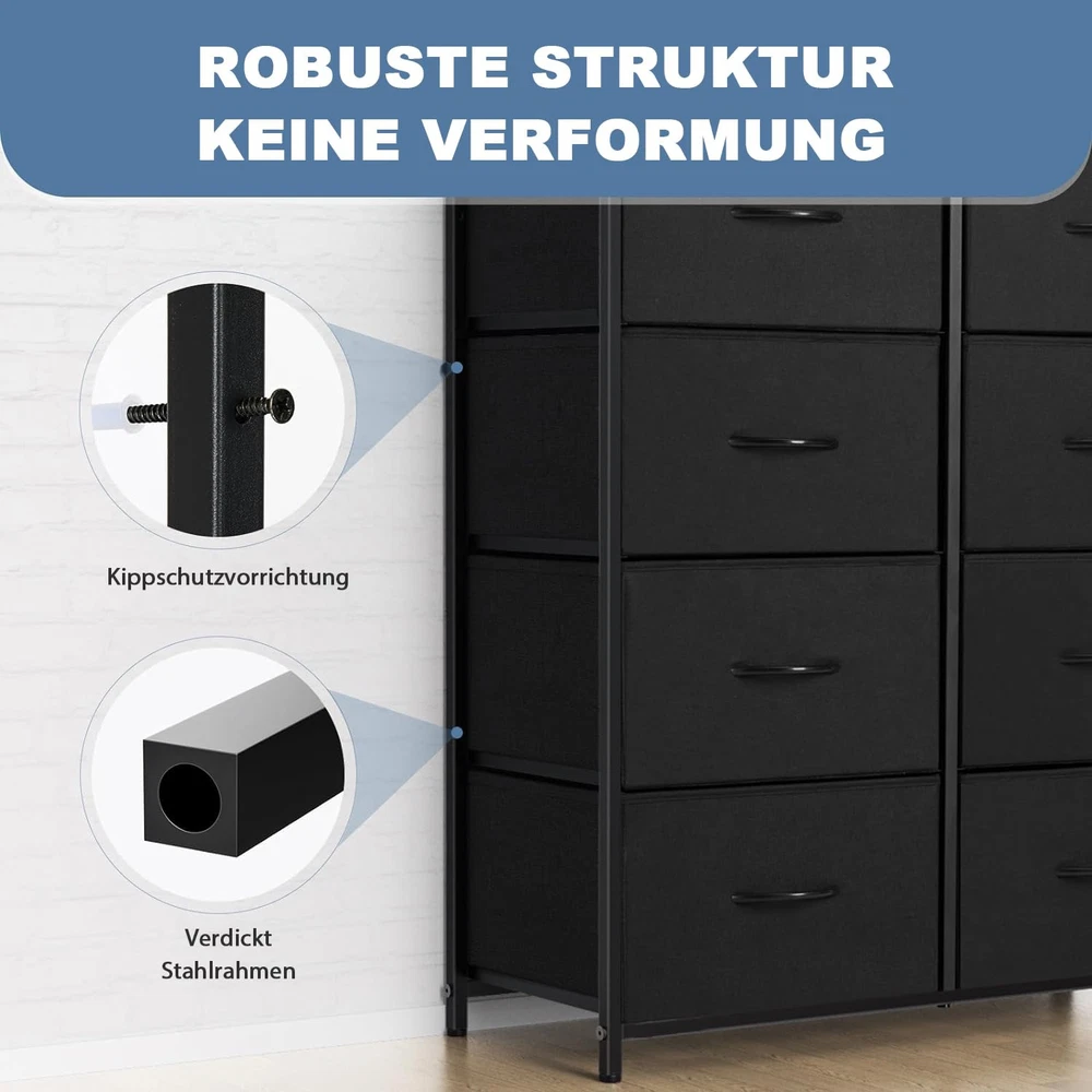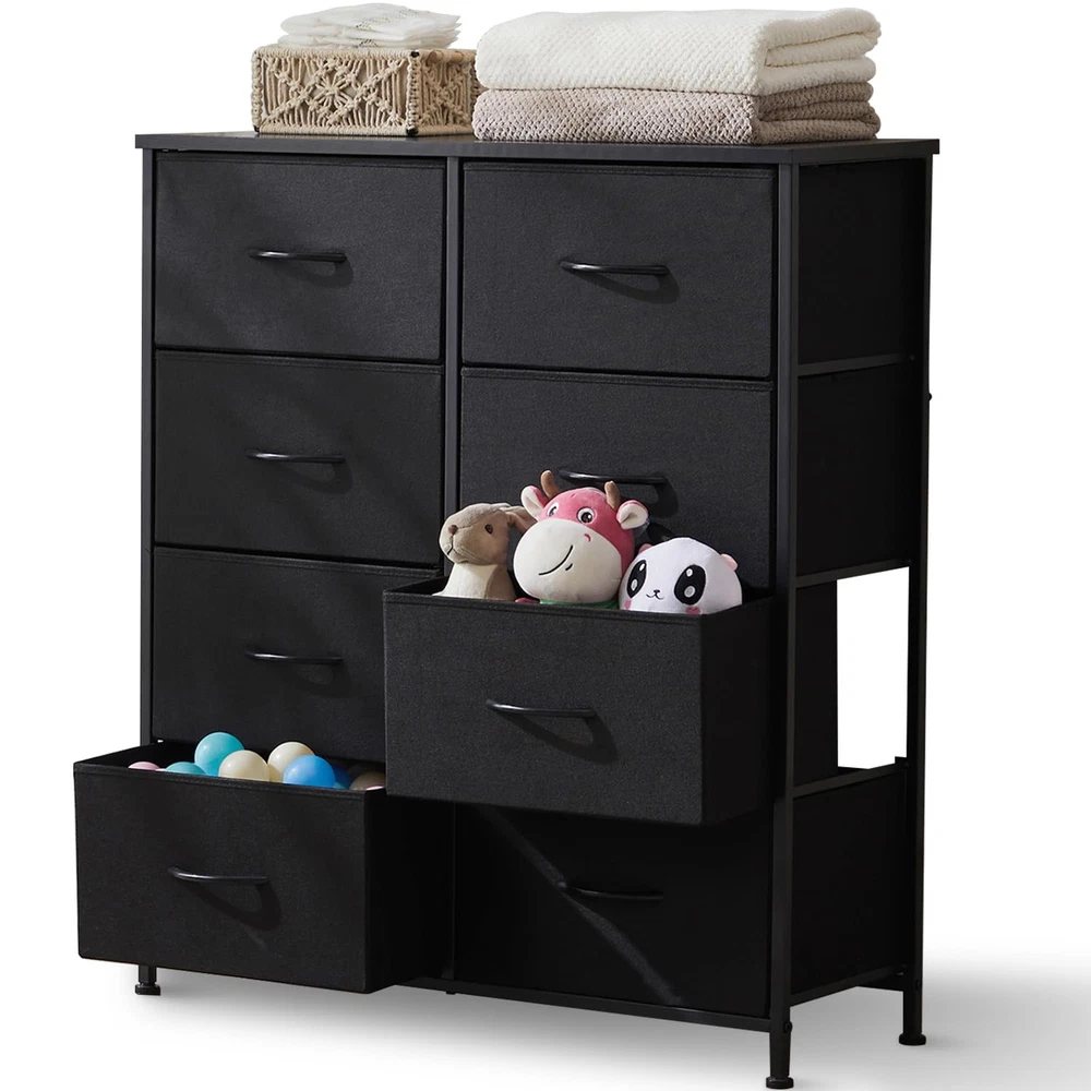Attention to the FULL-size: This bedroom dresser features fabric bins, providing space-saving storage for magazines, adult or 's clothing, , and more. The wooden top board can support up to 66 pounds and can even serve as a TV stand. Please confirm the dimensions of this 8-drawer dresser: 11.81" D x 31.4" W x 36.3" H. Plenty Storage Space: With 8 large drawers, this dresser offers generous storage capacity. You can organize your belongings neatly by dividing the compartments. Each drawer can accommodate at least 12 adult T-shirts or 7 pairs of jeans, while it's also ideal for socks, underwear, toddler toys, etc. If you have multiple dressers, they can be stacked to save space. Sturdy & Stable: This dresser is built with a sturdy metal frame to ensure stability. It is equipped with 4 adjustable feet to safeguard your floor from scratches, and you can effortlessly balance the dresser in tight spaces. Moreover, it comes with an anti-tilt device that can be utilized when mounting the dresser to the wall, preventing accidents caused by uneven floors or climbing. Versatile Use: This dresser offers versatility in its usage. It can be seamlessly integrated with your existing furniture, serving as a TV stand in the living room, a nightstand bedside table, or wardrobe in the bedroom, or a shoe cabinet in the porch, entryway, or hallway. Weighing only about 26 lbs, this lightweight fabric organizer can be effortlessly moved anywhere you desire. Quick Assembly: The package includes all the necessary installation tools, and a guide video is available on this page. By following the instructions, you can complete the assembly in approximately 38 minutes. If you have power tools of your own, the time required may be even shorter. Should you have any questions regarding the installation process or the product itself, we are here to assist you efficiently and at any time.