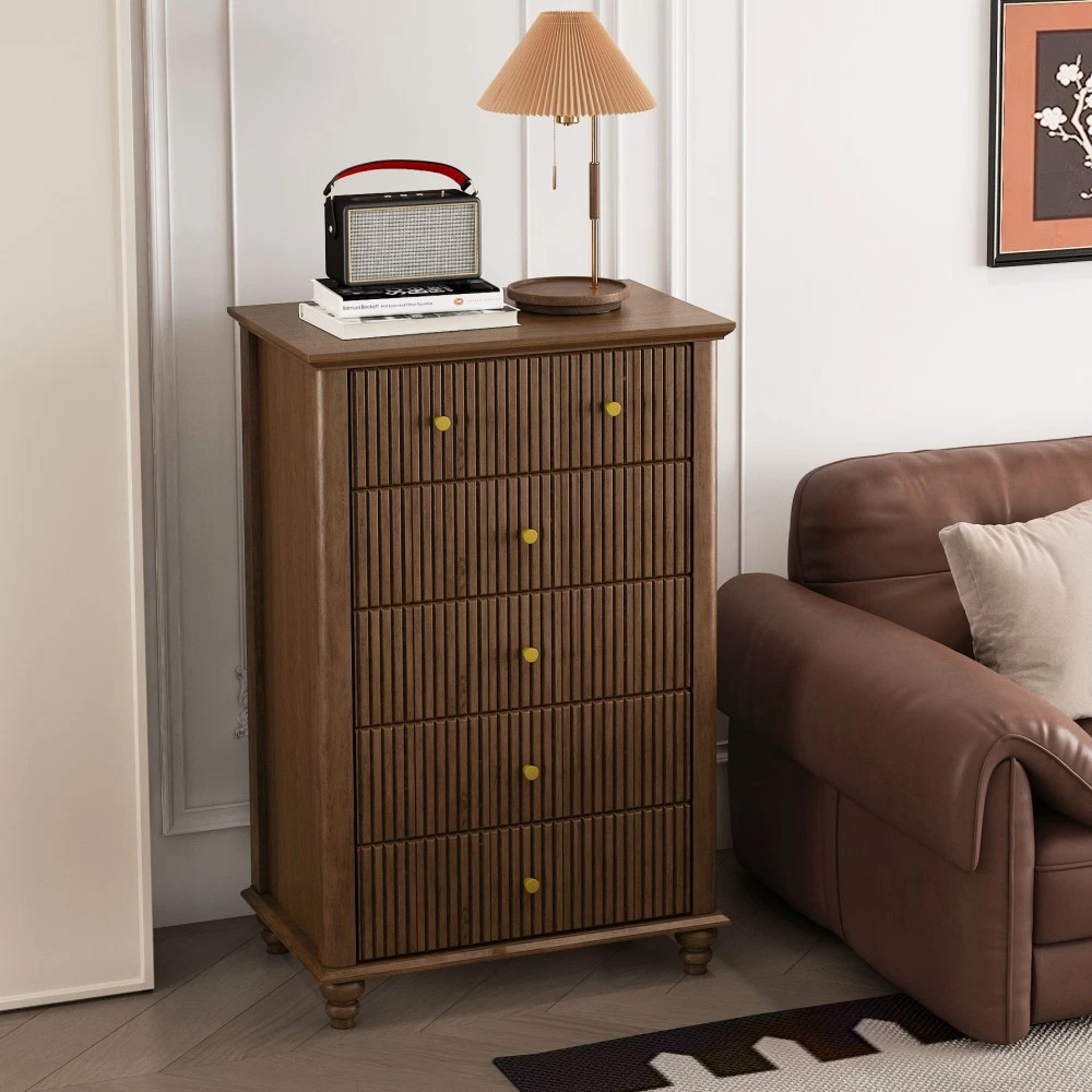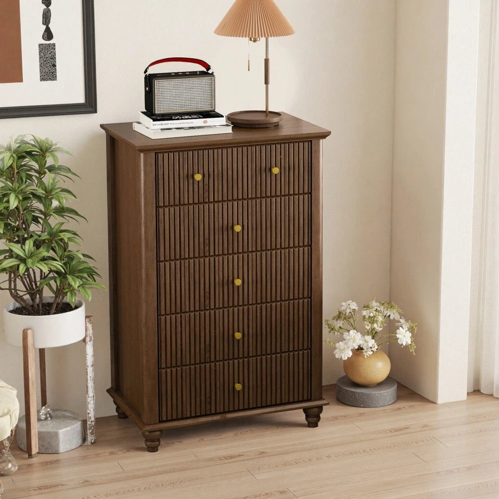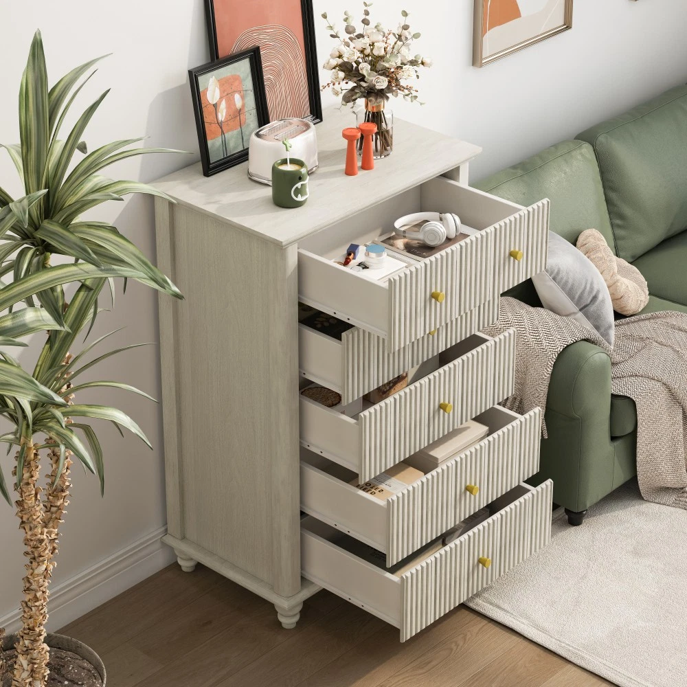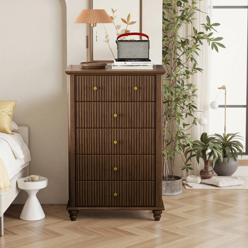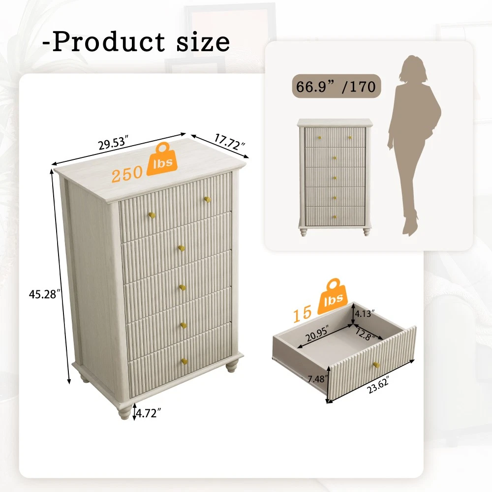 45" Fluted 5-Drawer Dresser - Modern Chest of Drawers for Bedroom/Living Room | 30-Day Free Return ✅ 1-Year Quality Warranty | 30-Day Free Return & Exchange | Two Stylish Colors Available Elevate your home storage with our Fluted 5-Drawer Dresser—where modern elegance meets unbeatable functionality. Crafted with high-quality materials and thoughtful design, this 45-inch tall chest of drawers keeps your space organized while adding a touch of sophistication to any room. Choose from warm Walnut or soft Beige to match your decor perfectly. Walnut Finish: Rich & Timeless The deep Walnut tone showcases natural wood grain details, pairing seamlessly with industrial, mid-century, or traditional interiors. It adds warmth to bedrooms and depth to entryways, making it a versatile statement piece. Beige Finish: Soft & Versatile The gentle Beige hue brings a calm, airy vibe to any space, complementing Scandinavian, modern, or coastal decor. It brightens bedrooms and blends effortlessly with living room furnishings for a cohesive look. ✨ Distinctive Fluted Design Stand out from ordinary dressers with the unique wavy fluted front—this texture adds layers of elegance and visual interest to the piece. Paired with sleek metal handles and a sturdy solid wood base, it creates a distinctive, personalized look that elevates your home’s aesthetic. The thick tabletop features natural wood grain, enhancing the dresser’s organic charm and quality feel. 💪 Premium Materials for Durability Built to last, this dresser combines high-quality MDF, pine, and rubber wood, with coated metal handles that resist scratches and wear. The smooth curved edges add a delicate touch while eliminating sharp corners—safe for families with kids and pets. Equipped with an anti-tip mechanism, it stays securely in place for added peace of mind. Each drawer holds up to 15 pounds, and the tabletop supports up to 250 pounds—perfect for heavy decor or storage. Cleaning is a breeze: simply wipe with a damp cloth and air dry. 📂 Spacious Storage for Every Need With 5 large drawers, this dresser offers ample space for clothing, personal essentials, linens, or home furnishings—say goodbye to cluttered closets and messy surfaces. The roomy tabletop is ideal for displaying photo frames, table lamps, alarm clocks, or decorative plants, turning storage into a decorative opportunity. It’s the perfect solution for bedrooms, living rooms, hallways, and entryways. 🔧 Quiet Function & Easy Assembly Smooth drawer slides ensure quiet, effortless opening and closing—no more noisy disruptions. Assembly is a cinch: each panel is clearly numbered, and we provide detailed instructions plus all required accessories. You’ll have your new dresser set up and ready to use in no time. 📐 Product & Packaging Specifications Category Specification Measurement Assembled Dresser Length 29.53 Inches Width 17.72 Inches Height 45.28 Inches Weight 98.11 Pounds Packaging Length 42.32 Inches Width 21.06 Inches Height 11.81 Inches Weight 110.23 Pounds 🛡️ Our Commitment to You We’re confident in the quality of our fluted dresser. That’s why every unit comes with a 1-Year Quality Warranty , covering any manufacturing defects. If you’re not completely satisfied with your purchase—whether it’s the color, fit, or function—take advantage of our 30-Day Free Return & Exchange Policy . Shop with total peace of mind, knowing your investment is protected. Fast Shipping to US Addresses! Each dresser is carefully packaged to ensure it arrives in perfect condition. Order today to transform your home storage.