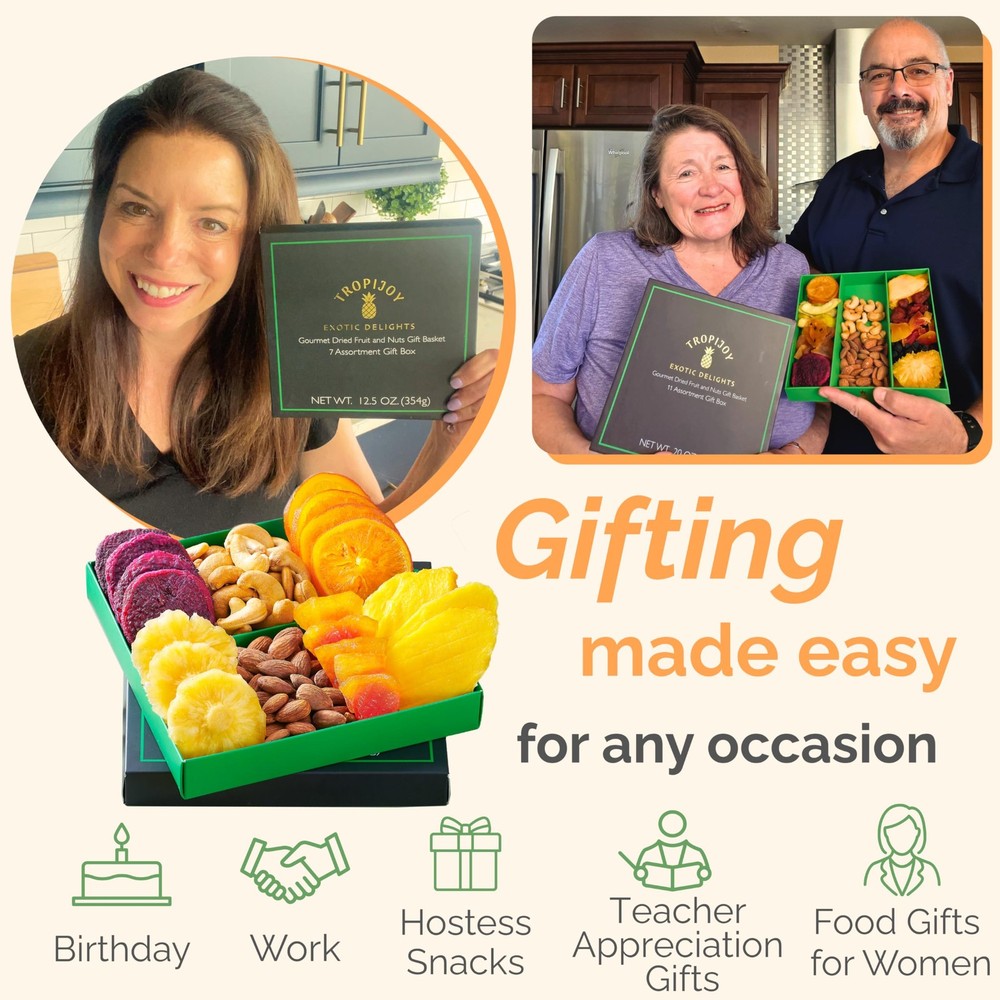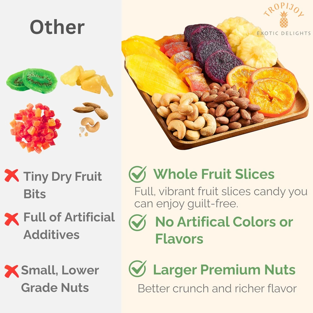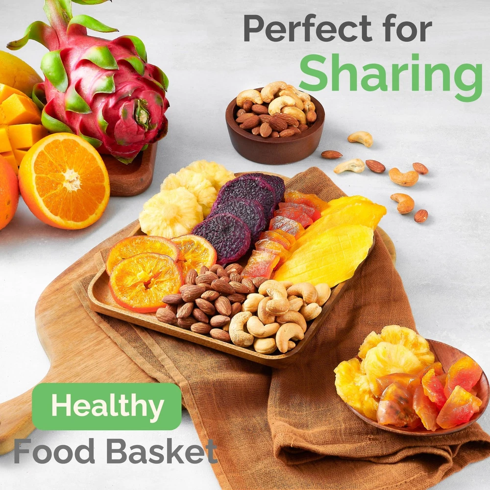Welcome to , where every box is a passport to a world of exotic flavors. Born from the rich, fertile lands of Vietnam, is more than just a dried fruit brand—it's an invitation to explore the vibrant and diverse tastes of the tropics. Indulge in the Dried Fruit and Nut Gift Baskets, featuring exotic varieties of premium dried fruit and nuts. Perfect as thank you gifts for women, anniversary gift for couple, or get well soon gift baskets for women, this healthy and flavorful fruit basket is designed to impress. 7 TROPICAL FLAVORS – Featuring dried mango, dragon fruit, pineapple, and more, this vibrant fruit basket gift offers bold flavor and natural sweetness in every bite—perfect for anyone who loves tropical fruit baskets. MADE TO CELEBRATE – Whether it’s for hostess snacks, gift baskets for women, or grandma gifts, this beautifully arranged fruit tray makes any moment more meaningful. It’s one of our top shared dried fruit and nuts gift basket. HAND-PACKED – From buttery cashews to a colorful dragon fruit and pinapple, each dried fruit gift basket is hand-assembled with care. SWEET, WHOLESOME SNACKING – A healthy food gift basket with dried fruits and nuts, including a chewy dried fruit mix, soft mango slices, and an assortment of naturally dried fresh fruit with no artificial colors—perfect for guilt-free snacking. DELIVERED FRESH, MADE PERSONAL – Brighten their day with a dry fruits gift box. Each one ships ready to enjoy, with the option to add a personalized message at checkout.