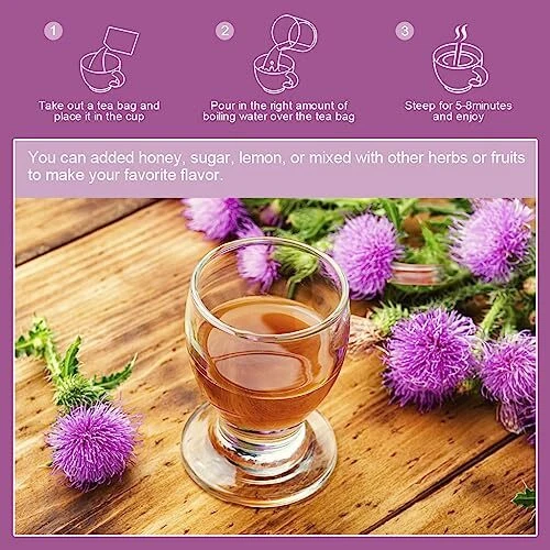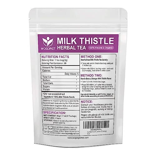 Milk Thistle Tea: Use high-quality milk thistle seeds to make tea bags, 30 tea bags, pure and additive-free. Drink milk thistle tea often is good for liver detox, improve digestion and boost immunity. Natural Ingredient: Our milk thistle tea uses natural milk thistle seeds to restore the original flavor. Caffeine-free, additive-free, non-GMO and suitable for vegan. You can enjoy a cup of warm milk thistle tea at any time. Support: Milk thistle tea has many benefits. Such as liver detox, anti-oxidation, improve digestion, boost immunity and metabolism, and so on. Taste: The milk thistle tea bags smells faintly scented with , and the tea taste good and it doesn’t taste bitter. You can added honey, sugar, lemon, or mixed with other herbs or fruits to make your favorite flavor. Steeping Methods: Add the milk thistle tea bag in the cup of 200mL boiling water and soaked in hot water for 5-8 minutes, then remove tea bags and drink it while warm. If you want to drink a stronger flavor, you can take 1-2 milk thistle tea bags and 300-400ml of water into a tea pot or pan to cook for 5-7 minutes, the obtained milk thistle tea taste will be stronger.