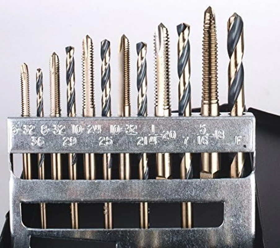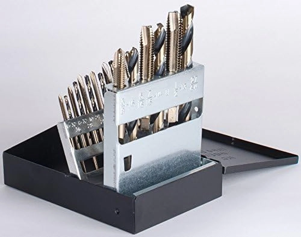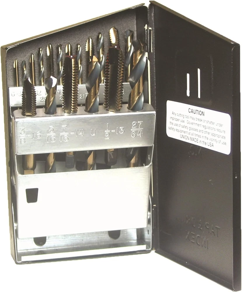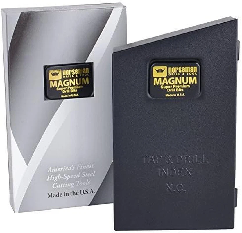 18 pc. Tap and Drill Set Premium High Speed Steel Spiral Point, NC Spiral Point NC Tap & Drill Set Contains: #36, 29, 25, 21, 7, F, 5/16, U, 27/64, 6-32, 8-32, 10-24, 10-32, 1/4-20, 5/16-18, 3/8-16, 7/16-14, 1/2-13 Set includes tap and corresponding drill bit Spiral Point Gold Oxide Plug Style Committed to Quality, Consistency, Service and Value QUALITY at Viking Drill and Tool begins with the finest tool steel we can buy and ends with the world class products in our catalog. Our cutting tools are designed, engineered and superbly crafted to provide long lasting durability. Our 74,000 square foot St. Paul, Minnesota manufacturing facility is specifically designed for the unique task of efficient high quality cutting tool manufacturing. CONSISTENCY is a natural by-product of our experience and dedication to quality. At Viking Drill and Tool, skilled machine operators working with the world's finest raw materials have the capability of providing you with consistent high quality products time after time, year after year. On our Ultra Bor Super Premium products, we routinely cut recognized tool tolerance standards by one half to insure that our customers receive drills manufactured to the tightest possible specification and utmost in consistency and accuracy. All materials used at Viking Drill and Tool meet the rigorous qualifications of National Aerospace Standard (NAS) 907. This standard, recognized as the most stringent in the industry precludes the use of lower quality steels which do not hold up under rigorous applications. The use of these extreme high quality materials insures that consistency is built in to every one of our U.S. manufactured products. Our extensive selection of U.S. manufactured tools is designed to give you the right tool at the right price for whatever tough job you come up against.