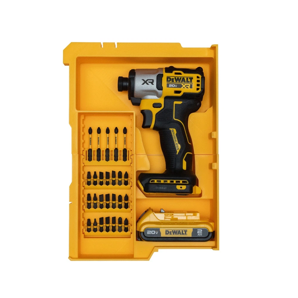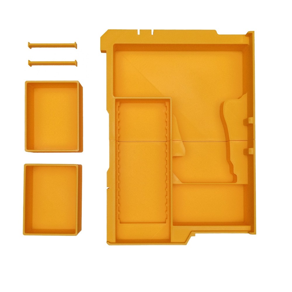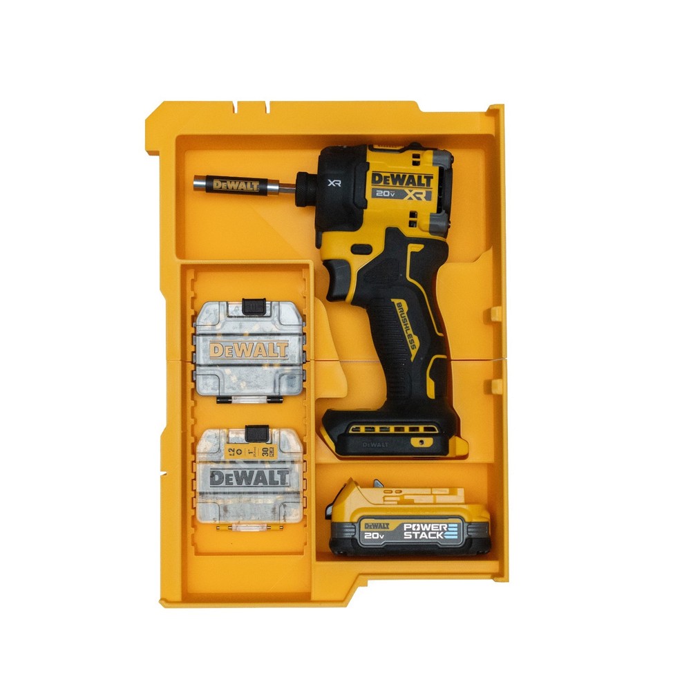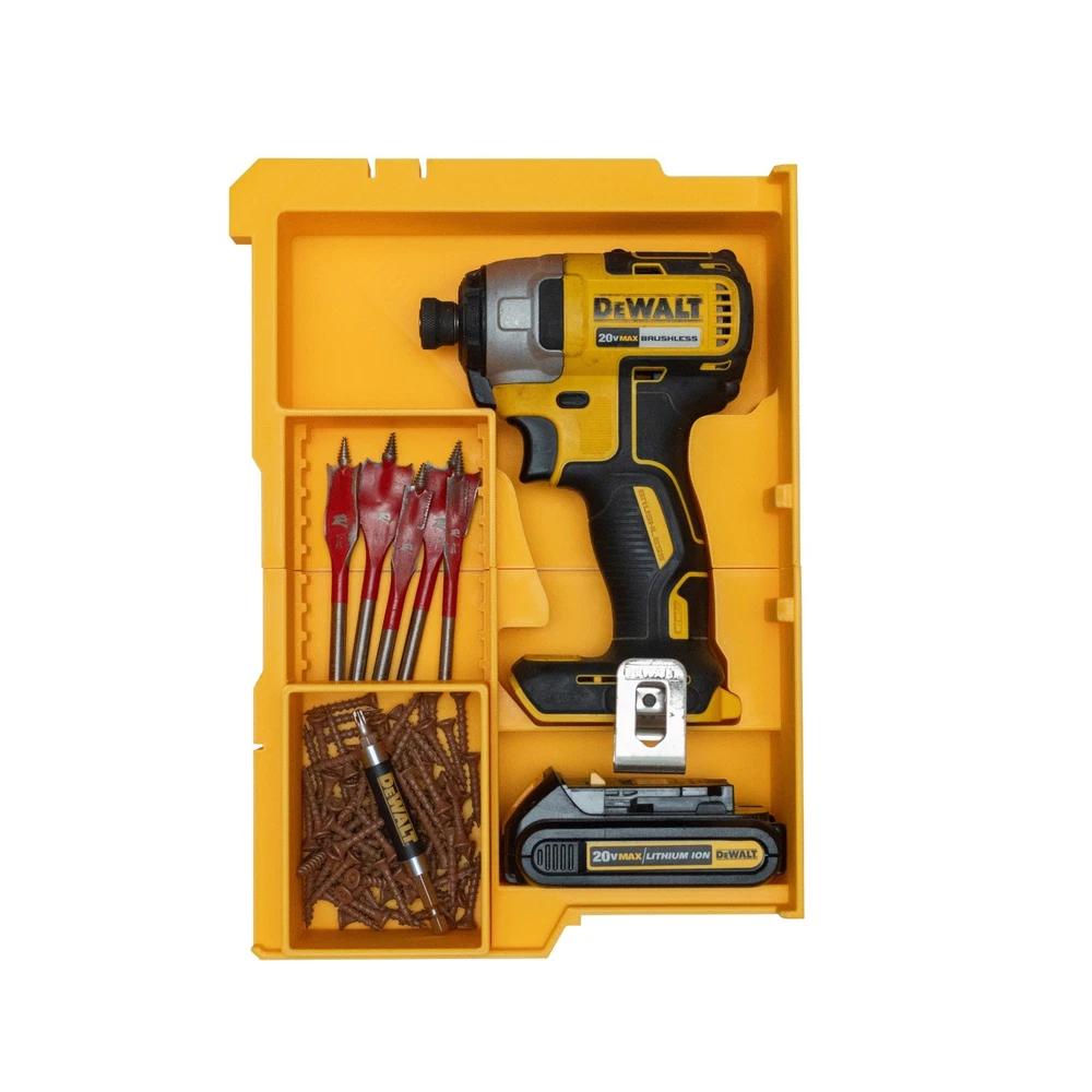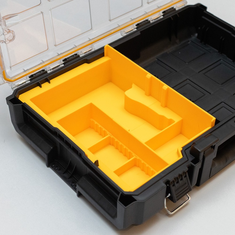 Modular insert for the DEWALT ToughSystem® 2.0 Organizer model DWST08040. The drill/driver insert is designed to fit various DEWALT drills and drivers, bits and accessories, and select 20V MAX* batteries up to 2aH. You'll no longer need to carry multiple tool cases or bags to hold all the parts you need for a job with the removable storage bins for larger bits and accessories, built-in DEWALT ToughCase®+ system storage system for sets of bit accessories, or dividers to for slimmer parts if not using the ToughCase®+ system. Includes: - One Drill/Driver Insert (Left or Right) - Two removable storage bins - Two ToughCase®+ dividers Does NOT include any tools, batteries, or bits. Tested Models: - DCD777 - DCD794 - DCD800 - DCF787 - DCF809 - DCF845 - DCF860 - DCF870 - DCF885 Does NOT fit: - DCD771 - DCD996 - DCK240C2