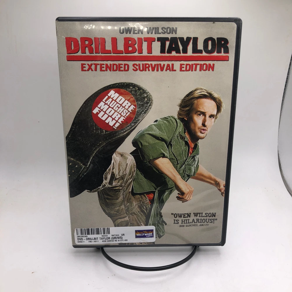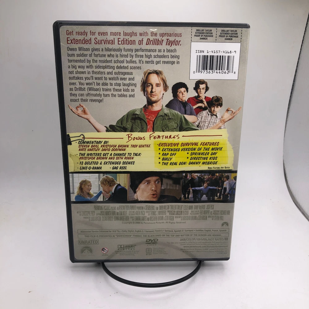 Format: DVD Actor: Owen Wilson, Leslie Mann Country/Region of Manufacture: United States Movie/TV Title: Drillbit Taylor gtin13: 0097363440628 UPC: 0097363440628 Region Code: DVD: 1 (US, Canada...) Director: Steven Brill Type: Movie Language: English Seller Notes: “Please see photos. All USED Movies will have some minor scratches and blemishes on cases.” Edition: Unrated; Extended Survival Edition Genre: Comedy Release Year: 2008 Rating: PG-13 Case Type: Tall/DVD Case
