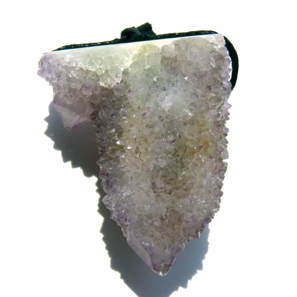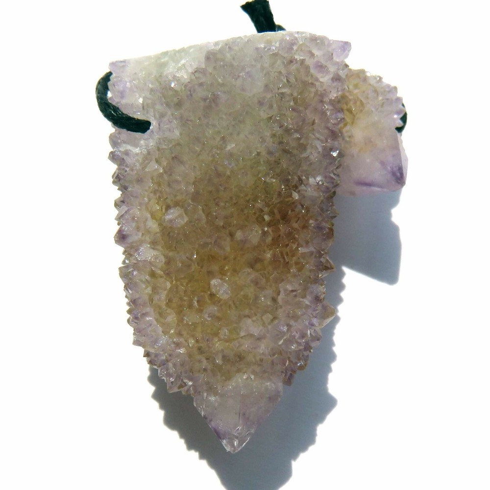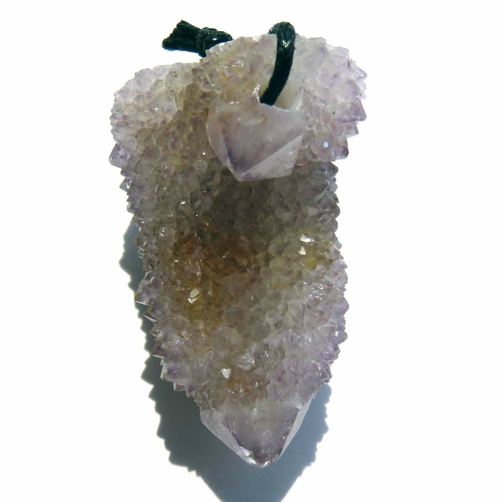 Cactus Quartz or Spirit Quartz Drilled Size Approximately 2 cm x 3 cm x 3.5 cm 20.9 g View My Other Items For Sale Visit My eBay Store Add me to your Favorite Sellers A cactus or spirit quartz is a quartz crystal that is encrusted by a second generation of smaller crystals grown on its prism faces. These crystals were first discovered in 1986 in the Magaliesberg Mountain Range near Pretoria, South Africa. Cactus quartz is formed by a quartz or amethyst crystal being encrusted by a second generation of smaller crystals grown on its faces. It occurs as quartz, citrine and amethyst, and comes in a wide range of colors, including purple amethyst, violet amethyst, smoky, milky clear and golden citrine. FAQ/Tips Crystals are priced by quality, color and size. Purple amethyst is more highly prized and will cost more for a smaller lesser quality crystal. Lavender is the most common color and where you will find the best quality/value for price Crystals change colors with changes in type angle and intensity of light. Color may also vary between monitors. Pictures were taken in bright light. We do our best to give you many views so you can judge the quality of the given crystals. If you have questions please ask before bidding or buying. Many of the crystals have special color properties: Many have phantoms, not just the ones we?ve indicated. Some have ?floating? purple tips. The placement of darker purple against purple or white crystals appears to change as the crystal is turned. Many are a mixture of citrine and amethyst. The ones called ?Golden Healers? or ?Sunshine? have a rainbow effect on crystal faces. To get combined shipping please use the shopping cart and click on request invoice. Wait until you get one from us to pay. Thank you for looking. Please check out our other items. Track Page Views With Auctiva's FREE Counter