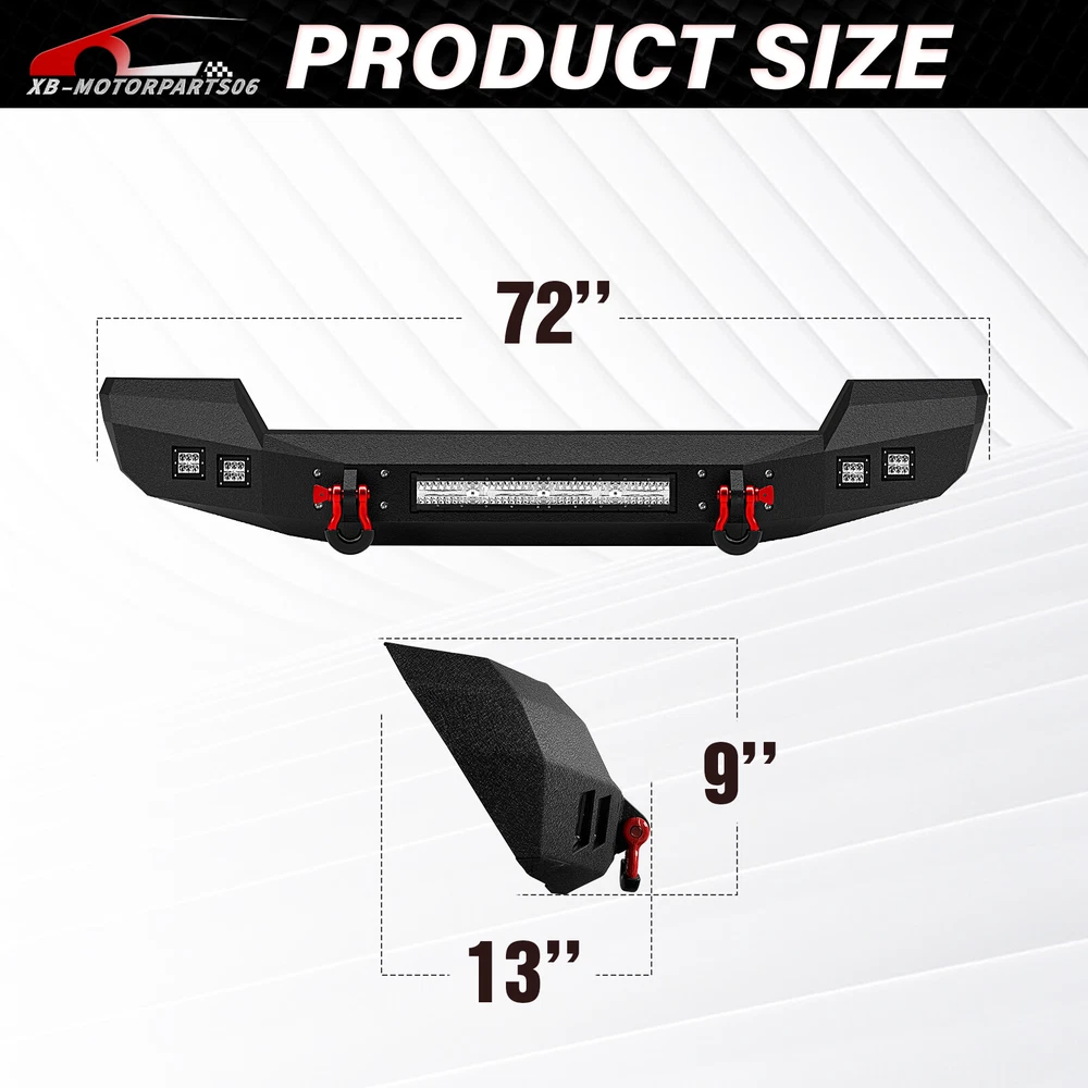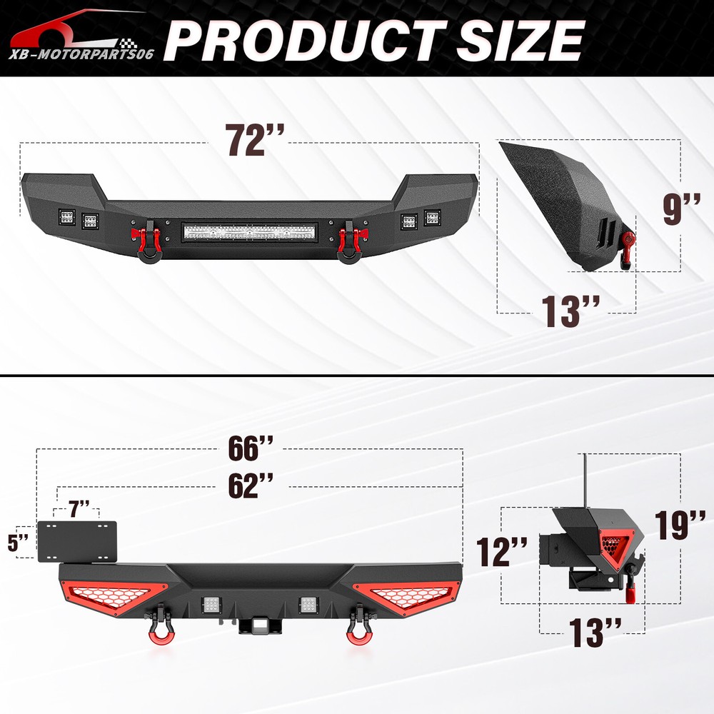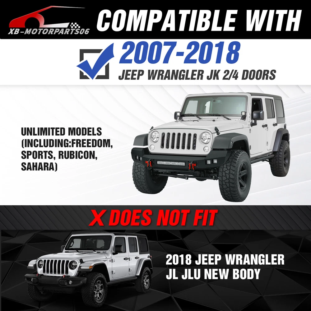 With D-rings Rear Or Front Bumper For 2007-2018 Jeep Wrangler JK JKU Unlimited Please pay attention to the product options you select: If you choose Front & Rear Bumper,You can get 1 × Front Bumper, 1 × Rear Bumper and Mounting Hardware; If you choose Only Front Bumper,You can get 1 × Front Bumper and Mounting Hardware; If you choose Only Rear Bumper,You can get 1 × Rear Bumper and Mounting Hardware; Suitable Models : Compatible with 2007-2018 Jeep Wrangler JK JKU Unlimited 2/4 Doors Package Includes : ① Front & Rear Bumper option : 1 x Front Bumper, 1 x Rear Bumper, 7 x LED Lights, 4 x D-rings, 1 x License Plate Bracket, 2" Hitch Receiver, Paintable Decor, 2 x manual, screw fittings ② Fro nt Bumper option : 1 x Front Bumper, 2 x D-rings, 5 x LED Lights, 1 x manual, screw fittings ③ Rear Bumper option : 1 x Rear Bumper, 2 x D-rings, 2 x LED Lights, 2" Hitch Receiver, 1 x manual, License Plate Frame, Paintable Decor, screw fittings Product Information : Package Dimensions : 73.23"D x 17.72"W x 16.14"H Installation mode: Bolt-On With Sensor Holes: No Steel thickness: 3mm Placement on Vehicle: Front/Rear Item Weight: Front Bumper: 72 Pounds; Rear Bumper: 65 Pounds Material: Carbon Steel Color: Black (hand measurements may have an error of 2-3 mm/0.078-0.118 in) Feature : Front bumper : ① The front bumper comes equipped with 4x 18W high-power LED spotlights and a 120W high-power LED flood spot combo light bar. It also includes 4.75-ton capacity D-rings (rated at 9500lbs.); ② Our front bumper is made of high-strength steel for durability, with a two-stage black powder coating for style and protection; ③ The package contains mounting hardware and installation instructions for a straightforward, drill-free, bolt-on installation; ④ Powder Coated, Durability, Waterproof , Rust-proof ; Rear Bumper : ① This bumper includes 4.75-ton capacity D-rings (rated at 9500 lbs.), 2X upgraded LED lights for illumination, Universal License Plate Bracket and a standard 2" receiver hitch. It offers customizable detachable decor to match your vehicle; ② High-strength steel, durable rear bumper. Textured black powder coating resists rust for long-lasting performance and appearance; ③ The package comprises mounting hardware and user-friendly installation instructions for a straightforward bolt-on installation—no drilling needed; ④ Durability, Waterproof, Rust-proof; Warranty Period :2 year Standard Shipping (FedEx Ground or FedEx Home Delivery) Will usually ship within 3 business days of receiving cleared payment Please pay attention to the product options you select: If you choose Front & Rear Bumper,You can get 1 × Front Bumper, 1 × Rear Bumper and Mounting Hardware; If you choose Only Front Bumper,You can get 1 × Front Bumper and Mounting Hardware; If you choose Only Rear Bumper,You can get 1 × Rear Bumper and Mounting Hardware; Suitable Models : Compatible with 2007-2018 Jeep Wrangler JK JKU Unlimited 2/4 Doors Package Includes : ① Front & Rear Bumper option : 1 x Front Bumper, 1 x Rear Bumper, 7 x LED Lights, 4 x D-rings, 1 x License Plate Bracket, 2" Hitch Receiver, Paintable Decor, 2 x manual, screw fittings ② Fro nt Bumper option : 1 x Front Bumper, 2 x D-rings, 5 x LED Lights, 1 x manual, screw fittings ③ Rear Bumper option : 1 x Rear Bumper, 2 x D-rings, 2 x LED Lights, 2" Hitch Receiver, 1 x manual, License Plate Frame, Paintable Decor, screw fittings Product Information : Package Dimensions : 73.23"D x 17.72"W x 16.14"H Installation mode: Bolt-On With Sensor Holes: No Steel thickness: 3mm Placement on Vehicle: Front/Rear Item Weight: Front Bumper: 72 Pounds; Rear Bumper: 65 Pounds Material: Carbon Steel Color: Black (hand measurements may have an error of 2-3 mm/0.078-0.118 in) Feature : Front bumper : ① The front bumper comes equipped with 4x 18W high-power LED spotlights and a 120W high-power LED flood spot combo light bar. It also includes 4.75-ton capacity D-rings (rated at 9500lbs.); ② Our front bumper is made of high-strength steel for durability, with a two-stage black powder coating for style and protection; ③ The package contains mounting hardware and installation instructions for a straightforward, drill-free, bolt-on installation; ④ Powder Coated, Durability, Waterproof , Rust-proof ; Rear Bumper : ① This bumper includes 4.75-ton capacity D-rings (rated at 9500 lbs.), 2X upgraded LED lights for illumination, Universal License Plate Bracket and a standard 2" receiver hitch. It offers customizable detachable decor to match your vehicle; ② High-strength steel, durable rear bumper. Textured black powder coating resists rust for long-lasting performance and appearance; ③ The package comprises mounting hardware and user-friendly installation instructions for a straightforward bolt-on installation—no drilling needed; ④ Durability, Waterproof, Rust-proof; Warranty Period :2 year