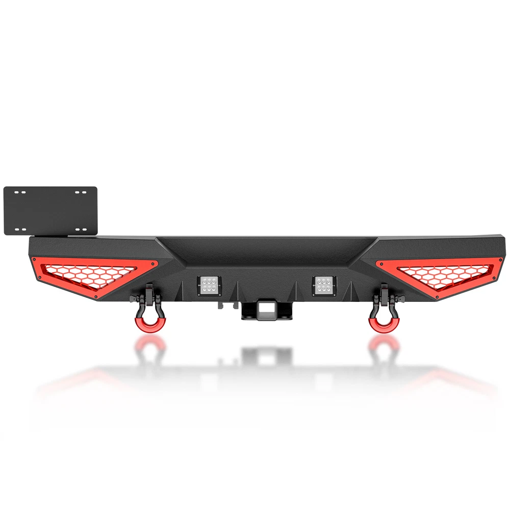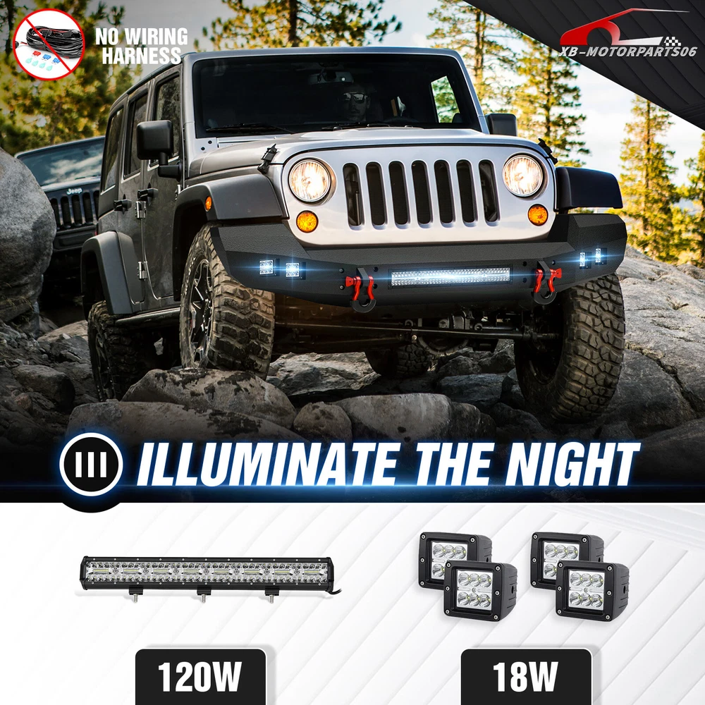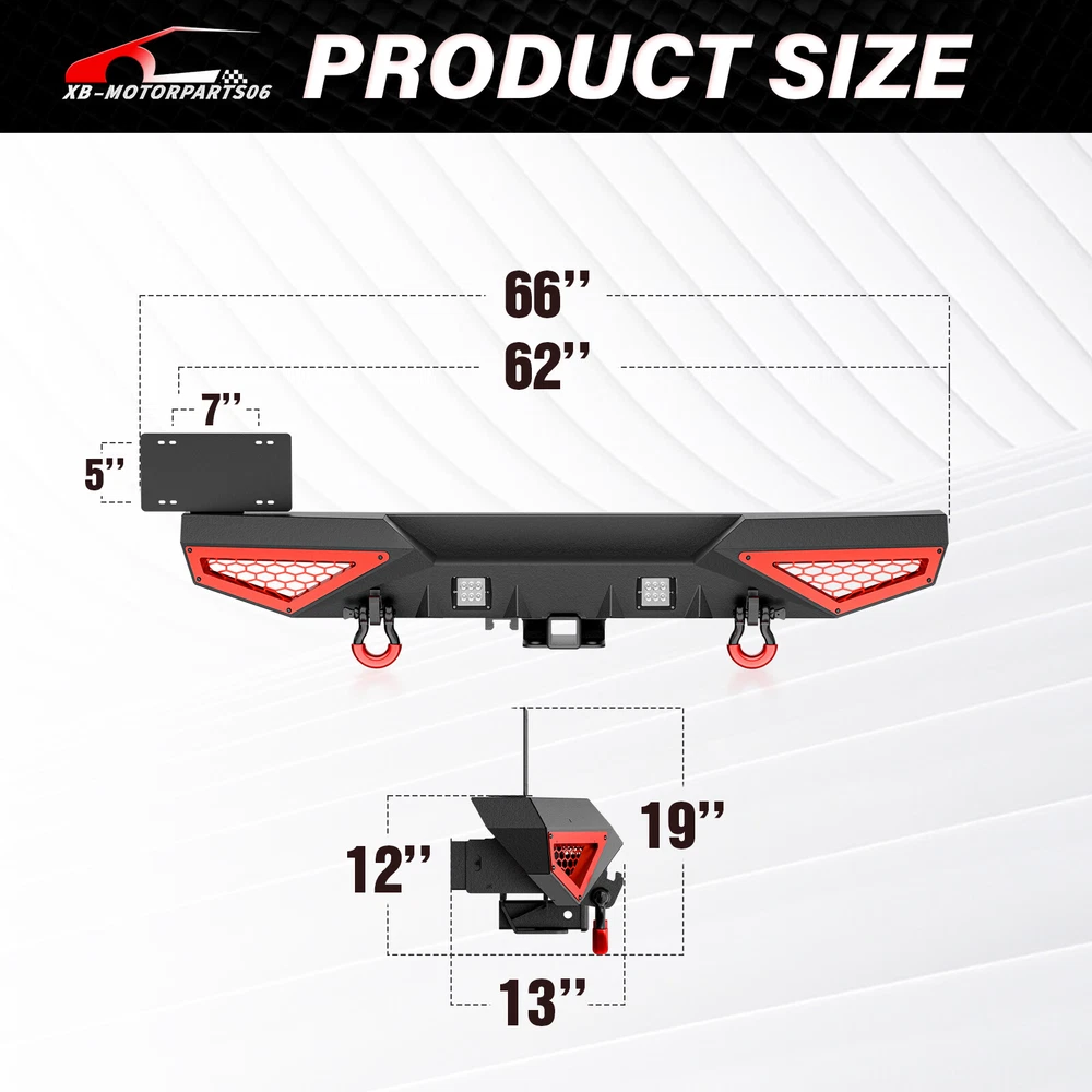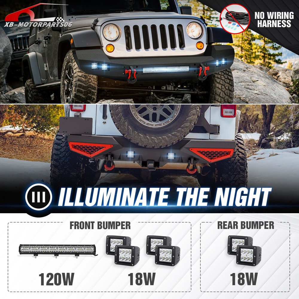 With D-rings Rear Or Front Bumper For 2007-2018 Jeep Wrangler JK JKU Unlimited Please pay attention to the product options you select: If you choose Front & Rear Bumper,You can get 1 × Front Bumper, 1 × Rear Bumper and Mounting Hardware; If you choose Only Front Bumper,You can get 1 × Front Bumper and Mounting Hardware; If you choose Only Rear Bumper,You can get 1 × Rear Bumper and Mounting Hardware; Suitable Models : Compatible with 2007-2018 Jeep Wrangler JK JKU Unlimited 2/4 Doors Package Includes : ① Front & Rear Bumper option : 1 x Front Bumper, 1 x Rear Bumper, 7 x LED Lights, 4 x D-rings, 1 x License Plate Bracket, 2" Hitch Receiver, Paintable Decor, 2 x manual, screw fittings ② Fro nt Bumper option : 1 x Front Bumper, 2 x D-rings, 5 x LED Lights, 1 x manual, screw fittings ③ Rear Bumper option : 1 x Rear Bumper, 2 x D-rings, 2 x LED Lights, 2" Hitch Receiver, 1 x manual, License Plate Frame, Paintable Decor, screw fittings Product Information : Package Dimensions : 73.23"D x 17.72"W x 16.14"H Installation mode: Bolt-On With Sensor Holes: No Steel thickness: 3mm Placement on Vehicle: Front/Rear Item Weight: Front Bumper: 72 Pounds; Rear Bumper: 65 Pounds Material: Carbon Steel Color: Black (hand measurements may have an error of 2-3 mm/0.078-0.118 in) Feature : Front bumper : ① The front bumper comes equipped with 4x 18W high-power LED spotlights and a 120W high-power LED flood spot combo light bar. It also includes 4.75-ton capacity D-rings (rated at 9500lbs.); ② Our front bumper is made of high-strength steel for durability, with a two-stage black powder coating for style and protection; ③ The package contains mounting hardware and installation instructions for a straightforward, drill-free, bolt-on installation; ④ Powder Coated, Durability, Waterproof , Rust-proof ; Rear Bumper : ① This bumper includes 4.75-ton capacity D-rings (rated at 9500 lbs.), 2X upgraded LED lights for illumination, Universal License Plate Bracket and a standard 2" receiver hitch. It offers customizable detachable decor to match your vehicle; ② High-strength steel, durable rear bumper. Textured black powder coating resists rust for long-lasting performance and appearance; ③ The package comprises mounting hardware and user-friendly installation instructions for a straightforward bolt-on installation—no drilling needed; ④ Durability, Waterproof, Rust-proof; Warranty Period :2 year Standard Shipping (FedEx Ground or FedEx Home Delivery) Will usually ship within 3 business days of receiving cleared payment Please pay attention to the product options you select: If you choose Front & Rear Bumper,You can get 1 × Front Bumper, 1 × Rear Bumper and Mounting Hardware; If you choose Only Front Bumper,You can get 1 × Front Bumper and Mounting Hardware; If you choose Only Rear Bumper,You can get 1 × Rear Bumper and Mounting Hardware; Suitable Models : Compatible with 2007-2018 Jeep Wrangler JK JKU Unlimited 2/4 Doors Package Includes : ① Front & Rear Bumper option : 1 x Front Bumper, 1 x Rear Bumper, 7 x LED Lights, 4 x D-rings, 1 x License Plate Bracket, 2" Hitch Receiver, Paintable Decor, 2 x manual, screw fittings ② Fro nt Bumper option : 1 x Front Bumper, 2 x D-rings, 5 x LED Lights, 1 x manual, screw fittings ③ Rear Bumper option : 1 x Rear Bumper, 2 x D-rings, 2 x LED Lights, 2" Hitch Receiver, 1 x manual, License Plate Frame, Paintable Decor, screw fittings Product Information : Package Dimensions : 73.23"D x 17.72"W x 16.14"H Installation mode: Bolt-On With Sensor Holes: No Steel thickness: 3mm Placement on Vehicle: Front/Rear Item Weight: Front Bumper: 72 Pounds; Rear Bumper: 65 Pounds Material: Carbon Steel Color: Black (hand measurements may have an error of 2-3 mm/0.078-0.118 in) Feature : Front bumper : ① The front bumper comes equipped with 4x 18W high-power LED spotlights and a 120W high-power LED flood spot combo light bar. It also includes 4.75-ton capacity D-rings (rated at 9500lbs.); ② Our front bumper is made of high-strength steel for durability, with a two-stage black powder coating for style and protection; ③ The package contains mounting hardware and installation instructions for a straightforward, drill-free, bolt-on installation; ④ Powder Coated, Durability, Waterproof , Rust-proof ; Rear Bumper : ① This bumper includes 4.75-ton capacity D-rings (rated at 9500 lbs.), 2X upgraded LED lights for illumination, Universal License Plate Bracket and a standard 2" receiver hitch. It offers customizable detachable decor to match your vehicle; ② High-strength steel, durable rear bumper. Textured black powder coating resists rust for long-lasting performance and appearance; ③ The package comprises mounting hardware and user-friendly installation instructions for a straightforward bolt-on installation—no drilling needed; ④ Durability, Waterproof, Rust-proof; Warranty Period :2 year