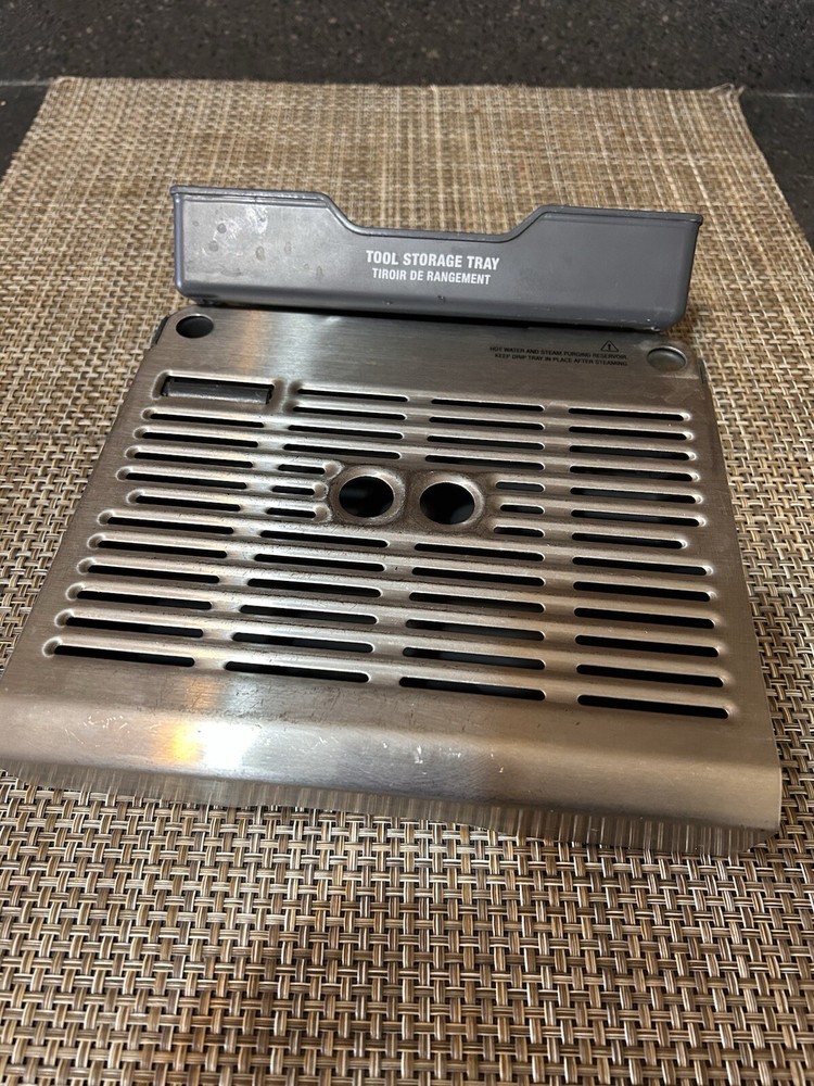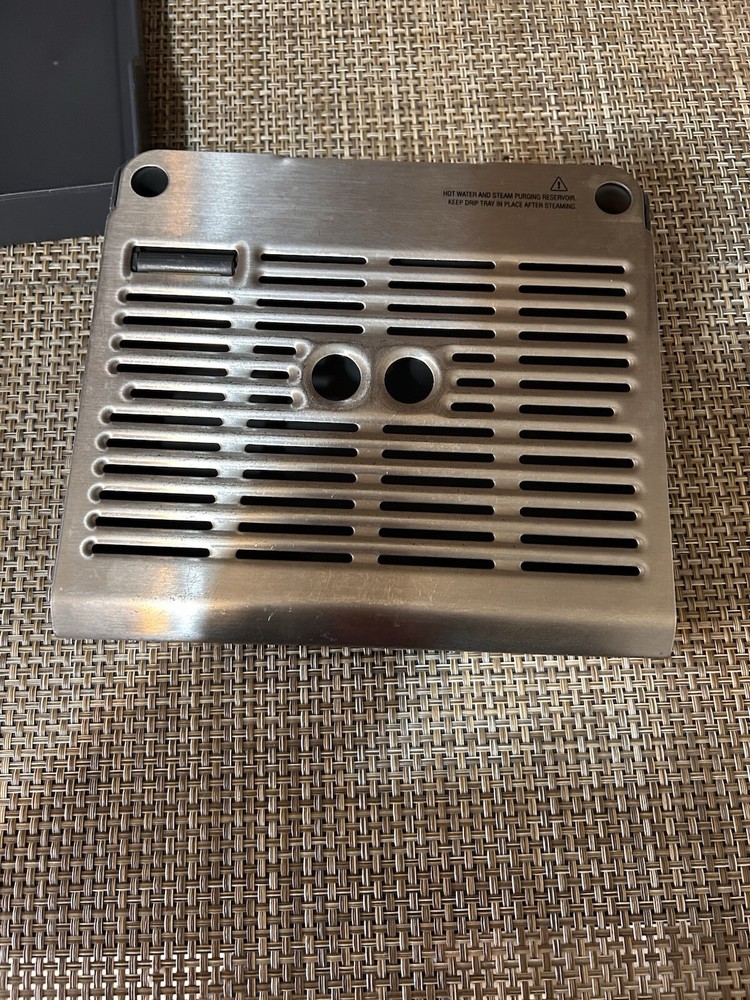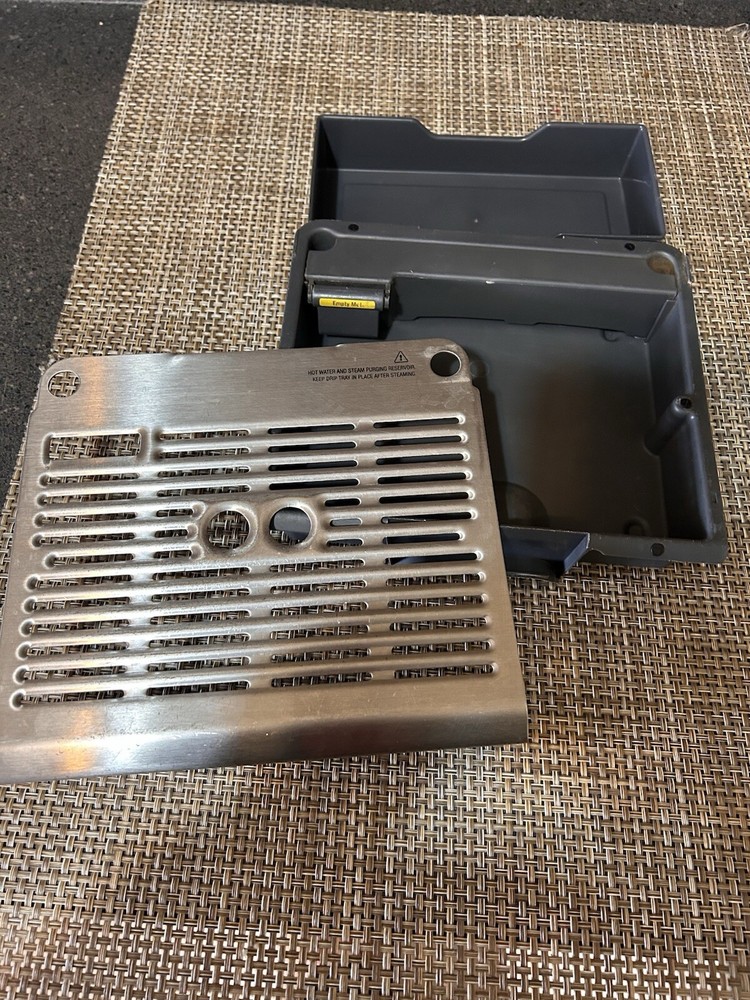 This is a used Breville drip pan and tray float, designed for the Breville 800ESXL coffee machine. It is a silver-colored replacement part that fits onto the bottom of the coffee machine. The tray float helps to catch any drips or spills from the coffee machine, and the drip pan helps to collect any excess coffee or water. This replacement part is compatible only with Breville brand coffee machines.