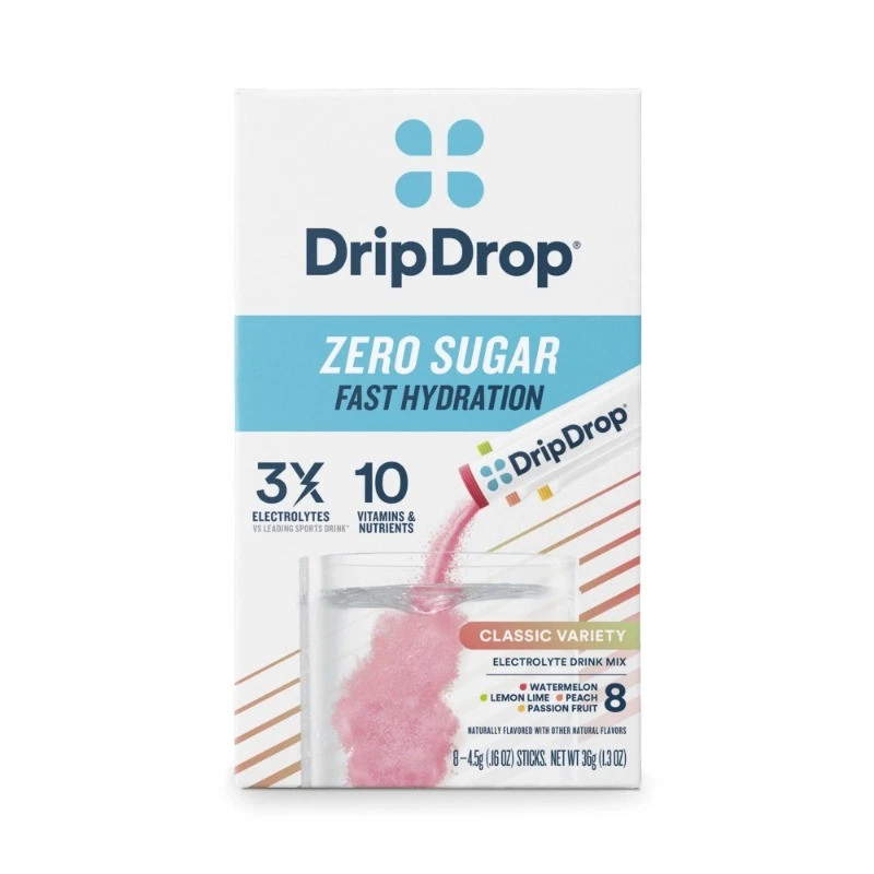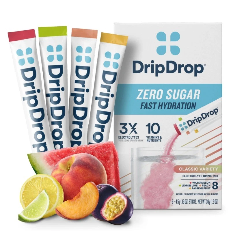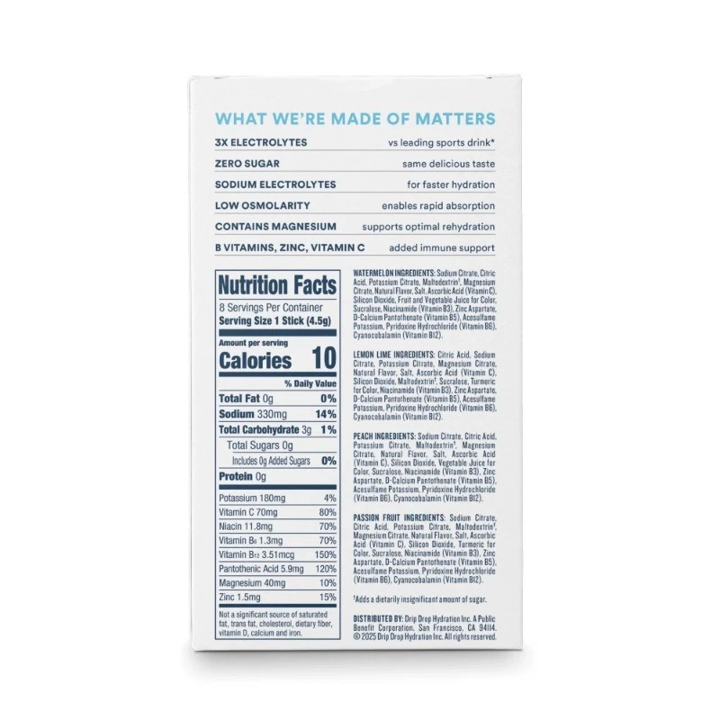 DripDrop Zero Sugar is a great-tasting, doctor-developed electrolyte powder packet that provides superior hydration that works faster and more effectively than water alone. Our Zero Sugar formula provides 3X the electrolytes of the leading sports drink. DripDrop Zero Sugar delivers precise levels of sodium electrolytes for fast fluid absorption and daily hydration health. Our formula contains essential electrolytes, including sodium, potassium, and magnesium, for fast hydration. B vitamins (B3, B5, B6, B12) for healthy energy and metabolism. Plus, vitamin C and zinc for optimized wellness and added immune support. DripDrop is fast hydration for exercise, heat, cold weather, altitude, travel, sleep and more. Loved by dietitians, nutritionists, athletes, new moms, and people on the move who want fast hydration with zero sugar. FAST & EFFECTIVE HYDRATION: Great-tasting electrolyte powder packet that delivers fast hydration more effectively than water alone 3X ELECTROLYTES & ZERO SUGAR — Our precise level of sodium electrolytes and low particle-to-solution concentration ensure fast hydration. Tasty hydration that's easy to drink and mix CONVENIENT SINGLE-SERVE PACKETS: 12 portable packets perfect for on-the-go hydration. Ideal for travel, sports activities, and daily use. Mix 1 packet into 8 oz of water for effective hydration TRUSTED BRAND WITH A MISSION: Created by a doctor, DripDrop earned a Mayo Clinic Humanitarian Award. As a Public Benefit Company, every purchase supports our mission to defeat dehydration with global donations of our product DELICIOUS FLAVOR VARIETY: Enjoy 4 flavors - Lemon Lime, Passion Fruit, Watermelon, and Peach. Fast hydration that tastes great Non-GMO, Gluten-Free, Vegan, Soy-Free, Dairy-Free and Kosher. Includes essential nutrients like potassium, magnesium, zinc, and vitamin C