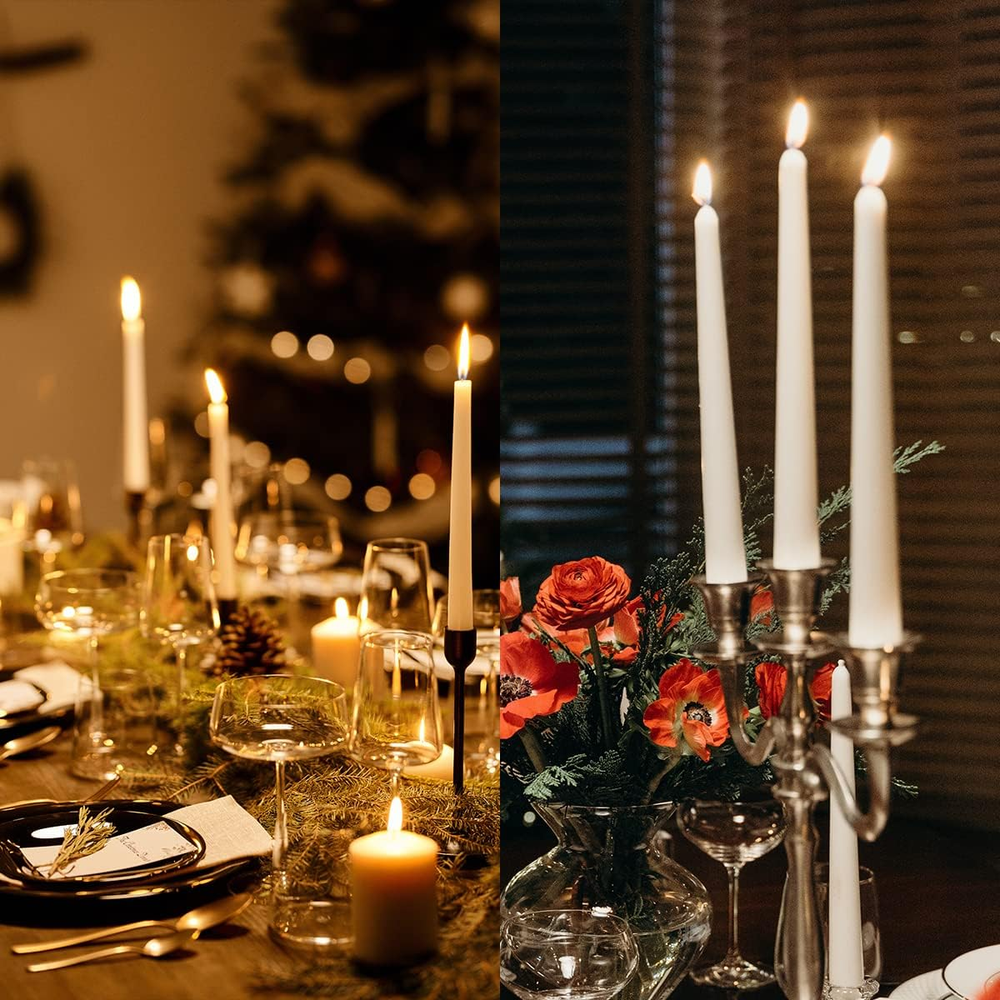 DRIPLESS TAPERED CANDLES: It's not magic, it's an ideal blend of hard wax and perfectly sized wicks. Remain dripless: Stand up vertically, not even at a slight angle. Keep away from drafts, a slight breeze could cause a flare up larger than usual. HOLIDAY SPIRIT: This long burning candles pack of 12, feature an elegant design that is perfect for setting the seasonal mood: Christmas, Thanksgiving, Kawanza. This classic look compliments any decor for restaurants, special events, or parties, A CLASSY ROMANTIC TOUCH: Spice up the romance with a candlelit dinner with your loved one. With a universal fit, they fit most candlesticks and candelabras - perfect for indoor and outdoor use. White unscented candles to avoid overpowering the moment CEREMONIAL OR TABLE LIGHT: These aroma free Shabbat candles are perfect for weddings ceremonies, holidays and religious events. Perfect for use in Synagogues and churches. Such as advent, procession, or baptismal. These tall candles make the perfect complement to intimate settings and get-togethers. They are unscented to make sure they don’t overpower the moment and burn with a soft and subtle glow.